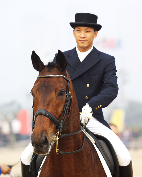 見到蔡喬時,他剛剛休假歸來,微笑著把玩自己的iphone手機,說話聲音很輕。當年一個“新兵蛋子”從老大哥手中“戰(zhàn)戰(zhàn)兢兢”奪走全國冠軍,到亞運會盛裝舞步?jīng)Q賽場上第一個出場并中國馬術(shù)隊贏得了團體銀牌的歷史性突破,80后的騎手蔡喬已經(jīng)在馬術(shù)圈里打拼了近16年,馬術(shù)也早已經(jīng)成為了他人生中最重要的一部分。 1994年,14歲的蔡喬還在省體校里。當年的七運會結(jié)束后,廣東馬術(shù)隊的部分老隊員退役了,需要補充部分新人。經(jīng)過層層篩選,最終留下了包括蔡喬在內(nèi)的三個人(這當中還有后來一直和他并肩作戰(zhàn)的黃焯欽)?!爱敃r我比其他人都年輕,但身體柔韌性比較出色,更容易轉(zhuǎn)型,教練選中了我?!辈虇陶f:“那會兒覺得騎馬很新奇,有意思,潛意識里也就喜歡上了這項運動?!眮淼今R術(shù)隊后,蔡喬才第一次開始接觸馬。年輕人總有“初生牛犢不怕虎”的勁兒,刷了一個星期的馬之后,蔡喬就開始上馬訓練。訓練循序漸進著,蔡喬的過人天賦也逐漸顯露出來。但中間也有一些小“花絮”至今讓他記憶猶新?!澳且淮慰墒墙o我摔慘了?!弊鳛槿珖谲?,蔡喬回憶起自己第一次從馬上掉下來的情景時還是有些不好意思,“當時已經(jīng)訓練了一段時間,感覺自己的馬術(shù)技巧應該不錯了,結(jié)果一個不注意就掉了下來。這一跤摔得我夠嗆,不過也讓我明白了想練好馬術(shù)真不是一天兩天的事兒?!?/div> 在黃村基地訓練一陣子后,1996年,雖然廣東隊資金很緊張,但還是給馬術(shù)隊聯(lián)系了國外的馬場,并出機票讓他們走出去“鍍鍍金”。蔡喬的第一站是到法國,在這里,蔡喬最開心的事情就是每天可以騎很多匹馬?!澳菚r候,廣東隊每天只能騎一匹馬,因為馬匹的數(shù)量就是根據(jù)運動員的數(shù)量來引進的,一人一匹。”蔡喬說:“在法國,教練并不是每天都來給我言傳身教,他也是職業(yè)騎手,需要出去打比賽。所以基本上給我安排好一些訓練科目后,除非有時間才會過來給我指點指點。我記得當時每天除了自己的訓練之外,還要騎6匹馬,通過與不同的馬匹進行溝通,對我的基本功是一個極大地提高,讓我受益匪淺?!彪S著蔡喬的技術(shù)越來越好,教練也開始讓他騎一些更好的馬,幫助馬場調(diào)教馬匹,體現(xiàn)了教練對蔡喬的認可。從法國學成后,又在瑞典訓練了一段時間,蔡喬回到了國內(nèi)參加了1997年的全運會,他隨廣東隊一起取得了盛裝舞步團體第四。 2001年,蔡喬第一次站在了盛裝舞步團體的冠軍領(lǐng)獎臺上,也從那屆全運會開始至今,廣東隊連續(xù)取得了三屆全運會盛裝舞步的團體冠軍。蔡喬說:“最難忘的當然要算十運會了,因為那次和好朋友黃焯欽都取得了好成績,很激動?!辈虇毯忘S焯欽是同時從省業(yè)余體校被選進廣東馬術(shù)隊,多年一起生活和訓練結(jié)下了深厚友誼,那一屆全運會他們除了拿到團體第一外,黃焯欽還拿了個人第一名,他則拿了個人第二名。 馬術(shù)比賽的關(guān)鍵是馬,運動員要花很長的時間才能與馬建立起感情。在長期的訓練和比賽中,蔡喬也和戰(zhàn)馬結(jié)下了不解之緣。蔡喬說:“我平常騎馬一個小時,還需要花些時間做準備。一開始要刷馬,把馬弄干凈,護理好它,這就得花上一個小時;訓練完后,我要為馬洗澡,做好清潔工作,也需要一小時的時間。在比賽的時候,雖然只有短短的7分鐘,但是準備工作卻花去好幾倍的時間,比如要到馬房給馬扎辮子、清潔以及熱身等,而自己則得換衣服、看路線等?!?/div> 亞運會賽場上,蔡喬第一個出場,而他的坐騎是整個大會最年長的“八面玲瓏”。說起自己的馬,已經(jīng)在一起并肩6年多的“八面玲瓏”,蔡喬說:“從全運會到亞運會,‘八面玲瓏’和我配合默契,而且互相都了解得非常透徹。不過他已經(jīng)18歲了,相當于人類70歲的年齡了,身體各方面都在走下坡路,我覺得它已經(jīng)到該退休的年紀了?!泵鎸Σ贿h的2013年全運會,蔡喬很希望自己能遇到一匹適合自己的馬,“每個人都有自己的性格和脾氣,馬也一樣,我希望能盡快找到一匹能和自己融洽相處的馬,這樣能更好地備戰(zhàn)比賽。” 去年,由蔡喬、黃焯欽、顧兵和劉麗娜組成的中國隊,在亞運會馬術(shù)比賽項目上第一次摘得銀牌,實現(xiàn)了歷史性的突破。談到這枚銀牌,蔡喬說:“這次奪得這枚銀牌很開心,畢竟取得了歷史性突破,而且大家備戰(zhàn)得比較辛苦。在此之前,中國馬術(shù)隊的最好成績,是在2002年釜山亞運會上取得的銅牌。因此,這枚盛裝舞步團體銀牌意義自然不言而喻。而且這也是我和‘八面玲瓏’第一次參加的國際性比賽?!碑斕毂荣?,隊里要求蔡喬第一個上場,他說:“當時隊里給我的任務就是要穩(wěn)定發(fā)揮,分數(shù)不要太低,給其他隊員以信心。”盛裝舞步團體賽需要每個隊伍出四人,成績最好的三人計入全隊成績,決出團體賽名次。結(jié)果,蔡喬一上來就拿了64.389分,為中國隊能最終取得成績上的突破埋下了伏筆。雖然最后中國隊還是以0.166分的微弱之差輸給了韓國隊,與金牌失之交臂,但這種經(jīng)歷也給運動員們重新認識了比賽。蔡喬說:“作為一名優(yōu)秀的馬術(shù)運動員,水平高低固然重要,但更重要的是心理素質(zhì)。特別在大型比賽中,一名優(yōu)秀的運動員只有具備良好的心理素質(zhì)才能發(fā)揮出水平?