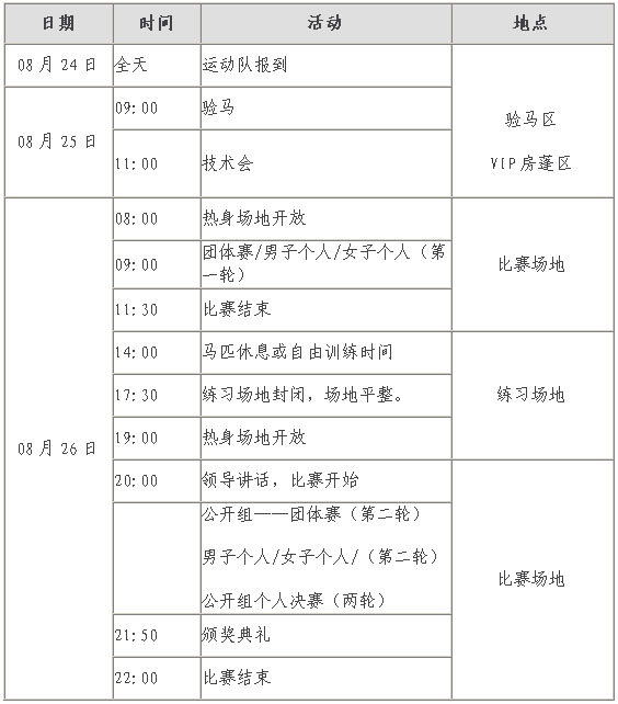 各參賽隊(duì): 現(xiàn)將2012年全國(guó)繞桶冠軍賽(達(dá)拉特旗站)參賽事宜通知如下。 一、比賽日期和地點(diǎn) 比賽日期調(diào)整為2012年08月25-26日,比賽地點(diǎn)為鄂爾多斯達(dá)拉特旗市政廣場(chǎng)。 二、報(bào)到地點(diǎn) 鄂爾多斯達(dá)拉特旗市政廣場(chǎng)——比賽場(chǎng)地。 三、收費(fèi)標(biāo)準(zhǔn) 組委會(huì)負(fù)責(zé)為每個(gè)參賽隊(duì)提供2個(gè)標(biāo)準(zhǔn)間(共4個(gè)床位)的住宿費(fèi)用。其它費(fèi)用各隊(duì)自理。 相關(guān)收費(fèi)標(biāo)準(zhǔn)如下: (一)住宿費(fèi):客房260元/單間(兩人間) (二)馬廄費(fèi):由組委會(huì)免費(fèi)提供臨時(shí)馬廄 (三)草料費(fèi):100元/捆。 四、其它 (一)各代表隊(duì)人員及騎手報(bào)到后,必須遵守大會(huì)安排的訓(xùn)練時(shí)間和場(chǎng)地進(jìn)行訓(xùn)練。 (二)驗(yàn)馬請(qǐng)攜帶中國(guó)馬術(shù)協(xié)會(huì)馬匹護(hù)照。如沒(méi)有,請(qǐng)于抵達(dá)賽區(qū)前向中國(guó)馬協(xié)申請(qǐng)辦理。 五、賽事接待 接待處:李可為 電話:13401043080 馬房部: 徐文魁 電話:15847072156 二〇一二年八月二十一日 |