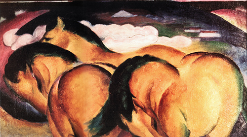 弗朗茨·馬克(1880-1916) 小黃馬,布面油畫 私人藏品 馬克的作品及他同時(shí)代藝術(shù)家的作品,從一個(gè)側(cè)面反映了20世紀(jì)初紛繁復(fù)雜的社會(huì)現(xiàn)象,特別是青騎士團(tuán)隊(duì)成員們的畫作。青騎士是指德國一群創(chuàng)造抽象風(fēng)格表現(xiàn)主義作品的藝術(shù)家,該組織由瓦西里·康定斯基(1866-1944)和弗朗茨·馬克于1911年在慕尼黑創(chuàng)立,此派成員還有克利和奧格斯特·馬克,青騎士是當(dāng)時(shí)前衛(wèi)藝術(shù)運(yùn)動(dòng)的代名詞,對(duì)現(xiàn)代藝術(shù)的發(fā)展產(chǎn)生了深遠(yuǎn)影響。 馬克出生在德國慕尼黑,他的父親是一位風(fēng)景畫畫家。在馬克結(jié)束了大學(xué)文化課的學(xué)習(xí),并完成為國家服兵役的義務(wù)后,他成功考入慕尼黑美術(shù)學(xué)院。1903年,他前往法國巴黎旅行,在那里結(jié)識(shí)了一群印象派畫家,并被他們的創(chuàng)作風(fēng)格所深深吸引。1910年,他與畫家奧格斯特·馬克成為好友,并受奧格斯特·馬克的影響開始對(duì)野獸派畫風(fēng)著迷。接下來的日子里,他一直苦心鉆研展現(xiàn)動(dòng)物特有形態(tài)的作品的創(chuàng)作,這也是他創(chuàng)立青騎士組織并多次展覽動(dòng)物畫作的初衷。正當(dāng)他的繪畫事業(yè)如日中天時(shí),他突然被召喚至戰(zhàn)場(chǎng)服兵役,在第一次世界大戰(zhàn)中不幸犧牲。馬克想尋求一種脫離了傳統(tǒng)形式的藝術(shù)表現(xiàn)手法,對(duì)動(dòng)物惟妙惟肖的刻畫成為了他在創(chuàng)作中產(chǎn)生更多成熟想法的標(biāo)志。在馬克的很多作品中,就可以看到以大自然為背景的馬匹們生動(dòng)地呈現(xiàn)在你的眼前,這位畫家對(duì)馬匹無盡的熱愛可見一斑?!缎↑S馬》就是馬克的代表作之一,畫面中鮮亮的色彩搭配,充滿立體感的細(xì)節(jié)描繪,展現(xiàn)了一位畫家對(duì)畫作中靈魂“人物”的深刻的感情。 |