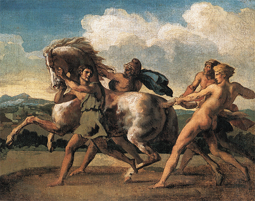 泰奧多爾·席里柯(1791-1824) 奴隸與馬的較量,布面油畫(huà)。 私人藏品 泰奧多爾·席里柯(1791-1824)出生在法國(guó)諾曼底,是19世紀(jì)初期法國(guó)浪漫主義畫(huà)派的先驅(qū),他的眾多代表作均以馬為主角??梢哉f(shuō),在法國(guó)這樣一個(gè)終日氳氤著香水氣味的城市,畫(huà)家的成長(zhǎng)會(huì)更為精致。作為頗有經(jīng)濟(jì)頭腦的法學(xué)家的兒子,18歲的席里柯中學(xué)畢業(yè)后即進(jìn)入當(dāng)?shù)刂?huà)家卡爾·維爾內(nèi)的畫(huà)室,不覺(jué)間決定了一生的事業(yè)。而與父親的期望恰恰相韙,這似乎是不可違拗的天才的命運(yùn)。 通常,純?yōu)樗囆g(shù)的藝術(shù)家總是貧困的,然而席里柯卻擁有一個(gè)富足的家庭,并不為金錢(qián)煩惱。年輕時(shí),他是一名兢兢業(yè)業(yè)、嚴(yán)謹(jǐn)教學(xué)的美術(shù)老師,可惜他的才華并沒(méi)有得到校方和學(xué)生的認(rèn)可。心中對(duì)藝術(shù)的渴望,讓他毅然決然離開(kāi)了課堂,選擇去巴黎留學(xué)。留學(xué)期間,他很幸運(yùn)地在凡爾賽宮汲取靈感,開(kāi)始了自己的創(chuàng)作之路。偶然的一次機(jī)會(huì),他發(fā)現(xiàn)了凡爾賽宮皇家馬廄,自幼就喜愛(ài)馴馬表演的他很快就被這里所深深地吸引,也獲得了有關(guān)馬匹解剖及馬術(shù)行為學(xué)方面的專業(yè)知識(shí),從此與馬結(jié)下了深深的緣分。 席里柯畫(huà)馬的作品達(dá)千幅,他在用自己的方式表達(dá)對(duì)馬的癡愛(ài)。然而,他一生與馬相伴的生活并未持續(xù)多久,慢性結(jié)核的病痛無(wú)情地吞噬著他日漸衰退的體力和精力。緊接著,這種痛苦在一次騎馬訓(xùn)練中終結(jié),他不幸墜馬身亡,享年33歲。 《奴隸與馬的較量》的創(chuàng)作靈感,來(lái)源于席里柯 1816 年之后的生活經(jīng)歷。那一年,拿破侖在法國(guó)發(fā)動(dòng)的戰(zhàn)爭(zhēng)宣告失敗,面對(duì)處于戰(zhàn)亂中的故鄉(xiāng),他選擇了離開(kāi),并在意大利羅馬定居。在羅馬,他領(lǐng)略到了異國(guó)風(fēng)情的魅力,也平生第一次觀賞到羅馬狂歡節(jié)中著名的表演項(xiàng)目“裸馬賽會(huì)”(指沒(méi)有騎手參與的賽馬活動(dòng))。壯觀的表演場(chǎng)面再次激發(fā)他創(chuàng)作了一系列以“表現(xiàn)人類與馬之間力量與控制”為主題的畫(huà)作,這幅作品就是當(dāng)時(shí)具有代表性的主題創(chuàng)作。畫(huà)作于 1817 年面世,是席里柯早期的成名作品。它直觀清晰地表達(dá)了歐洲原始部落的奴隸掌控馬匹的方式,還借助富有張力的躍馬動(dòng)作和奴隸們生動(dòng)的造型,間接地使讀者身臨其境地感受到畫(huà)家在創(chuàng)作畫(huà)作時(shí)的動(dòng)蕩不安、沉郁苦悶的內(nèi)心世界。 |