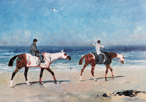 雷內(nèi)·布蘭斯托(1844-1914) 在海邊漫步的賽馬,布面油畫 私人藏品 布蘭斯托出生在法國(guó)吉倫特省的利布爾納市。雖然他的家庭富裕,擁有自己的城堡和莊園,但他卻在出生不久后被診斷為聾啞人,喪失了正常的聽說能力。只是這并沒有使布蘭斯托意志消沉,經(jīng)過多年的勤奮努力,他在繪畫和雕塑方面頗有建樹,尤其以動(dòng)物為主體的畫作而出名。1865年,他就讀于皇家美術(shù)學(xué)院繼續(xù)深造。1868年,他成功展出了自己的繪畫作品藝術(shù)沙龍。 這幅畫作為我們展現(xiàn)的是兩個(gè)年輕人騎著賽馬在海邊練習(xí)比賽的場(chǎng)景,從畫作的色彩及構(gòu)圖不難看出,布蘭斯托對(duì)色彩的把握精準(zhǔn)到位,且表現(xiàn)技法自由、流暢?!对诤_吢降馁愸R》畫作的誕生有其獨(dú)特的歷史背景:19世紀(jì)中期,賽馬是歐洲的第一運(yùn)動(dòng),法國(guó)的賽馬風(fēng)潮也一度在國(guó)內(nèi)盛行,法國(guó)的藝術(shù)家們更是從不同的角度充分發(fā)揮靈感和想象力,各種以賽馬為主題的優(yōu)秀作品不斷問世。 賽馬果然能做到與人類心靈相通,不僅受到藝術(shù)家的鐘愛,更被馬主們看作比生命更重要的家人,紅蘭姆的故事就向我們印證了這一點(diǎn)。紅蘭姆是英國(guó)的一匹賽馬,每年4月的第一個(gè)星期六,在英國(guó)利物浦安翠賽馬場(chǎng)上都會(huì)舉行英國(guó)國(guó)家大賽,它被稱為世界上最艱苦、偶然性最大的馬術(shù)比賽。紅蘭姆曾在 1973年、1974年和1977年獲得過3次英國(guó)國(guó)家大賽的冠軍,對(duì)于連續(xù)奪冠幾率不到2%的賽事來說,紅蘭姆創(chuàng)造了一個(gè)前所未有的奇跡。同時(shí)成為了英國(guó)人家喻戶曉的明星,被評(píng)為英國(guó)最佳運(yùn)動(dòng)員,這是英國(guó)有史以來唯一獲得這項(xiàng)殊榮的動(dòng)物。 它所帶給我們的震撼還不僅于此。7歲時(shí),它腿骨受傷,被牽到馴馬師邁凱恩面前時(shí)已經(jīng)一瘸一拐。出租車司機(jī)出身的邁凱恩每天把“紅蘭姆”帶到海灘上去訓(xùn)練,在海水的浸泡中它的傷勢(shì)竟然漸漸好轉(zhuǎn),直到它迸發(fā)出驚人的力量,在賽場(chǎng)上連續(xù)奪魁,贏得了所有英國(guó)人的敬仰。中央電視臺(tái)主持人蔡猛到英國(guó)轉(zhuǎn)播國(guó)家大賽時(shí)曾經(jīng)采訪過邁凱恩,交談中邁凱恩說了一句話令人印象深刻:“有人說紅蘭姆死了,我看起來悲傷得像是死了妻子,可是英國(guó)有 2500 萬婦女,而紅蘭姆卻只有一個(gè)?!豹?dú)一無二的“紅蘭姆”成了英國(guó)國(guó)家大賽的旗幟。 |