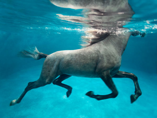 Vanessa von Zitzewitz 的攝影事業(yè)起步于1991 年, 當(dāng)她剛從位于法國巴黎的帕森設(shè)計(jì)學(xué)院畢業(yè)后不久,這位德國攝影師就很快獲得了巨大的成功。她的作品細(xì)致入微,品質(zhì)較高,贏得了許多諸如Cartier、Graff 和Boucheron 等奢侈品牌的青睞, 也曾為CarlaBruni、Mick Jagger、Luciano Pavarotti 和Monica Bellucci 等名人拍過照片。 她擁有一身在陽光下曬過的小麥色皮膚,一頭淡黃色的濃密頭發(fā),炯炯有神的雙眸,精通多國語言,做事雷厲風(fēng)行且富有魅力,Vanessa無疑是一位綻放在上流社會(huì)的漂亮女人。然而,她卻曾像法國圣西爾軍校學(xué)生一樣在布列塔尼荊棘叢生的荒野中艱難地長途行軍。她還曾以人道主義者的身份游歷世界,通過拍攝作品,至今仍在救助300多名曼谷的孤兒。因其付出的努力,2008 年,她受到聯(lián)合國教科文組織的頒獎(jiǎng)。 11 歲時(shí),Vanessa 就迷戀上了騎馬,開始參加馬術(shù)比賽。但是直到2010 年,她才開始用相機(jī)記錄有關(guān)馬的一切。承蒙卡塔爾埃米爾Sheikh Hamad bin Khalifa Al-Thani 及其女兒兼伊斯蘭藝術(shù)博物館館長的恩準(zhǔn),Vanessa 得以有幸前往Al Shaqab 農(nóng)場的馬廄拍攝優(yōu)良的純種阿拉伯馬。十九世紀(jì),卡塔爾人在Al Shaqab 這個(gè)地方打敗了土耳其人并脫離了奧斯曼帝國的統(tǒng)治,該農(nóng)場是為了紀(jì)念這場重大戰(zhàn)役而得名。Vanessa 應(yīng)邀拍攝了《卡塔爾的馬——Al Shaqab農(nóng)場的傳奇》這一作品集。 作為阿拉伯社會(huì)不可或缺的組成部分,阿拉伯馬不僅是優(yōu)雅和權(quán)勢活生生的體現(xiàn),還象征著文化、財(cái)富。在卡塔爾,馬匹的繁育和訓(xùn)練已然不僅是一門科學(xué),也是一門藝術(shù)。按著Vanessa 的話說,她是在參觀Al Shaqab 農(nóng)場時(shí)愛上了阿拉伯的馬:“它們與場地障礙的參賽運(yùn)動(dòng)馬太不一樣了,訓(xùn)練它們不是為了騎,就是為了欣賞美,有時(shí),它們精致美好, 宛若波斯人小巧精致的藝術(shù)品?!?作品集記錄了農(nóng)場上多彩的生活狀態(tài),照片中既有給馬匹喂食、梳理、釘蹄等日常照料的畫面,也記錄了馬在沙漠中飛馳、馬駒出生等令人難忘的時(shí)刻。 鏡頭下,這些日常生活中的場景被幻化成了如詩如畫的美景。像馬匹在水中訓(xùn)練這樣平常的事情也被升華為一件藝術(shù)品,成為吸引人們注意的重要作品之一。為了捕捉到馬兒在水中雕刻般俊美的“舞姿”,Vanessa戴著相機(jī)在碧藍(lán)的泳池中屏氣潛水,這才造就了圖中這幅蔚為壯觀的(在小皇宮美術(shù)館的展品規(guī)格為4 米×5 米)攝影作品。9 幅作品的組合,讓觀者情不自禁地產(chǎn)生一種伴著馬匹一同“游走”在水中的感覺。 Vanessa 無不驚喜地說:“當(dāng)我在水中和馬兒們一起訓(xùn)練的時(shí)候,我感覺自己處于一種空前的和諧氣氛中,地面上的喧鬧似乎在瞬間便被收容進(jìn)了一個(gè)密封的瓶子中,我就像眼前水中漫步的這匹馬Alzeer 一樣,擁抱著難得的靜謐悠閑?!睖嘏_麗的陽光透過水層撲面而來,光與影在瓦藍(lán)的水中融匯在一起,深深淺淺的有很多種不同的藍(lán)色,交匯成了一股令人嘆為觀止的力量,美得極具魅力。四周安靜,又充滿生氣,她和馬兒都享受著如同飛翔一般的自由和快樂。人、馬和周圍的一切相融共生,就好像彼此從沒分開過。 |