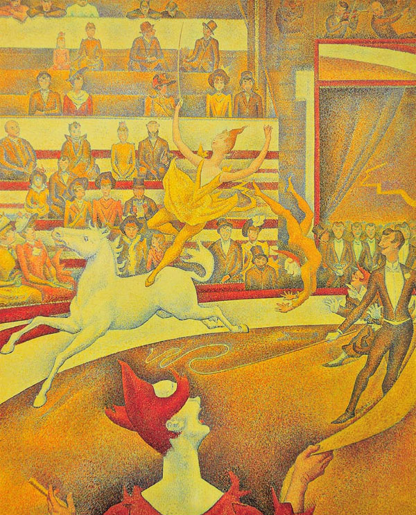 喬治·修拉(1859-1891 年),馬戲團(tuán),1891 年,布面油畫,185.5cm×152.5cm,巴黎,奧塞美術(shù)館 著名歌舞表演廳紅磨坊的所有人——奧勒和齊德勒購(gòu)買了圖盧茲·羅特列克的畫作《費(fèi)爾南多馬戲團(tuán)》,并將其掛在了走廊。在那兒,喬治·修拉看到了這幅令其贊賞不已的作品。他辭世前所創(chuàng)作的最后一幅偉大作品也描繪了類似的場(chǎng)景,只是縮小了白色駿馬在畫中的比例。這幅作品也從費(fèi)爾南多巡回演出的馬戲團(tuán)中獲得過(guò)靈感。這個(gè)馬戲團(tuán)是由它的團(tuán)長(zhǎng)——馬術(shù)表演家費(fèi)爾南德·比爾特以自己的名字命名的。 修拉與一些象征派畫家以及美學(xué)家查爾斯·亨利之間保持著密切的聯(lián)系。在這幅作品中也可以發(fā)現(xiàn)他們各自對(duì)修拉的影響。具有諷刺意味的是,自修拉去世后,象征主義者開始回避談?wù)撍淖髌贰?/div> 這幅畫作并未完成。畫家去世后,這幅畫在獨(dú)立沙龍舉辦的展覽上受到的贊賞也并不多。 |