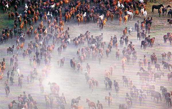 2009年9月25日,新疆伊犁大草原上舉行了“萬(wàn)馬奔騰迎亞運(yùn)”活動(dòng),這個(gè)活動(dòng)采用的是新疆特有的伊犁馬。人們喜歡馬,并非僅源于它在科學(xué)和遺傳上的意義,而是更喜歡它張揚(yáng)自由的生命,喜歡它野性十足、激昂放縱的精神。馬代表個(gè)遠(yuǎn)去的時(shí)代,伊犁大草原大概還會(huì)記得100年前它們的雄風(fēng),這個(gè)幫助人類飛馳過(guò)原野、荒漠的朋友,大大提高了人類的文明進(jìn)度。 遠(yuǎn)處一聲悠長(zhǎng)的嘶鳴,穿透了寧?kù)o的草原,萬(wàn)馬奔騰而至,蹄聲響徹云霄。這一刻生氣蓬勃,呈現(xiàn)出渾然一體的美,像王子領(lǐng)軍出征的軍隊(duì),正在伊犁大草原上。沿著追尋自由的一幕大戲。無(wú)數(shù)個(gè)渴望自由的靈魂,在無(wú)邊的原野上奔馳而過(guò),像風(fēng)和電一樣,追趕先祖的背影。 |