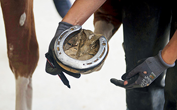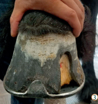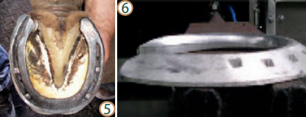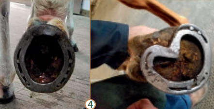 馬蹄位于馬肢體末端,是馬身體與地面接觸的最前線,有支撐、緩沖、保護和推進等重要功能。常言道:“無蹄則無馬”,足以證明蹄部在馬匹運動生涯中的重要性。當(dāng)下,馬匹的用途已從早期的拉車、耕地、載貨轉(zhuǎn)變?yōu)楦咚降母偧?,使得性能最大化與過勞傷間僅一墻之隔。而作為專業(yè)蹄部護理的修釘蹄工作也日益精細化和專業(yè)化。起初,釘蹄鐵的目的只是為了防止過度磨損,但現(xiàn)在的蹄鐵既可以用來提高競技水平,又能治療某些跛行問題。今天,我們要從更加深入的角度來聊一聊修釘蹄那些事兒。 一、理論基礎(chǔ) 蹄部解剖結(jié)構(gòu),自不必多言,凡有心養(yǎng)馬、養(yǎng)好馬者皆已從各種途徑了解和學(xué)習(xí)過這類基礎(chǔ)知識,以便于日常護理。除此之外,修釘蹄工作更關(guān)注的是:蹄部平衡、蹄部角度、蹄尖長度、滾動、蹄底厚度以及平整度。 平衡 蹄部平衡是近些年才逐步流行起來的一個說法。蹄部平衡又可細分為幾何平衡、動態(tài)平衡;內(nèi)外側(cè)平衡、背掌側(cè)平衡等。幾何平衡指的是:當(dāng)馬匹處于休息狀態(tài)時,蹄子應(yīng)該是對稱的,而且蹄子向地面垂直于肢體縱軸(如圖 1)。這樣,肢體的重量會均勻地分布在各承重結(jié)構(gòu)。動態(tài)平衡:理想情況下,落地時首先雙側(cè)蹄踵同時與地面接觸,隨后進入緩沖期,由蹄壁與諸如指墊、指 / 趾深屈肌腱等軟組織將沖擊能量緩沖吸收,當(dāng)縱向減速度為零后,骨質(zhì)結(jié)構(gòu)逐步接管,進入支撐階段。當(dāng)然很多馬也會出現(xiàn)平踏的情況,即整個蹄底直接落地。少有蹄尖先著地的情況出現(xiàn)。不恰當(dāng)?shù)钠胶鈺沟媚骋稽c或一側(cè)承壓過度,進而引發(fā)蹄踵切變、蹄壁扭轉(zhuǎn)、蹄裂等問題。遺憾的是,日常工作中幾乎無法同時滿足所有的平衡。 長度 蹄尖長度是從蹄尖向地面到蹄冠處的距離。蹄尖長度與蹄子飛行期的最大高度、蹄子縱向速度、起步點與最大高度間的水平距離以及滾動密切相關(guān)。增加蹄尖長度可以增加高度和縱向速度,但也會延緩滾動,使得起步階段指 / 趾深屈肌腱對足舟骨黏液囊的壓力升高,而且容易引發(fā)球節(jié)的懸掛結(jié)構(gòu)損傷。所以修釘蹄要根據(jù)馬匹的具體用途、性能而決定。 角度 蹄子角度是背側(cè)蹄壁與蹄子向地面所呈的夾角。一直以來,人們認為正常的蹄子角度應(yīng)該是前蹄45-50 °,后蹄50-55 °。但這個結(jié)論已被證實是有誤的,因為并沒有將肢體構(gòu)造考慮在內(nèi)。理想的蹄子角度應(yīng)該是:立定姿勢下,背側(cè)蹄壁、蹄踵的角度與系蹄軸恰好平行(如圖 2)。蹄子角度過陡(系蹄軸前突)或過緩(系蹄軸后凹)都會改變肢體的受承壓結(jié)構(gòu),從而容易引發(fā)組織結(jié)構(gòu)損傷。角度過緩時,指 / 趾深屈肌腱承壓增加,容易引發(fā)足舟骨綜合癥、蹄裂等疾?。贿^陡時,則指 / 趾淺屈肌腱和懸韌帶承壓增加。 滾動 滾動是運步階段,從蹄踵始離地面到蹄尖離開地面的這個時段。隨著蹄踵與蹄底逐步離開地面,地面作用力完全集中于蹄尖處,使得背側(cè)蹄壁壓力和指 / 趾深屈肌腱的副韌帶張力達到極值。蹄鐵滾動做得好,那蹄尖處的力臂則會相應(yīng)變短,這樣蹄子離開地面會更容易。 厚度 蹄底厚度是蹄子向地面到內(nèi)部真皮間的距離。蹄底角質(zhì)具有保護內(nèi)部真皮組織免受外傷的作用。蹄底的厚度從外觀很難直接測量,需要借助影像設(shè)備,如 X 光才能確定。蹄底過薄,則容易使內(nèi)部結(jié)構(gòu)受損,出現(xiàn)淤血等問題,進而引發(fā)馬匹跛行。當(dāng)然這種問題可以添加額外材料,如足墊等保護蹄底。 二、蹄部常見疾病的修釘蹄處理 蹄部疾病種類眾多,大致可分為:蹄匣功能紊亂(蹄叉腐爛、白線病、蹄壁缺損、蹄裂、蹄踵內(nèi)收、切變、角質(zhì)瘤),蹄部膿腫,外傷(刺傷、挫傷等),蹄潰瘍?。–anker),蹄側(cè)副軟骨功能紊亂(礦化、壞死等),骨折(蹄骨骨折、足舟骨骨折),關(guān)節(jié)結(jié)構(gòu)功能障礙(滑膜炎、骨關(guān)節(jié)炎、囊腫樣損傷、軟骨損傷等),軟組織損傷(指/趾深屈肌腱傷、籽骨奇韌帶傷、側(cè)副韌帶傷等)以及蹄葉炎等。臨床中,特殊的修釘蹄方法常用于輔助治療,配合關(guān)節(jié)注射、抗炎藥或再生療法等方法會使得治療事半功倍。下面我們分享幾種常見疾病的修釘蹄方法。 白線病和/或蹄壁空鼓 白線病多數(shù)是因為角質(zhì)質(zhì)量差或蹄子長期處于溫?zé)岢睗竦沫h(huán)境中導(dǎo)致細菌或真菌從蹄底或釘孔處入侵蹄白線,使得蹄壁與內(nèi)部蹄葉組織分離??展某@^發(fā)于白線病或蹄葉炎等疾病。一般根據(jù)涉及蹄壁的面積來決定如何治療。如果僅是向地面處淺表的問題,則僅用蹄刀扣掉感染組織即可,無需過多處理;若是已向近端爬升,那就需要將被感染或空鼓部分全部切除,直至正常組織。如果切除的蹄壁面積很大,可以考慮使用補蹄膠將切除部分補齊,方便下釘,同時利于承重(如圖 3)。 蹄踵切變 蹄踵切變指的是某個蹄子一個蹄球的高度比另一個蹄球高出 0.5cm 以上,是一種蹄匣功能紊亂。當(dāng)蹄子落地或在支撐相時(支撐相是指下肢與地面接觸并承重的時間),蹄球高的一側(cè)負重多,導(dǎo)致蹄冠代償性上移。那釘蹄的目的則是釋放承壓重一側(cè)的壓力,讓其逐