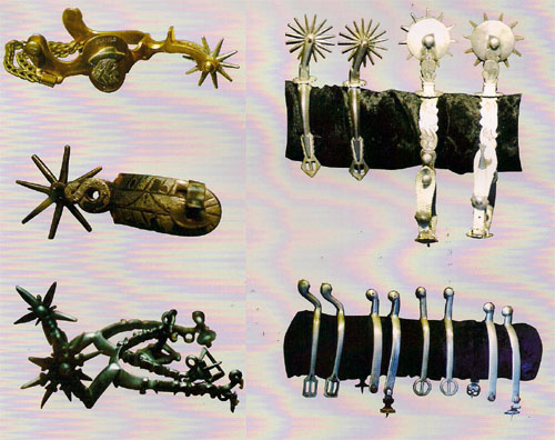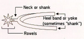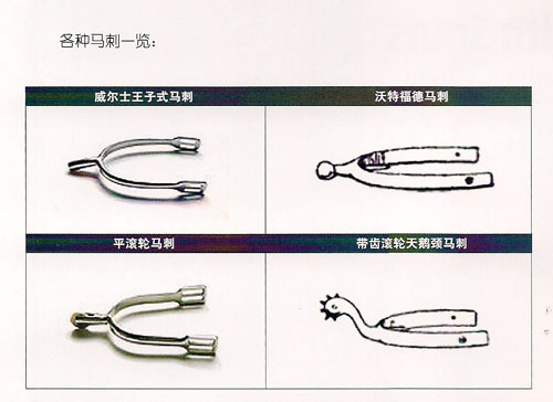 馬刺是指一種較短的尖狀物或者帶刺的輪,連在騎馬者的靴后根上,用來(lái)刺激馬快跑的裝備。它是騎手用于輔助騎乘的,一般為金屬制作,是除人體自然輔助以外的輔助。馬刺的主要用途是加強(qiáng)(對(duì)腿、騎坐、手、聲音)傳達(dá)騎乘的指示。幾乎所有有關(guān)馬的運(yùn)動(dòng)都有使用馬刺(賽馬除外),同時(shí)幾乎所有與馬術(shù)運(yùn)動(dòng)相關(guān)的組織都對(duì)所使用馬刺的設(shè)計(jì)、使用和懲罰制定了有相關(guān)的約束條款,虐待的做法會(huì)被認(rèn)為是違規(guī)的。 卑劣的人不配使用馬刺 馬刺的使用歷史能追溯到古羅馬或者更遠(yuǎn)的時(shí)期。早期的馬刺頭部比較鋒利,是用釘狀物從馬刺壁內(nèi)側(cè)向外釘出后形成的。11世紀(jì)的馬刺是直的,而我們今天使用的帶彎曲馬刺頭的馬刺是12世紀(jì)才被發(fā)明出來(lái)的。在英國(guó),馬刺曾出現(xiàn)在亨利三世的印章和13世紀(jì)的碑文上。但是馬刺真正被廣泛使用是在14世紀(jì),我們今天看到的馬刺滑輪早期也是固定死的。 1302年的“馬刺戰(zhàn)役”中,法國(guó)的騎兵被今天比利時(shí)的佛蘭芒人打敗,他們將繳獲來(lái)的馬刺掛在他們的教堂慶祝勝利以羞辱法國(guó)騎士。今天我們?cè)谟⑹津T乘中經(jīng)常使用的“威爾士王子”馬刺就是14世紀(jì)時(shí)期使用的“馬刺”演變過(guò)來(lái)的。中世紀(jì)時(shí)期,金色馬刺是“騎士身份”的象征,而那些“準(zhǔn)騎士”他們使用的馬刺則是銀色的,因?yàn)榻鹕R刺被認(rèn)為是騎士地位的尚方寶劍,所以“獲得金色馬刺就是榮獲騎士身份”。在一些中世紀(jì)的騎士降級(jí)儀式上重要的環(huán)節(jié)就是拿菜刀把騎士的馬刺截下來(lái)以表示這位騎士已經(jīng)免去了該榮譽(yù)。 在描寫歐洲騎士生活的小說(shuō)里也經(jīng)??梢钥吹接嘘P(guān)馬刺的描寫,司各特的《英雄艾文荷》,塞萬(wàn)提斯的《堂吉柯德》,《羅賓漢》盡管不是寫騎士的但也提到過(guò)馬刺,并且在《羅賓漢》里還提到過(guò)馬刺是騎士精神的象征,卑劣的人不配使用馬刺。 不同項(xiàng)目搭配相應(yīng)的馬刺 騎術(shù)中使用馬刺就像書畫中使用細(xì)筆一樣,騎手通過(guò)馬刺傳達(dá)給馬匹的指令動(dòng)作是非常的微妙的,旁人是幾乎觀察不到的。無(wú)論是舞步還是障礙,只有騎手騎乘技術(shù)達(dá)到一定的水平后才能夠使用馬刺,其中:騎坐、大腿和膝蓋自然向內(nèi)貼、腳的位置、腳后跟保持向下等等都是決定該騎手是否適合使用馬刺的因素。 穿戴馬刺時(shí),馬刺的頭應(yīng)朝下,如果有扣袢的話,扣袢要朝外。根據(jù)項(xiàng)目不同,使用的馬刺也不同。用于西部騎乘的馬刺通常主要是作秀用,外表雕刻華麗,帶有可轉(zhuǎn)動(dòng)滾輪。在西部騎乘中,由于西部鞍的鐙帶較硬并且長(zhǎng),所以騎手的腳與馬之間的距離相對(duì)較遠(yuǎn),因而西部馬刺的馬刺頸部較長(zhǎng),滾輪的直徑也比較大。英式騎乘中使用的馬刺非常柔滑,纖細(xì),設(shè)計(jì)保守。馬刺頸部較短,由于騎手的腳離馬匹之間距離非常近,所以馬刺頭部比較圓而且鈍。雖然有的英式馬刺也有裝配齒輪或者平滑的滾輪,但是英式騎乘中很少有人用這樣的馬刺。在舞步中使用的馬刺功能更為復(fù)雜,馬刺傳達(dá)的信息也比較復(fù)雜,比如說(shuō):橫向移動(dòng),pirouettes(后肢旋轉(zhuǎn)),travers(腰向內(nèi)),renvers(腰向外),the airs above theground(騰空)等等。 舞步騎手傾向于使用帶球形圓頭的“沃特福德”式馬刺。與舞步不同,獵狐和障礙騎手則傾向于使用平頭的馬刺,因?yàn)檫@樣易于騎手給馬發(fā)出向前走的指令,比如說(shuō)“威爾士王子”式馬刺就是這種馬刺的典型代表,是障礙中應(yīng)用得最廣泛的馬刺。而速度賽不使用馬刺,是因?yàn)樗俣荣愹T師的腳與馬匹無(wú)明顯的接觸。 初步使用馬刺,應(yīng)先彎曲腳踝然后往內(nèi)側(cè)輕壓馬匹。如果騎手出現(xiàn)腿部不經(jīng)心的左右晃動(dòng)或者不平穩(wěn)的騎坐導(dǎo)致不小心刺到馬匹,這會(huì)惹怒、驚嚇或分散馬匹的注意力。長(zhǎng)期不正確使用馬刺,會(huì)使馬匹失去腿部輔助的敏感性。馬刺使用不當(dāng)也會(huì)引發(fā)一些嚴(yán)重的后果,如:尥蹶子,掙脫狂奔等。 馬刺小百科 馬刺主要包括下幾個(gè)部位: 馬刺部位和稱呼: 馬刺叉(Yoke) -又稱之為“分岔”,即馬刺圍繞在馬靴的部分。 馬刺頸(Neck of Shank) -馬刺叉后部的延伸,通常也是接觸馬的部位。 滾輪(Rowels)-馬刺頭部連接在馬刺頸部能夠轉(zhuǎn)動(dòng)的裝置,有的是齒輪,有的是平滑的圓輪。當(dāng)然不是所有馬刺都有這個(gè)部位。 馬刺帶和護(hù)腿鉤: 馬刺通常需要使用一條皮質(zhì)或尼龍的帶子將其固定在馬靴上,這條帶子叫做“馬刺帶”。馬刺帶是從馬靴的腳背繞過(guò)鞋底將馬刺固定在馬靴上的。西部馬刺帶只從馬靴腳背繞過(guò)就能夠把西部馬刺固定于馬靴,因?yàn)檫@樣的馬刺能夠通過(guò)馬刺自身的特殊設(shè)計(jì)夾緊在馬靴的腳跟,不需要馬刺從腳底繞過(guò)。甚至有的馬刺不需要馬刺帶就能夠夾緊在馬靴上。挑選馬刺帶要注意馬刺帶能否和馬刺搭配,有些馬刺設(shè)計(jì)使用的是馬刺帶能夠從里邊穿過(guò)卡槽式,有些馬刺則是扣袢式。 西部馬刺的頸部還帶有一個(gè)向上