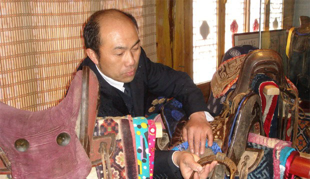 蒙古族是中國數(shù)千年北方游牧民族的繼承者,鞍馬文化是其文化的核心內(nèi)容之一。馬鞍對蒙古族來說不僅是騎馬的必備之物,而且是騎手和馬的重要裝飾物,已經(jīng)形成了獨(dú)特的裝飾藝術(shù)。馬鞍的制作和裝飾有著久遠(yuǎn)的歷史和古老的傳統(tǒng),一匹訓(xùn)練有素的快馬,配上一副雕花鑲銀的馬鞍,一下子就抬高了主人的身價??梢?,馬鞍的優(yōu)劣也能成為主人身份和地位的體現(xiàn)。這種濃厚的社會氛圍和歷史傳統(tǒng),締造了燦爛多姿的鞍馬文化。 2011年4月21日,經(jīng)內(nèi)蒙古文物局批準(zhǔn),錫盟多倫縣馬具博物館正式開業(yè)。該博物館的展品全部是由民間收藏家馬東升的祖孫三代歷經(jīng)數(shù)年收集起來的,尤以蒙古馬鞍著名。開業(yè)當(dāng)天,中國馬文化博物館副館長蔡長河,中國馬業(yè)協(xié)會副會長、中央電視臺馬評人蔡猛,受邀前去為博物館開業(yè)剪彩。 多倫馬鞍發(fā)展的歷史 位于內(nèi)蒙古錫林郭勒盟草原南部的多倫縣,過去曾是草原地區(qū)重要的漠南商埠,每年都有大批蒙古馬經(jīng)多倫銷往內(nèi)地。1691年,康熙皇帝在多倫以北的烏蘭布統(tǒng)平定了葛爾丹叛亂,在多倫地區(qū)與外蒙三部及內(nèi)蒙古48家王公貴族進(jìn)行了“康熙會盟”。隨后,為了給北方游牧民族提供必要的生產(chǎn)資料以穩(wěn)定邊疆,清政府采取了懷柔政策,委派“龍頂商人”(從事皇室貿(mào)易的商人)進(jìn)駐多倫,與蒙古地區(qū)發(fā)展貿(mào)易,并帶來宮廷造辦處的工匠進(jìn)行手工藝品的制作,使得多倫匯集了大批一流的手工藝制造者,多倫的手工業(yè)逐漸發(fā)展起來。在那個南船北馬的時代,馬是北方游牧民族地區(qū)的主要交通工具,馬鞍是騎乘必備之物,因此多倫馬鞍制造業(yè)應(yīng)運(yùn)而生。在鼎盛時期,多倫制作馬鞍的作坊達(dá)50余家,規(guī)模最大的作坊有工匠近百人。 鴉片戰(zhàn)爭后,國內(nèi)很多地區(qū)建有洋人租借地,因此西方的“跑圈賽馬”便傳入中國,在我國天津、青島、漢口、上海、廣州等地都建有跑馬場,上海還建有“跑馬廳”。當(dāng)時多倫地區(qū)商貿(mào)繁榮,因此蒙古草原上的馬匹源源不斷的運(yùn)往多倫,由當(dāng)?shù)氐鸟R倌進(jìn)行調(diào)教篩選后,再經(jīng)馬商販之手運(yùn)往內(nèi)地參加比賽。在多倫,與馬有關(guān)的手工業(yè)十分興盛,尤以制鞍業(yè)最為發(fā)達(dá)。多倫馬鞍的制作與其它地區(qū)不同,在鞍木的使用方面,其它地區(qū)的馬鞍多由6-8塊木材制作,多倫馬鞍僅用四塊上好的鞍木用膠對接而成,人稱“四塊玉”,不裂不散,堅固耐久,多年不變形。多倫馬鞍的式樣主要有大官座、小官座、元寶式、三元式、烏珠穆沁式、青海四平式、新疆哈薩克式等。一盤上好的馬鞍需要5-6個工匠共同制作完成,包括砍鞍子匠、鐵匠、銀匠、趕氈子匠和皮匠,最后由技藝最好的工匠來完成整體的裝配,一盤上好的鞍具才制作完成。整個制作過程精細(xì)、復(fù)雜、嚴(yán)謹(jǐn),有時一盤上等的鞍具需要多個月甚至一年的時間才能制作完成。多倫馬鞍以其選材講究,造型精美,乘坐舒適,結(jié)實耐用等特點(diǎn)聞名各地,除向中原內(nèi)陸、新疆 、青海、西藏等地源源不斷的供應(yīng)外,更經(jīng)外蒙古恰克圖遠(yuǎn)銷俄羅斯的游牧民族地區(qū)。 民國以后,多倫商貿(mào)日漸衰退。據(jù)多倫商會檔案記載,1929年多倫尚存馬鞍作坊23家,解放初只剩7家,公私合營后,馬鞍作坊全部合并于民族用品廠。至上世紀(jì)90年代民族用品廠解體后,僅剩的一批老工匠也只能在家里制作馬鞍具了。 馬東升,民間馬具收藏家,多倫馬具博物館館長,祖孫三代癡迷收藏。初次見到他的時候幾乎沒有說話,他似乎不擅言辭,很溫和謙虛。直到他騎上馬背,那種看得到的興奮和不顧一切,讓人不由得感嘆這是一個真正的馬背民族。 據(jù)史料記載,世界上多數(shù)穆斯林都是阿拉伯游牧民族的后裔,而馬館長就是回族人。元朝時皇宮里的回族主要為統(tǒng)治者提供天文、數(shù)字、手工藝及養(yǎng)馬、馴馬的技術(shù),所以,馬館長的祖輩就已經(jīng)開始跟馬結(jié)緣。小的時候,馬東升館長的身邊很多親戚朋友都在做著與馬相關(guān)的工作,但他說,主要給他帶來影響的還是自己的祖父和父親。他的祖父、父親都十分喜好收藏,遇到自己喜歡的東西會千方百計收藏到自己家中。祖父年輕時在“鞭桿會”工作,那是一個專門從事牲畜交易的民間組織,因當(dāng)時交通落后,牲畜商人買賣的牲畜都是由人工騎著馬,邊放牧邊趕路,將牲畜群護(hù)送到張家口、天津、集寧等地出售的。掙到錢后,看到鐘愛的藏品會買下來,像揣著寶貝似的拿回家。建國后,國家非常重視防疫工作,從土匪手中繳獲了大量的馬匹,其中還包括四五十套的馬鞍。那時候正處在文革時期,大部分人不懂文物的價值,就把收繳的馬具都放到典當(dāng)行出售。當(dāng)時在縣防疫站工作的馬館長的父親就是在那個時期把大部分馬鞍藏品收集起來的。 因為從小就癡迷騎馬,加上祖父和父親的耳濡目染,使得馬館長對收藏也產(chǎn)生了濃厚的興趣。馬鞍、馬鐙、馬棒,馬鞭,從最初的興趣到后來的癡迷,年近五十的他在幾十年的收藏生涯中花費(fèi)了大量的財力和精力。有一次,在一位老牧人家中發(fā)現(xiàn)了