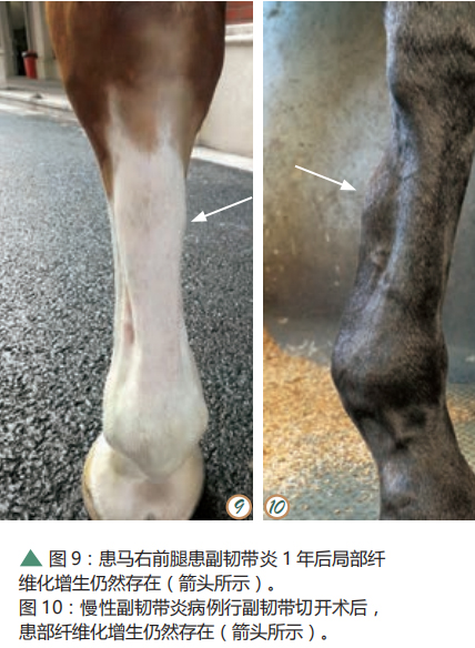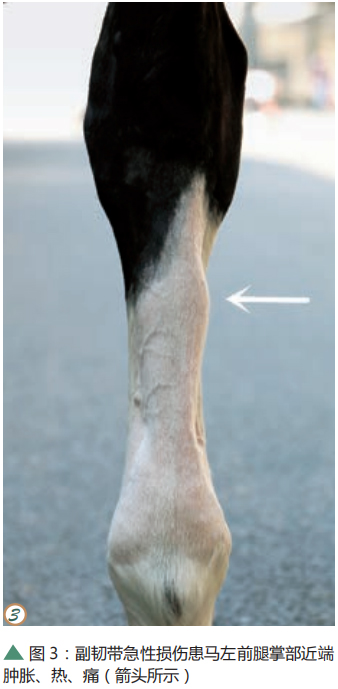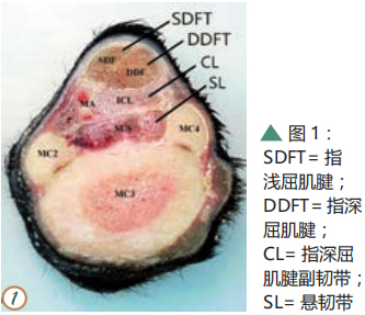 相信大部分讀者都見過馬腿“漲筋”,細心的讀者或許會發(fā)現(xiàn)“漲筋”并非總是發(fā)生在同一個部位,有些是管部上段,有些是管部側(cè)面,有些是管部下段,腫脹的部位不同通常提示受損的結(jié)構(gòu)不同。對于舞步馬來說,肌腱損傷的發(fā)生率較高,其中懸韌帶和指淺屈肌腱損傷是最常見的,而副韌帶損傷相對少見。這篇文章主要給讀者介紹副韌帶損傷的發(fā)病機理和治療方法。 通常副韌帶容易受損的群體為休閑騎乘馬、小型馬和舞步馬,年齡在 10 歲以上多見,且前肢比后肢易發(fā)病。臨床上副韌帶受損之后繼而會發(fā)展成為副韌帶炎。想要知道副韌帶為什么會受損,就要先了解副韌帶的解剖結(jié)構(gòu)和功能。副韌帶也叫指深屈肌腱副韌帶(AL-DDFT)或遠副韌帶(如圖1),它是由腕關(guān)節(jié)掌側(cè)韌帶的分支所形成,由腕部向下延伸至掌骨,在掌骨中部與指深屈肌腱相融合。它的存在主要是為了加強指深屈肌腱的功能。 在馬匹的運動系統(tǒng)中,肌肉提供動力,肌腱傳輸動力并牽引骨骼產(chǎn)生運動,韌帶連接骨骼并可防止關(guān)節(jié)過度伸展。在馬慢步的一個周期中,每一條腿都會經(jīng)歷一個與地面接觸并負重的站立期和一個離地向前挪動的邁步期。在整個站立期內(nèi),球節(jié)因負重而伸展,懸韌帶、指淺屈肌腱和指深屈肌腱依次受力緊張,在其中的站立中期,指淺屈肌腱和懸韌帶是球節(jié)的主要支撐,可防止球節(jié)在運動過程中過度伸展;而在站立末期,腕關(guān)節(jié)和球節(jié)同時伸展,在此階段主要由指深屈肌腱來承擔拉力,腕掌側(cè)韌帶、副腕骨韌帶和副韌帶可防止腕部過度伸展,使得腕關(guān)節(jié)的穩(wěn)定性增強 ( 如圖2)。 由于舞步馬的特殊步態(tài),球節(jié)可能常常過度伸展,導(dǎo)致肌腱和韌帶長期處于拉伸狀態(tài),因此更易受損。此外,不良肢蹄構(gòu)造如臥蹄、球節(jié)屈曲畸形等也會使指深屈肌腱和副韌帶所受的拉力增加,因此增加了指深屈肌腱和副韌帶受損的幾率。 當出現(xiàn)副韌帶受損時,通常騎手不容易察覺或患馬僅發(fā)生失蹄,但在短時間內(nèi)(1天)患馬突然跛行,并且可以看到患馬的掌部上段有明顯腫脹的部位(如圖 3),觸摸腫脹的部位很熱、有疼痛反應(yīng);用B超檢查可以發(fā)現(xiàn)副韌帶擴張,有低回聲區(qū)(水腫、血腫或韌帶纖維損傷,如圖5、6)。 由于副韌帶對于騎乘馬來說不是支撐重量的主要結(jié)構(gòu),所以對于副韌帶炎的治療方案與其它肌腱炎的治療方案有所不同,其治療主要著重于減輕疼痛和跛行癥狀。在發(fā)現(xiàn)愛馬可能發(fā)生副韌帶損傷后,騎手可盡快冰敷患處以減輕疼痛、減少受損組織內(nèi)的滲出,并盡快向獸醫(yī)尋求幫助。 針對副韌帶炎的治療通??梢赃x擇口服非甾體類藥物以鎮(zhèn)痛消炎,在損傷內(nèi)注射玻璃酸鈉以減少組織間粘連。對于慢性病例(3個月以上)也可以考慮副韌帶切開術(shù),副韌帶切開術(shù)可減少韌帶承受的過度拉力,減輕患部的疼痛。另外,可以詢問專業(yè)釘蹄師的建議,考慮釘特殊蹄鐵,以平衡韌帶所受的拉力,給予蹄踵更多支撐,以此減少指深屈肌腱和副韌帶承受的拉力。 在獲得診斷以后應(yīng)制定一個康復(fù)訓(xùn)練計劃,在康復(fù)訓(xùn)練期間,患馬的活動應(yīng)嚴格受到控制,并且逐漸增加活動量,而不是將患馬放在草場任其自由活動,因為后者的做法可能導(dǎo)致副韌帶再次受損,使得損傷愈合的時間變長。建議在確診后間隔60天進行一次復(fù)查,并由獸醫(yī)根據(jù)患馬的跛行程度和B超檢查結(jié)果來評估是否可以增加活動量。慢性病例的纖維排列在B超中可能不會顯示出正常結(jié)構(gòu)(如圖 7、8),患部的腫脹可能會持續(xù)很長時間并且會逐漸形成堅實的纖維化增生(如圖 9、10)。 副韌帶炎通常預(yù)后慎重,有資料稱小型馬痊愈的幾率較高,溫血馬則較低;急性損傷比慢性損傷預(yù)后好;發(fā)現(xiàn)早、采取治療措施早的病例預(yù)后會較好;而同時存在指淺屈肌腱或指深屈肌腱損傷的病例,治療效果不能令人滿意,尤其是當患馬有球節(jié)構(gòu)造差的情況時。后肢副韌帶炎在發(fā)病初期不容易被察覺,等到表現(xiàn)出癥狀時通常已過了最佳治療時期,保守治療效果不好,大部分病例即使行副韌帶切開術(shù)后仍會持續(xù)存在跛行。 文/包苞 圖/海瀾馬醫(yī)院 |