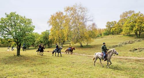 父親曾經(jīng),形容草原的清香, 讓他在天涯海角也總不能相忘; 母親總愛,描摹那大河浩蕩, 奔流在蒙古高原,我遙遠(yuǎn)的家鄉(xiāng)。 如今,終于見到這遼闊大地, 站在這芬芳的草原上,我淚落如雨。 河水,在傳唱著祖先的祝福, 保佑漂泊的孩子,找到回家的路。 啊,父親的草原, 啊,母親的河! 雖然已經(jīng)不能用母語來訴說, 請(qǐng)接納我的悲傷、我的歡樂。 我也是高原的孩子啊,心里有一首歌, 歌中有我父親的草原、母親的河! 一首悠揚(yáng)的歌,把我們帶到這片草原,這條河。 西拉沐淪河,是發(fā)源于內(nèi)蒙古赤峰克什克騰旗境內(nèi)的一條古老河流,其源頭出自烏蘭布統(tǒng)的的薩嶺河,河流全長397公里。這條河的歷史已有8000多年,其河水哺育了流域內(nèi)的各族人民,著名的紅山文化史前文明因早于黃河流域而被史學(xué)界譽(yù)為“祖母河”。整條河的海拔落差有1000多米,沿途多河匯流、吸納百川,最終形成了西拉沐淪河“山高谷深,河床迭跳,氣勢(shì)萬千”的壯觀風(fēng)貌。 西拉沐淪河的發(fā)源地烏蘭布統(tǒng)草原,地處華北平原和內(nèi)蒙古高原的接壤處,俗稱壩上。塞罕壩北麓,大興安嶺山脈與陰山山脈交匯處,地形地貌變化就很多樣,又處在渾善達(dá)克沙地最南端,所以這里濃縮了整個(gè)內(nèi)蒙古高原的風(fēng)景,有草原、森林、大山、沙漠、河流、湖泊、丘陵和濕地,林木花卉、野生動(dòng)物大多保存完好,一派原生態(tài)的自然景觀。 在草原深處,有一處由沙漠中涌出的甘泉形成的湖泊。這湖還有個(gè)美麗的傳說:在康熙御駕親征葛爾丹的烏蘭布統(tǒng)戰(zhàn)役結(jié)束后,藍(lán)齊兒公主為了陪伴逝去的丈夫,養(yǎng)育兒子,而沒有返京留在了這里,但她思念家鄉(xiāng),思念父母,時(shí)間久了,滴淚成湖,就形成了這灣公主湖。公主湖常年地下水涌出成河,流經(jīng)小橋子、葫蘆諾日、透風(fēng)溝,與盤龍峽谷流出的西大河水合流,穿過石門峽谷,再與以樺木溝為源頭的河流一起匯聚成西拉沐倫河的上游——薩嶺河。 每年烏蘭布統(tǒng)草原的金秋時(shí)節(jié),來自全國的馬友都會(huì)匯聚于此,從西拉沐倫河源頭附近的葫蘆諾日村出發(fā),開啟西拉沐淪河的騎馬探索之旅。馬隊(duì)第一天穿過金秋風(fēng)景最美的南井風(fēng)景區(qū),到達(dá)薩嶺河后,沿河谷順流而行。 烏蘭布統(tǒng)草原秋色非常濃郁,五彩繽紛,山坡上的紅葉姹紫嫣紅,美不勝收,仿佛天庭的畫師打翻了顏料筒,撒在了這片草地上。草原中彎彎曲曲的小路,構(gòu)成了畫面中的曲線,恰似一幅重彩油畫。陽光照亮了白樺林,白白的樹干上搖曳著金黃色的葉子;橡樹,大大的葉子托著橡果泛著紅色;幾百年的老榆樹,還保留著夏季的翠綠;被打草機(jī)打過的草地,在陽光的照射下,平整地鋪在我們腳下;山影、樹影更襯托出亮部畫面的艷麗,使畫面層次感更強(qiáng)。山楊樹、落葉松、杏林、山丁子樹等,還有沙柳、紅柳、檸條等灌木叢,赤橙黃綠青藍(lán)紫,把這里裝扮成一個(gè)童話般的世界。 過了南井,就是片開闊地,這里被承包出去種了莊稼,有土豆、莜麥、小麥等,這里也是植被被破壞得嚴(yán)重的地方,農(nóng)民在西拉沐淪河上筑壩抽水,澆灌這片開墾過的農(nóng)田。但是景色依舊美麗,收割過的麥田,麥茬一片金黃,遠(yuǎn)處層巒疊嶂的山坡,楊樹、樺樹、楓樹、松樹以及灌木等,層林盡染,五彩斑斕,風(fēng)景獨(dú)好。 過了這片農(nóng)田,就是薩嶺河下游的峽谷。河谷里,水草豐美,景觀奇特,成群的牛羊,悠閑地漫步在河畔,流動(dòng)的西拉沐淪河水,與兩岸風(fēng)光秀麗的景色,互相疊加,像一個(gè)塞外桃源。這里有一個(gè)叫“德勒沁”的村莊,馬隊(duì)走到這里,都會(huì)不由自主地放慢速度,大約人馬都怕破壞了這安靜祥和的氣氛。 沿著河水流淌的方向前行,漸漸感受到西拉沐淪大峽谷的美,壯闊、雄渾! 有時(shí),河水靜靜流過,像一首歲月的歌,幾千年中,在那洶涌浩瀚之間,溫柔地施予;又像母親的護(hù)佑,滋潤并養(yǎng)育著兩岸的生靈。正如歌中唱到:“河水,在傳唱著祖先的祝福,保佑漂泊的孩子,找到回家的路?!庇袝r(shí),像一匹匹契丹戰(zhàn)馬,挾裹著塞外的蒼涼與野性,奔出大興安嶺,馳騁在草原上,匯入遼河,涌進(jìn)浩瀚的渤海。更多的時(shí)候,它像一位久歷滄桑的老人,從遠(yuǎn)古走來,緩緩淺淺,閑適平和,那寬大的河床,曲曲折折,訴說著它的興衰與變遷。 《呂氏春秋》、《淮南子》把西拉沐倫河列為“中國六大川”之一?,F(xiàn)代人對(duì)這里有很多的形容,比如“草原三峽”,“塞外江南”。 第一天行程結(jié)束,馬隊(duì)夜宿西拉沐淪大峽谷。西拉沐淪河里的高原冷水野生魚是晚餐必不可少的美味,旅人們對(duì)這一天所有的食色之期至此都得到了滿足。 第二天一早,馬隊(duì)再次啟程,穿行山谷之間,馬蹄下,是流淌的河水,兩側(cè)是長滿植被的山坡。內(nèi)蒙古高原的天氣百變,總好像在故意向我們炫耀。時(shí)而晴空萬里、白云朵朵,草原像翡翠般清澈透亮;時(shí)而大霧籠罩,草原、山巒、樹木,若隱若現(xiàn),朦朦朧朧,神秘莫測,仿佛一天便經(jīng)歷了四季交替。 走出峽谷,前方是需要翻越的海拔 1700 多米的小壩梁。山下是陰天,半山腰已經(jīng)在下雨,快到山頂時(shí)卻變成了雪花。到達(dá)山頂,眼前豁然開朗,不對(du