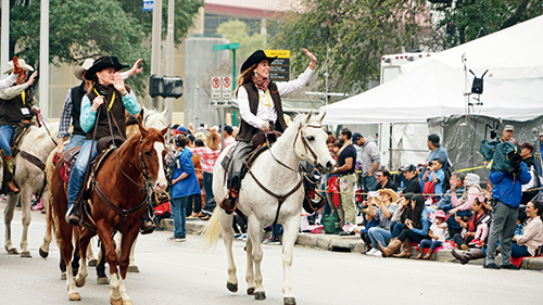 春天的美國(guó)休斯頓迎來(lái)了這個(gè)城市每年最盛大的節(jié)日——牛仔節(jié),休斯敦牛仔節(jié)始于1932年,當(dāng)時(shí)是德克薩斯州畜牧界盛事,如今已成為世界上規(guī)模最大的牛仔節(jié)。 序幕:牛仔節(jié)大游行 2月23日在休斯頓市中心的大游行,是整個(gè)牛仔節(jié)的序幕。 游行路線從巴格比和沃克街(Bagby and Walker streets)開(kāi)始,從特拉維斯到貝爾(Travis to Bell),從貝爾到路易斯安那(Bell to Louisiana),最后在拉馬爾和巴格比街(Lamar and Bagby streets)結(jié)束。 我們?cè)缭缇偷搅耸兄行?,否則到晚了停車會(huì)很是問(wèn)題,很幸運(yùn)地在不遠(yuǎn)的街角找到了5美元不限時(shí)的車位。停好車后通往游行街道的路邊有個(gè)志愿者在發(fā)免費(fèi)的DONNA圈,正好拿一個(gè)當(dāng)早餐了。美國(guó)的DONNA圈比我們國(guó)內(nèi)的要甜很多,不僅外面裹著厚厚的一層奶油,里面還有很大的一圈糖芯,真是舍得下料??!在這個(gè)油炸和甜品的國(guó)度里旅行,體重不增加才是怪事。 主街側(cè)面的一條街道里,正巧德克薩斯A&M大學(xué)的隊(duì)伍正在做準(zhǔn)備。墨綠色整齊的制服襯著一張張年輕的臉龐,馬背上暗紅的汗屜上印著統(tǒng)一的 A&M學(xué)校的標(biāo)志。這所學(xué)校建立于1876年,是北美頂尖研究型大學(xué)聯(lián)盟“美國(guó)大學(xué)協(xié)會(huì)”(AAU)的成員,全美第六大公立高校,擁有極高的學(xué)術(shù)成就和教學(xué)水準(zhǔn)。高水準(zhǔn)的學(xué)校也擁有著高水準(zhǔn)的騎兵隊(duì),無(wú)疑眼前這支齊整的隊(duì)伍很符合 A&M的專業(yè)形象。想到了我們國(guó)內(nèi)一流的院校,擁有那么多優(yōu)秀的學(xué)生社團(tuán),一切都很好,就差一支馬術(shù)隊(duì)啦! 我們一路先溜達(dá)到了游行的起點(diǎn),大量隊(duì)伍在這里候場(chǎng),人數(shù)最多的是管弦樂(lè)隊(duì),每支隊(duì)伍應(yīng)該都有幾十上百人以上,也是各大學(xué)校的學(xué)生社團(tuán)。起點(diǎn)還聚集了上千名身著運(yùn)動(dòng)服的市民,游行之前有個(gè)五公里和十公里健身跑比賽,和一個(gè)十公里的輪椅比賽。加上列在街道兩邊觀看游行和賽事的居民,以及參加巡街的騎馬人群,整個(gè)休斯頓的牛仔節(jié)就是一個(gè)幾乎全市人都參與的盛大節(jié)日。 兩名很帥氣的軍官率先進(jìn)入到最前面的空地上,宣布了游行的開(kāi)始。一支銅管樂(lè)隊(duì)奏著雄壯的樂(lè)曲,帶出了后面游行的馬隊(duì)。 走在前面的是各政府官員和明星。公務(wù)員們看上去穿得很正經(jīng),雖然騎在馬背上會(huì)戴牛仔帽穿牛仔靴,但是夾克里面的白襯衣,以及較為文氣的長(zhǎng)相,一看就是坐辦公室的。盡管如此,毫不妨礙他們很嫻熟地駕馭著馬匹,輕松地小步顛過(guò)水泥路面,難道公務(wù)員家里也是養(yǎng)馬的嗎? 當(dāng)然觀眾反響最強(qiáng)烈的是明星的經(jīng)過(guò)。其中一位是休斯頓橄欖球迷最喜愛(ài)的德肖恩·沃森(Deshaun Watson),他被任命為游行的“元帥”。他曾帶領(lǐng)“老虎隊(duì)”背靠背地參加大學(xué)橄欖球季后賽,并在2016年贏得了該校的第二個(gè)國(guó)家冠軍。他在2017年的新秀賽季創(chuàng)造了幾項(xiàng)NFL記錄,同年他向三名受到颶風(fēng)哈維影響的NRG體育場(chǎng)工作人員捐贈(zèng)了他的第一張比賽支票。他還與“人類棲息地”合作,幫助休斯頓地區(qū)提供176所被風(fēng)暴損壞的房屋。 平時(shí)一本正經(jīng)的警察,此時(shí)也笑容可掬地騎馬經(jīng)過(guò)人群,泰然向兩旁的市民揮手致意。甚至一名很胖的女警官,還牽著一匹小矮馬,顯得異常地和諧。執(zhí)行公務(wù)的人和車都不那么嚴(yán)肅了,紅色的消防車上也站滿了歡呼的人,緩緩開(kāi)過(guò)街道,像一個(gè)游行的大花車,一反平時(shí)緊張嚴(yán)肅的面孔。 各路小姐姐們是最入鏡的了。從稚氣未脫的苗條高中女生,到花車上唱歌的女郎,妖嬈的超市女收銀員,鏡頭中只要拍清楚了,都是最美的畫(huà)面。美國(guó)女生是最自信的,即使身材不那么完美,也仍然昂首挺胸,一臉的傲嬌,隊(duì)伍中常有以我們的標(biāo)準(zhǔn)來(lái)看很胖的女生,仍然穿著緊身的體操服,在地面行走、跳躍,健康而陽(yáng)光。 墨西哥人的隊(duì)伍是最具風(fēng)情的。墨西哥人沿襲的是西班牙馬術(shù),馬匹能做出花式的舞步,男人們戴著大檐帽騎著馬做著高抬腿轉(zhuǎn)過(guò)街角,女人們身著華麗的裙裝,側(cè)騎在馬背上,古典優(yōu)雅。 這片土地最早是1718西班牙傳教士來(lái)占領(lǐng)的。1810年爆發(fā)了反對(duì)西班牙殖民統(tǒng)治的人民起義,墨西哥獨(dú)立后,得克薩斯成為墨西哥科阿韋拉 - 特哈斯州的一部分。1836年4月,由前田納西州長(zhǎng)山姆·休士頓(Sam Houston)帶領(lǐng)的軍隊(duì)在圣哈辛托戰(zhàn)役(Battle of San Jacinto)中打敗桑塔·安納的軍隊(duì),強(qiáng)迫他承認(rèn)了得克薩斯的獨(dú)立。1836年到1845年期間,德州為一個(gè)獨(dú)立的國(guó)家,但經(jīng)常遭到墨西哥軍隊(duì)的攻擊,于1845年通過(guò)談判,正式加入美國(guó),成為美國(guó)的一個(gè)州。所以在德州很多人是說(shuō)西班牙語(yǔ)的,連機(jī)場(chǎng)都是播一遍英語(yǔ)一遍西語(yǔ)。如果你英語(yǔ)不好,聽(tīng)不懂的話,就試圖說(shuō)西班牙語(yǔ),很多人也能懂。 圣
