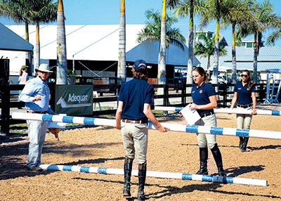 當(dāng)你專心致志于比賽過程的時(shí)候,也許并沒有留意賽場的路線設(shè)計(jì)中融入了多少心思。事實(shí)上,設(shè)計(jì)師需要精心考慮每一道障礙的高度、寬度、形狀、顏色和造型以及這道障礙與其他幾道障礙和賽道整體布局的相對(duì)位置關(guān)系,在搭建安全、合理、流暢的路線的同時(shí),考查你和馬的能力和技巧。2011年1月,在美國佛羅里達(dá)州惠靈頓市舉辦了一場為期一周的George H. Morris馬術(shù)訓(xùn)練營,作者Anthony D'Ambrosio以訓(xùn)練營期間最后一天由他親自設(shè)計(jì)的路線為例,引領(lǐng)讀者跟隨路線順序走場,體驗(yàn)每道精心設(shè)計(jì)的障礙。 本路線設(shè)計(jì)的初衷是檢驗(yàn)這些參加訓(xùn)練的積極進(jìn)取的年輕障礙賽騎手們?cè)谝恢軐W(xué)習(xí)時(shí)間里所掌握的技巧。比賽采用國家杯的賽事形式,也就是說,參賽者被分成若干隊(duì),每位隊(duì)員均進(jìn)行兩輪比賽,這有助于騎手們從第一輪比賽中汲取經(jīng)驗(yàn)教訓(xùn),并在第二輪中做出改進(jìn)。 本文將逐步引導(dǎo)你如何像路線設(shè)計(jì)者一樣思考,明確考官的“出題意圖”。 路線設(shè)計(jì)并不一定都是從第一道障礙開始的。在Anthony設(shè)計(jì)這一路線的時(shí)候,考慮到George想要在比賽場地中加入一道水障,所以他最先著手從水障(它和這一周訓(xùn)練課程所用的水障相同)開始。特別有挑戰(zhàn)性的障礙,比如說水障和大型的三橫木障礙,會(huì)改變整個(gè)賽場路線的走向。 你為了讓馬零失誤跨越這種障礙,或者防止其在障礙前停下來或逃避障礙(特別是當(dāng)馬對(duì)這種障礙心存恐懼的時(shí)候),往往會(huì)調(diào)動(dòng)馬的興奮點(diǎn),但這也會(huì)使它的注意力在接下來的比賽中稍有下降,也會(huì)讓你在跨越剩余障礙的時(shí)候調(diào)整騎乘方式。因此,一般說來,在場地中越早設(shè)置水障,比賽的難度也就越高。在本文的路線圖中可以看到,本場比賽的水障設(shè)置在了第7道,幾乎是在整場比賽的中間時(shí)刻出現(xiàn)這種難度較大的障礙。此外,設(shè)計(jì)師還通過在水障前后設(shè)置其他障礙向騎手提出各種考驗(yàn)。 第1道障礙 任何比賽的第一道障礙都需要付出一定的努力,這取決于馬的經(jīng)驗(yàn)和障礙的難度。經(jīng)驗(yàn)較少的馬需要騎手更多的幫助以專注于當(dāng)前的任務(wù),而不被場地上的其他景象分散注意力。經(jīng)驗(yàn)較為豐富的馬則熟悉整個(gè)流程,對(duì)第一跳充滿了期待。第一道障礙十分特殊,它迫使你向遠(yuǎn)離進(jìn)場口的方向行進(jìn),相當(dāng)于是讓習(xí)慣群居的馬做出非本能的行為。除此之外,本場比賽的第一道障礙是道伸展障礙(雙橫木障礙),這就需要馬付出更多的努力。而且這是一道上升式伸展障礙,前面的橫桿高度低于后面的橫桿,比兩道等高橫桿的方形伸展障礙更能激起馬跨越障礙的欲望??偠灾?,這些因素都需要你激起馬的干勁,在接近第一道障礙的時(shí)候,你有充足的時(shí)間調(diào)整步伐,手和腿要與馬保持緊密的聯(lián)系,引導(dǎo)它正直地跳過這道障礙。 第2道障礙 在第一跳之后,要在左轉(zhuǎn)的同時(shí)保持住良好的狀態(tài)去面對(duì)第二道高大而堅(jiān)固的磚墻障礙。時(shí)間有限,大幅度的轉(zhuǎn)彎是不可能的,因此你不需要繞過第5道障礙,只需要做個(gè)簡潔的小轉(zhuǎn)彎,讓馬保持好平衡并且積極向前。許多騎手和馬不會(huì)在平日練習(xí)這種磚墻障礙,而是選用頂部放置了若干橫桿的較矮的磚墻障礙來訓(xùn)練,所以在比賽的時(shí)候騎手和馬要果斷并充滿信心。注意:在平日讓馬練習(xí)跨越盡可能高的磚墻不失為一個(gè)好主意。 第3道障礙 從第2道障礙向下一道障礙行進(jìn)的時(shí)候,需要從第8道障礙的左側(cè)繞過去,這一路程稍長,所以你有幾秒鐘的時(shí)間稍事放松。但在右轉(zhuǎn)過后,隨即將迎來第3道障礙,而且這道障礙本身是純棕色的,非常容易讓馬把它與場地的顏色相混淆,所以在轉(zhuǎn)彎之后你需要立即讓它將注意力集中在障礙桿上。比起鮮艷色調(diào)的障礙桿,馬給予溫和色調(diào)的障礙的重視更少,因?yàn)闇睾偷念伾珜?duì)馬眼睛的刺激不夠強(qiáng)烈。同樣地,相對(duì)于單純顏色的障礙桿,馬對(duì)富有圖案的障礙更加重視。本場比賽中,第3道雙橫木障礙的跨度為4.6英尺(1英尺=0.3048米),馬需要有足夠的動(dòng)力充分伸展軀體去跨越。如果能漂亮地完成這一跳,騎手和馬在接下來的比賽過程將更為流暢。 第4a/b道障礙 從第3道障礙到第4道障礙的距離是整個(gè)路線中第一段考驗(yàn)相對(duì)距離的路程。Anthony認(rèn)為兩道連續(xù)障礙的間距至少小于9個(gè)馬匹跑步步幅的情況下就屬于“相對(duì)距離”(本文另有關(guān)于測量障礙間距的詳細(xì)介紹)。這段距離約為99英尺,需要馬向前7步完成。設(shè)計(jì)師的本意是鼓勵(lì)騎手跨過這個(gè)由伸展障礙(雙橫木障礙)和垂直障礙(單橫木障礙)組成的復(fù)合障礙,因?yàn)閮傻勒系K之間相隔2個(gè)步幅。經(jīng)過平日大量的訓(xùn)練,很多馬都習(xí)慣在跨越組合障礙時(shí)收縮步伐,這樣導(dǎo)致它在跨越任何類型的組合障礙時(shí)往往都不去主動(dòng)向前跳躍。如果它這次依然如此,那么跳完障礙4a落地之后