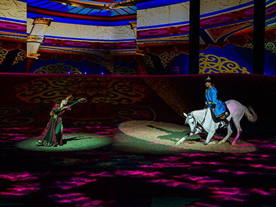 在一個(gè)小時(shí)的劇目演出中,駿馬馳騁,人馬共舞。既有金戈鐵馬的雄奇,又有一人一馬的溫情;既有并肩作戰(zhàn)的奮勇,也有古典舞步的風(fēng)雅?!肚Ч篷R頌》不僅僅是一場馬文化駐場演出,難忘的是其中傳遞的人與馬、人與草原、人與自然的和諧深情…… 精雕細(xì)琢,從“馬秀”演變?yōu)椤皠∧俊?/b> 《千古馬頌》的故事是從2014年開始的。這一年,以蒙古馬命名的“吃苦耐勞,一往無前”精神傳遍大江南北,內(nèi)蒙古自治區(qū)政府聚齊了歌舞團(tuán)、烏蘭牧騎、京劇團(tuán)、雜技團(tuán)等9個(gè)院團(tuán),將蒙古馬精神和內(nèi)蒙古得天獨(dú)厚的旅游資源相結(jié)合,傾力打造“中國第一場馬文化全景式綜藝演出劇目”。 “最初,演出只是叫‘馬秀’,并沒有一個(gè)完整的故事線?!薄肚Ч篷R頌》執(zhí)行導(dǎo)演陳冬說道。陳冬自2014年7月加入演出項(xiàng)目,經(jīng)歷了劇目成長變化的全過程。他表示,項(xiàng)目前三年一直是在探索嘗試中進(jìn)行的?!皠”静⒉皇悄骋粋€(gè)時(shí)間確定的。第一年是多個(gè)節(jié)目的簡單拼接,目的是展現(xiàn)內(nèi)蒙的民族習(xí)俗和馬背技巧。第二年開會時(shí),突然想到‘遷徙’一幕可以有生命誕生。經(jīng)過三年,我們才真正找到故事線?!?/div> 2016年,一個(gè)講述牧人之子在馬背上成長,與馬相互守望的故事終于成型了。“就像一條珍珠項(xiàng)鏈一樣,嬰兒出生、少年成長、戀愛結(jié)婚、出征衛(wèi)國等情節(jié)每個(gè)都是一顆珍珠,我們用一條線把它們穿起來了?!标惗f道。 劇中,“我”出生在一個(gè)以馬背為家,四季游牧的家庭。少年時(shí)期的“我”被父親扶上馬背,從此與馬相伴而行,歷練成長。時(shí)光飛逝,“我”逐漸成為一名真正的牧人,父親把自己心愛的白駿馬送給了“我”,并將套馬桿交到我手里,我策馬揚(yáng)鞭,在遼闊的草原恣意馳騁?!拔摇彬T著白駿馬,在馬上與心愛的姑娘相戀,在國家危機(jī)時(shí)刻騎馬奔赴疆場,英勇作戰(zhàn)。馬兒陪伴“我”走過人生幾大重要節(jié)點(diǎn),似戰(zhàn)友似親人。在白駿馬生命的最后時(shí)刻,“我”依然陪他左右,深情相送。 陳冬表示,如今的《千古馬頌》已經(jīng)突破了早期演出的“馬秀”概念,而是一場“賦予馬角色、用馬講故事、有溫度、有技術(shù)”的舞臺劇目?!皩Ρ葢敉庋莩?,舞臺演出要求更高,馬匹走上舞臺,需要動作和情感的細(xì)膩、精準(zhǔn)、嚴(yán)絲合縫?!彼缡钦f?!肚Ч篷R頌》將馬術(shù)與雜技、舞蹈、音樂等特色民族元素完美融合,觀眾既能欣賞民族馬術(shù)、馬背雜技,同時(shí)還能看到經(jīng)典的蒙古族歌舞樂等,處處體現(xiàn)內(nèi)蒙文化風(fēng)情。 劇中,牧人在馬背上經(jīng)歷的每個(gè)成長階段都被提煉成單獨(dú)一個(gè)章節(jié),分別為《天降神駒》《遷徙》《馬背家園》《馬背傳奇》,每個(gè)章節(jié)都有亮點(diǎn)。劇院沿用舞臺表演的高標(biāo)準(zhǔn),加入了不少“情理之中,意料之外”的高水平技術(shù)性表演,比如牧人出生時(shí)的蒙古長調(diào)演唱,牧人少年時(shí)游戲的騎馬撿哈達(dá)、牧人戀愛時(shí)的人馬綢吊雜技表演,以及出征時(shí)的薩滿祈福舞蹈等等,配合高科技聲光電技術(shù)、裸眼3D技術(shù),五個(gè)部分生動演繹了人馬結(jié)緣的溫情、馬背家園的祥和、百駿出征的壯觀、千古馬頌的絕唱。 經(jīng)歷了6年的發(fā)展,《千古馬頌》表演地從錫林浩特轉(zhuǎn)而落戶呼和浩特市內(nèi)蒙古少數(shù)民族群眾文化體育運(yùn)動中心,總表演場次超過300場,接待觀眾超過20萬人次,成為了內(nèi)蒙古文化旅游的拳頭產(chǎn)品。作為內(nèi)蒙古自治區(qū)文化產(chǎn)業(yè)重點(diǎn)項(xiàng)目,《千古馬頌》自立項(xiàng)以來得到了國家和自治區(qū)的多項(xiàng)政策扶持,先后獲得2014年自治區(qū)文化產(chǎn)業(yè)發(fā)展資金和2015年國家藝術(shù)基金的資助。2014年榮登國內(nèi)馬業(yè)十大新聞榜,2015年被中國馬業(yè)協(xié)會評為“中國馬文化推廣獎”,2018年獲得“第八屆旅游投資艾蒂亞獎”金獎。 自治區(qū)黨委書記李紀(jì)恒曾在全區(qū)旅游發(fā)展大會上強(qiáng)調(diào):“要積極培育旅游新產(chǎn)品新業(yè)態(tài),開發(fā)更多像草原那達(dá)慕、鄂爾多斯婚禮、千古馬頌?zāi)菢拥娜^產(chǎn)品,給旅游植入生態(tài)的根,文化的魂,文明的韻”。 他表示,“通過旅游拳頭產(chǎn)品《千古馬頌》,把首府呼和浩特市打造成為國內(nèi)外知名的旅游目的地,拉動首府經(jīng)濟(jì)發(fā)展,以實(shí)際行動落實(shí)國家和自治區(qū)文化旅游發(fā)展戰(zhàn)略,推動自治區(qū)全域旅游發(fā)展和供給側(cè)結(jié)構(gòu)性改革,對帶動、促進(jìn)呼和浩特乃至全區(qū)文化旅游產(chǎn)業(yè)的整體發(fā)展具有深遠(yuǎn)的影響?!?/div> 持續(xù)創(chuàng)新,“人、馬、狼”元素日趨豐滿 一場馬文化舞臺演出劇目,最難的問題是如何讓馬適應(yīng)舞臺?!肚Ч篷R頌》男主演張國強(qiáng)表示,演出中馬的狀態(tài)有很多不確定性,這就要求騎手演員和馬匹要提前做好配合和磨合。騎手們每天都和馬在一起,除了完成日常訓(xùn)練,還要和馬溝通感情,時(shí)間才是馴馬的關(guān)鍵?!斑@場演出中,馬才是本位的,人都是第二位的。演出中的一個(gè)動作,