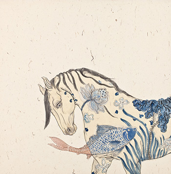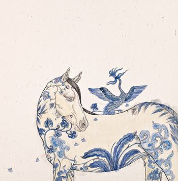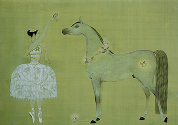 《青花·鳳》紙本 我看張菱的畫會(huì)和別人有不太一樣的感受,會(huì)有一種特別的驚喜在里面。就像你分別有兩位過(guò)從甚密的老朋友,你以為他們之間并不熟識(shí),突然有一天發(fā)現(xiàn)他們竟然是親戚。 大約在十年前,接到南開同學(xué)的電話,跑到北京去看張菱的畫展,那種驚喜感一下子就出來(lái)了。張菱是我大學(xué)的同學(xué),自然是熟悉,她的那種幻漫式的水墨,也是我閱畫時(shí)最愛關(guān)注的題材,所以看到這兩種都熟悉的東西碰撞在一起,自然就覺得出乎意料。因?yàn)榭傆X得張菱會(huì)按照那一路唯美婉約的路子走下去,讓外人看上去,也會(huì)覺得畫如其人,很完整統(tǒng)一的感覺,沒(méi)有什么跳躍感。 但是我想她終究是叛逆了一下,順了自己的內(nèi)心。 《扇》紙本 有時(shí)候所有的念頭一下子都涌出來(lái),就像一個(gè)瓶子里的貝殼,你把瓶子倒過(guò)來(lái)的時(shí)候那些貝殼都會(huì)卡在瓶子口那里,一個(gè)也倒不出來(lái)。有意思的念頭也會(huì)是這樣,想法太多就會(huì)都卡住了,彼此擠在一起,誰(shuí)也出不來(lái)。所以,還是讓那些念頭孤零零地存在吧,誰(shuí)也不礙著誰(shuí),一下子也就出來(lái)了。 我直覺張菱的畫就有這么一種隨意的傾訴在里面。我們搞一件藝術(shù)價(jià)品出來(lái),其實(shí)最怕弄得特別有儀感。搞一個(gè)特別冠冕堂皇的出發(fā)點(diǎn)啊,做特別充分的準(zhǔn)備啊,最后一準(zhǔn)弄得跟大會(huì)發(fā)言稿一樣,正確、嚴(yán)肅,卻空洞無(wú)趣。我覺得最好的藝術(shù)作品或許大都是無(wú)聊的產(chǎn)物,美院系統(tǒng)開一個(gè)通長(zhǎng)無(wú)趣的全體會(huì),與會(huì)者先發(fā)一個(gè)速寫本和鉛筆,會(huì)后收集起來(lái),準(zhǔn)會(huì)是一個(gè)精彩的小品素描展。人的那種無(wú)聊、無(wú)奈全都傾瀉出來(lái)了。越是活在無(wú)聊的環(huán)境里,就越是要追求點(diǎn)小意思吧,這或許是本能。 《舞馬圖》絹本 中國(guó)水墨通常會(huì)提供給動(dòng)物很大的舞臺(tái),這些動(dòng)物其實(shí)都代表著人類的情感與價(jià)值承載。因?yàn)樵谏钪?,在旅行中與那些純種賽馬的近距離接觸,張菱對(duì)馬的氣質(zhì)與情感,也有了難以言表的調(diào)察,這些氣宇軒昂的馬兒,在張菱的畫里,褪去了神秘的外表,卻走向了另一種神秘,那是心境里的神秘。張菱畫里的馬兒,不經(jīng)常在奔跑,卻時(shí)常在舞蹈??匆姀埩獾漠?,也時(shí)常會(huì)有一種設(shè)想,如果唐宋那些丹青妙手,能夠穿越到今天,他們會(huì)怎樣利用今天的材料來(lái)繪畫他們當(dāng)時(shí)所捕捉的題材。我覺得或許會(huì)成為張菱的那些馬,或許就是唐代的那些名馬,她描繪的女郎,自然也是伴著唐馬的上古名伶。對(duì)于一個(gè)生長(zhǎng)在古長(zhǎng)安,成家生活工作在北京的女藝術(shù)家,這些線索不是獨(dú)立存在的,其中有著讓人無(wú)法忽略的關(guān)聯(lián)。 《白駒過(guò)隙》絹本 張菱的畫里,總是離不開一匹馬,一匹漂亮的,不尋常的馬。我大約知道這匹馬是從哪里飛躍而至的,它的額頭上方,會(huì)寫著清淳,透過(guò)這清淳,是眸里的遠(yuǎn)方??罩械淖酌R飄揚(yáng),它的背上空空蕩蕩,但是我們都知道,那里承載著是張菱的遠(yuǎn)方。如何心系鄉(xiāng)野,情傾古人。當(dāng)畫室外的陽(yáng)光鋪陳在樓間的草坪上,張菱的畫筆也開始了不尋常的描繪。這描繪也等同是撕裂,撕裂庸長(zhǎng)的時(shí)光,讓一匹馬跑起來(lái),你湊近張菱的畫,會(huì)聽見盛裝背景的交響。 《青花·鯉》紙本 張菱的俏氣還體現(xiàn)在她對(duì)于線條的掌控與把握。對(duì)于一個(gè)從少時(shí)便沉浸在傳統(tǒng)水墨時(shí)間的丹青繪手,能夠從纖纖素紙中拽起幾根爽氣而又沉穩(wěn)的線條是本事,也是愿望,能將此種愿景拴住自己的夢(mèng),我想,張菱的這些畫,也就這么成了。 《芭蕾·舞》絹本 其實(shí)每一個(gè)人心里都住著一匹馬,它們有的在河岸上親吻河水;有的在天空中奔跑;有的在草原上忽隱忽現(xiàn);還有的隱匿在喧囂街頭。而張菱的這匹馬,則一直在畫布上舞蹈。在這個(gè)既古典浪漫又解構(gòu)現(xiàn)實(shí)的畫面里,你一定會(huì)以為那個(gè)舞蹈的女孩是張菱描繪的她自己,我更相信這只是一個(gè)心靈的替身。那個(gè)舞蹈的女孩,更多的代表著繪畫本身,代表著若即若離,你撫得著,卻又抓不住的藝術(shù)。 就像我們共同經(jīng)歷過(guò)的青春,它似乎漫長(zhǎng),卻又轉(zhuǎn)瞬即逝,那么我們當(dāng)初的夢(mèng)想呢,它是離我們近了,抑或是遠(yuǎn)了。為了讓這夢(mèng)想更清晰,更龐大,更真實(shí),我們情愿變成一只螞蟻,躲在草叢下,像馬一樣,舞蹈。 圖/張菱 文/天津美術(shù)館館長(zhǎng) 馬馳 |