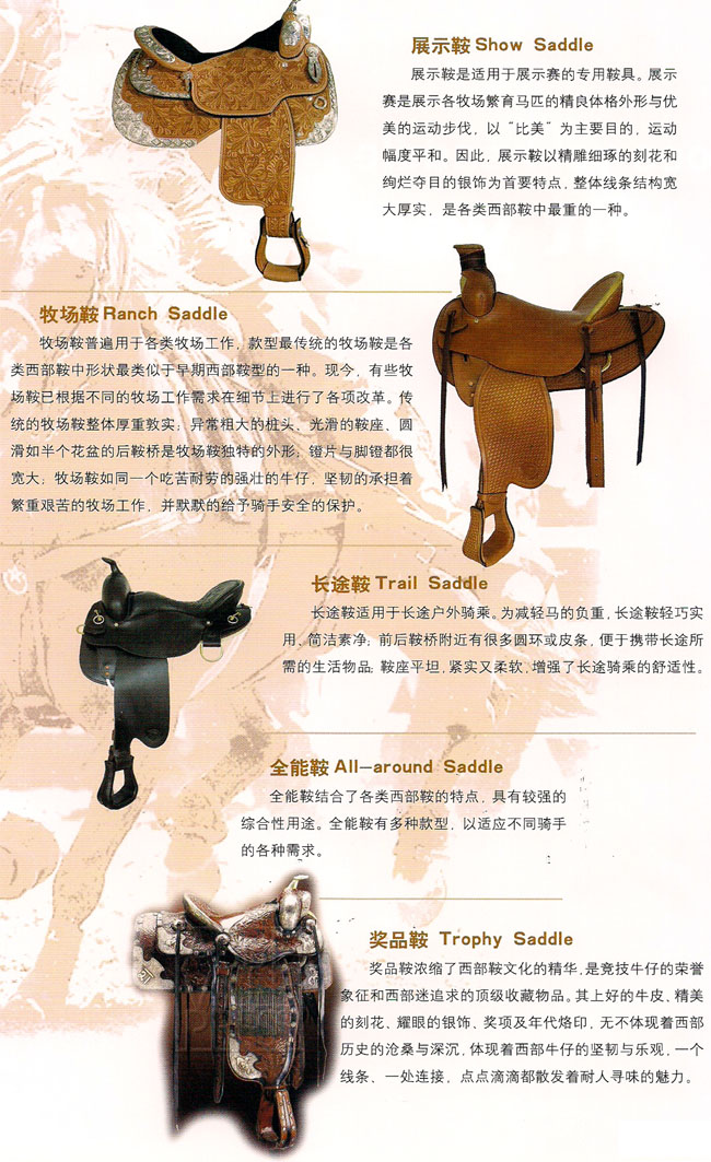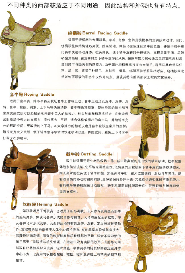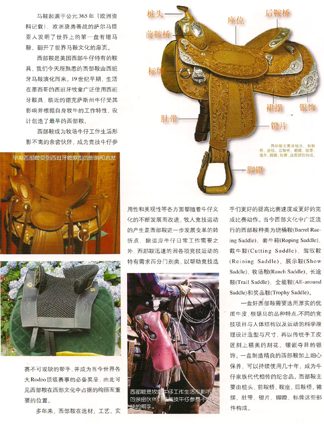 : 西部鞍是美國西部牛仔特有的鞍具,我們今天所熟悉的西部鞍由西班牙馬鞍演化而來。19世紀早期,生活在墨西哥的西班牙牧童廣泛使用西班牙鞍其,臨近的德克薩斯州牛仔受其影響并根據自身牧牛的工作特性,設計創(chuàng)造了最早 ...