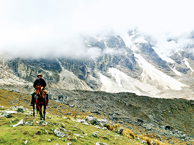 神廟馬丘比丘,位于南美秘魯境內(nèi),一個令人無比神往的圣地。她是世界上現(xiàn)存的最大印加文明遺址,也是印加人的精神歸宿。沿著Salkantay印加古道騎馬前往馬丘比丘,是對印加人神圣避風港的探索,也是對物質(zhì)、文化和精神轉(zhuǎn)型之旅的一次實踐。在這次HarborHouseLife行者之路組織的“迷失的山徑”之旅中,HHL探險隊的成員們將以騎行的方式擁抱南美山區(qū)原始的自然美景,體驗15個獨特的生態(tài)系統(tǒng),并在駕馭不斷變化的海拔高度時激發(fā)我們挑戰(zhàn)自我的能力和不同的地形。 小鎮(zhèn)庫斯科 完成了巴塔哥尼亞的穿越騎行后,HHL探險隊一行歷經(jīng)重重轉(zhuǎn)機,終于到達了美麗的秘魯小鎮(zhèn)庫斯科。古老的小鎮(zhèn)色彩斑斕,處處洋溢著濃郁的古印加文明,與現(xiàn)代文明交相輝映,相得益彰。印加婦女們穿著艷麗的民族服飾,在沿街售賣她們編制的印加風格的手工藝品、毛毯、圍巾等等。經(jīng)過古老的街道與山區(qū),車輛盤旋著爬上了山頂。今天的第一站是參觀Mollepata山村的 Quillarumiyoc考古遺址,探險隊一行人到達了美麗的El Pedregal農(nóng)舍。我們在這里享用當?shù)氐奶厣绮?,美麗古樸的庭院里令人印象深刻的是處處都是兩三層樓高的仙人掌?/div> 向?qū)?Leo 是西班牙人的后裔,恰巧與我同名,隊員們常因不知道叫的是誰而鬧笑話。他向我們一一介紹了當?shù)氐霓r(nóng)業(yè)和文化。當他把我們帶到一排大屋子前隆重介紹時,一陣撲面而來的異味引發(fā)了我的好奇心,朝屋內(nèi)望去只見整齊排列著一排排籠子,籠子內(nèi)飼養(yǎng)著一只只可愛的荷蘭豚鼠。我心中不由地想:當?shù)厝苏娴暮苡猩钋槿ぃ駝t怎么會養(yǎng)這么多寵物。 特別的食物 參觀完畢后,大家開始了精致的午餐。主菜上來后,向?qū)虼蠹衣≈氐慕榻B了一道最有當?shù)靥厣拿朗常@時我才聽懂向?qū)f美食居然就是我們剛才參觀的屋子里的荷蘭豚鼠,由于印加山區(qū)自古食物匱乏,人們會飼養(yǎng)豚鼠作為食物。向?qū)崆檠笠绲叵蛭覀兘榻B了這特別的美味并演示了當?shù)厝藰藴实氖炙撼苑?,我的腸胃一陣痙攣,最終還是沒能夠鼓起勇氣嘗試這道美食。 忠實的旅伴 吃完午餐,我們終于到達了 Coronilla Ranch 見到了我們忠實的旅伴——這次穿越行所要騎乘的馬兒們,她們都是非常駿美的阿拉伯馬和夸特馬,考慮到山區(qū)道路的艱險,我選擇了性格更穩(wěn)定溫和的夸特馬。大家終于從巴塔哥尼亞狂暴的寒風中來到了較溫暖濕潤的南美山區(qū),心情輕松了好多,換上了更為輕便的騎行衣物,整理好裝備把隨身的行李放入鞍包就出發(fā)了。馬匹依次走上了狹窄陡峭的山道,同行的還有幾位來自首都利馬的姑娘一起加入了我們騎行的隊伍。其中有一位是我們的隊醫(yī)瑪利亞,負責對穿越途中隊員可能出現(xiàn)的高原反應(yīng)與緊急狀況進行救治,有了這樣的保障大家心中更是踏實了許多。一路談笑風生欣賞著沿途壯美的山景,心情愉悅極了。走到半山腰道路逐漸陡峭艱險起來,山路上怪石嶙峋布滿了大大小小的尖石子,非常擔心馬兒脆弱的蹄腿會受傷,尤其是腿部更為纖細的阿拉伯馬。但這些馬兒卻熟練靈巧的踩著每個石頭縫依著山勢攀援而上,其能力不得不令人贊嘆。 山勢越發(fā)陡峭,向?qū)円卜殖闪蓑T馬與徒步兩隊,他們的專業(yè)度同樣令人稱贊。騎馬向?qū)Т舐暤赝▓舐窙r并提醒每位隊員控制著行進的速度,而徒步分隊的印加向?qū)兎路鹗煜み@里的每一塊石頭,他們?nèi)缤澈镆话忝艚莸脑诔缟骄X間輾轉(zhuǎn)騰挪,快速地登上山頂?shù)闹聘唿c,用對講機為探險隊員傳回路況消息,保護隊員和馬匹的安全。在道路過于艱險與陡峭的地方,他們會悉心地提醒大家下馬小心的牽行通過,令探險隊員們有了滿滿的安全感,并且會適時地為大家拍下精彩難忘的穿越視頻。他們淳樸的笑容和額頭上的汗水令我感動。 Salkantay高峰 馬隊在陡峭的印加古道上越登越高,道路也越來越狹窄,幾步之外就是萬丈深淵,有些道路甚至接近垂直,沿途還時常有當?shù)厝蓑?qū)趕著馱隊快速地依山而下。當?shù)氐鸟R匹與我國的蒙古馬非常相似:個頭小、耐力好。“會車”的時候我們上山的馬隊不得不靠著懸崖邊前行為馱隊讓出道路,而腳下的碎石不時地滑落深淵,頗有些驚心動魄的感覺。這條印加古道類似我們滇藏的茶馬古道,不同的是這條古道至今還是當?shù)卮迓溥\送物資和通勤的主干道,而數(shù)百年前的印加王朝的王公貴族們也是通過這條古道到達馬丘比丘,去夏宮避暑祭祀。 穿過一片濃厚的云霧,馬隊漸漸地走上了山頂?shù)难┚€,我看了下高度表:海拔4282米。一抬頭,Salkantay雪山的主峰便豁然出現(xiàn)在視野中,Salkantay山峰海拔6270米,是印加神話中第二神圣的高峰,也是該地區(qū)最高的山峰。遠處雄偉壯美的雪山在陽光的照耀下閃爍著野性的光芒,而山腰間繚繞的云霧中電閃雷鳴仿佛久居著神靈,令人不禁對大自然肅然起敬。此時高原反應(yīng)使胯下的馬兒開始大口大口地喘起了粗氣,不得不時常停下安撫馬兒讓它把氣喘勻乎,自己的腦袋也開始有些隱隱作痛。向?qū)ё尨蠹疑允滦菹⒘艘幌拢a充了些食物和飲水之后開始引領(lǐng)大家往頂峰發(fā)起了沖刺。 在翻越了眾多的巨石陣和碎石灘之后,人馬都漸漸適應(yīng)了海拔。大家一鼓作氣策馬奔跑著、