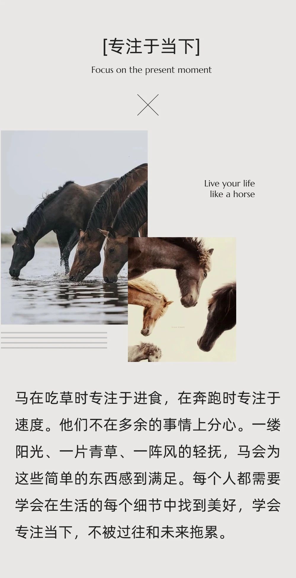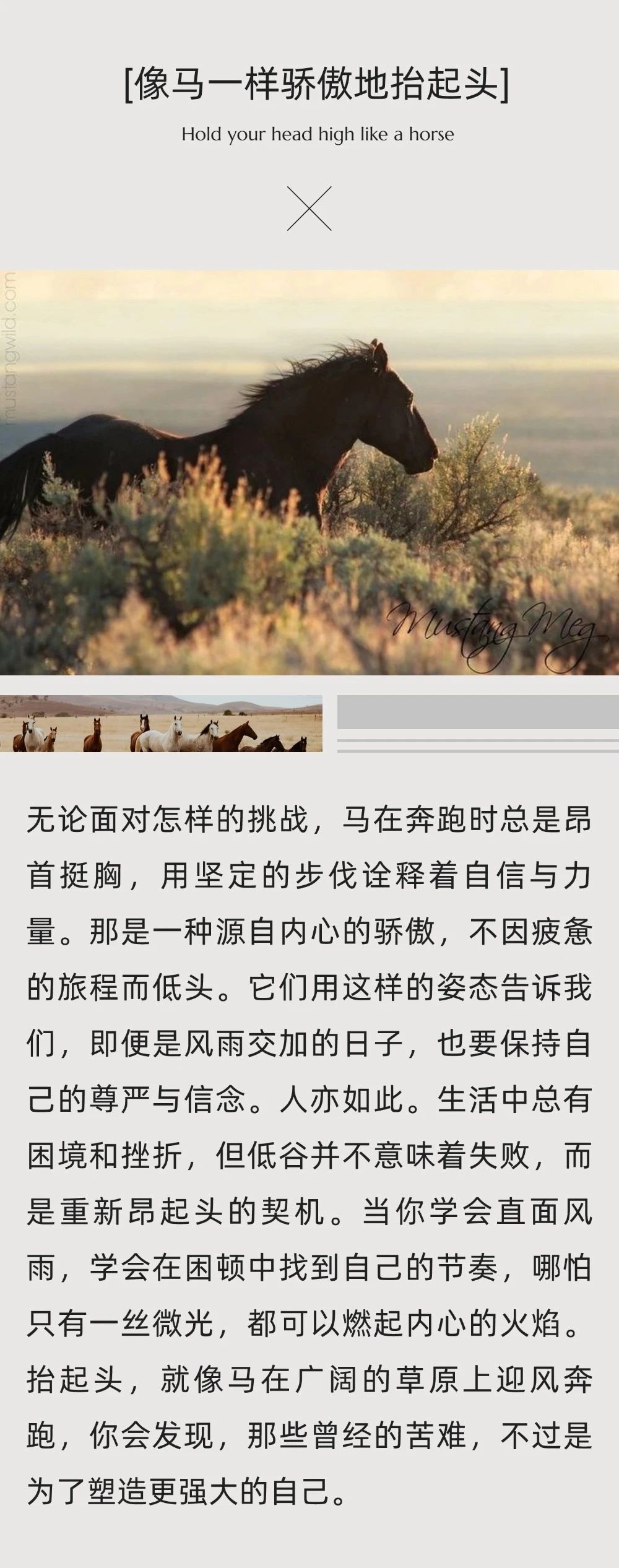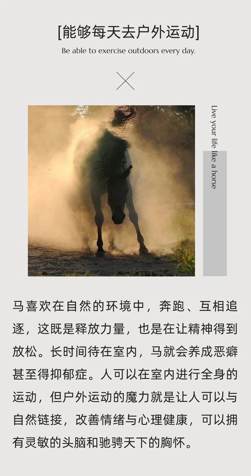 或許我們都想過要如何讓生活更有力量、更有方向,但答案或許比我們想象得簡單:把自己活成一匹馬。馬是自由的象征,他們無懼風(fēng)雨,奔跑在廣闊的天地間。他們每天的休息時(shí)間很短,卻總能以最好的狀態(tài)迎接下一段旅程。他們在奔跑中昂首挺胸,無論路途多么坎坷,都從不喪失自信與驕傲。