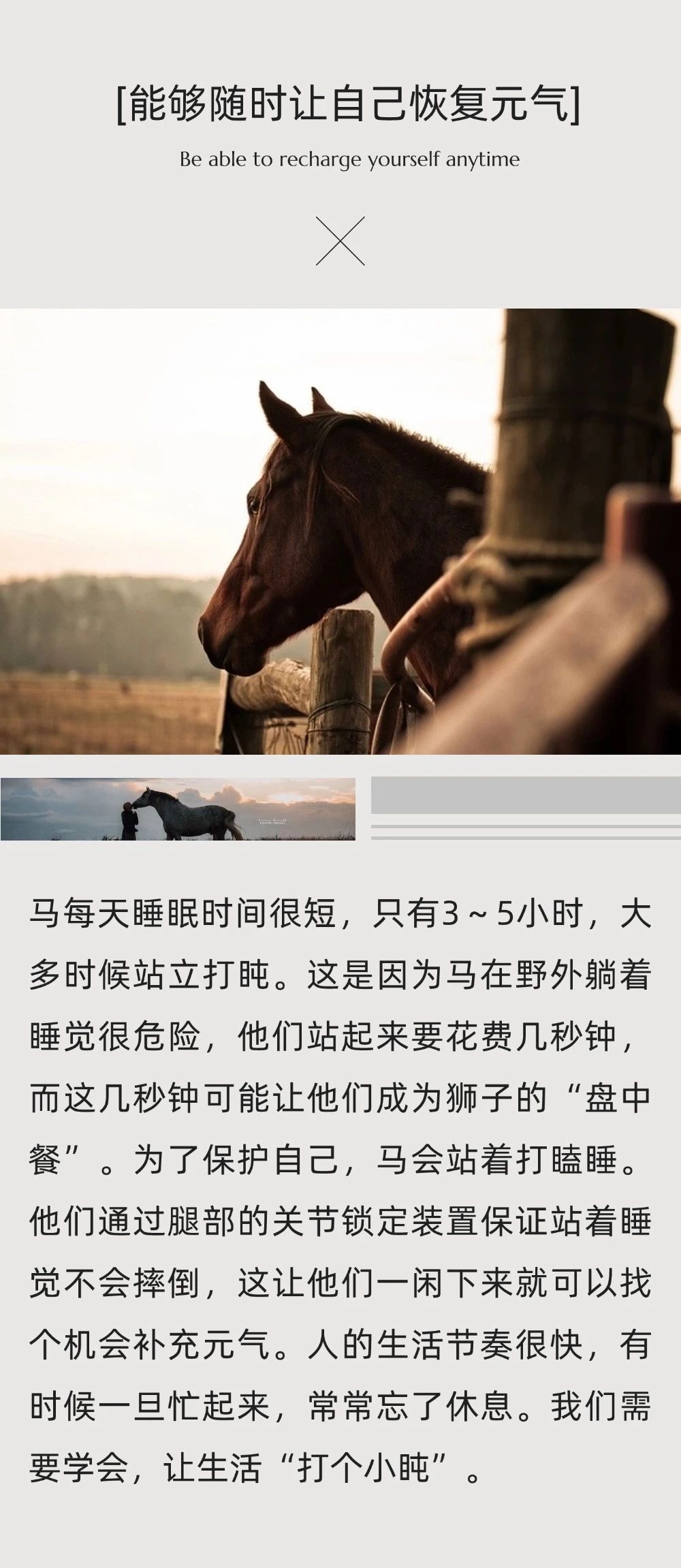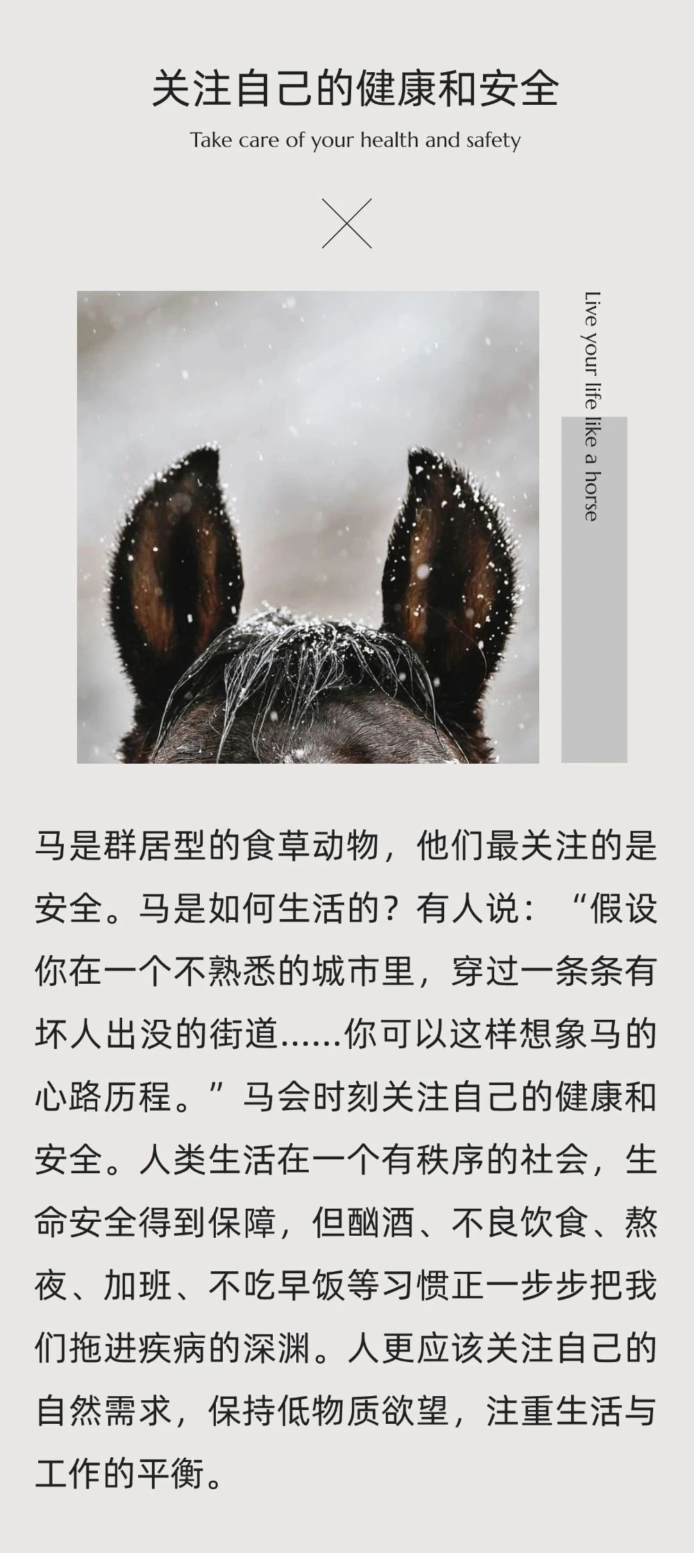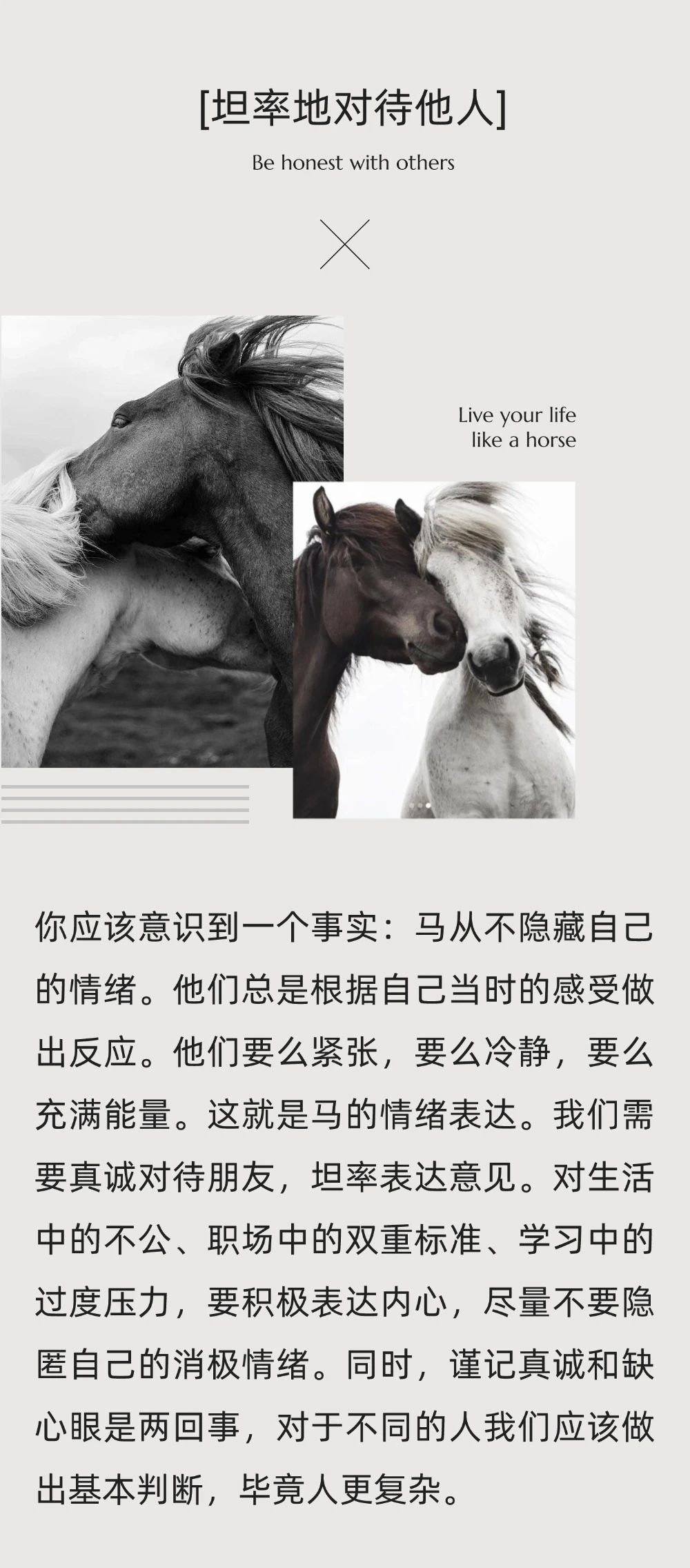 或許我們都想過要如何讓生活更有力量、更有方向,但答案或許比我們想象得簡單:把自己活成一匹馬。馬是自由的象征,他們無懼風(fēng)雨,奔跑在廣闊的天地間。他們每天的休息時(shí)間很短,卻總能以最好的狀態(tài)迎接下一段旅程。他們在奔跑中昂首挺胸,無論路途多么坎坷,都從不喪失自信與驕傲。