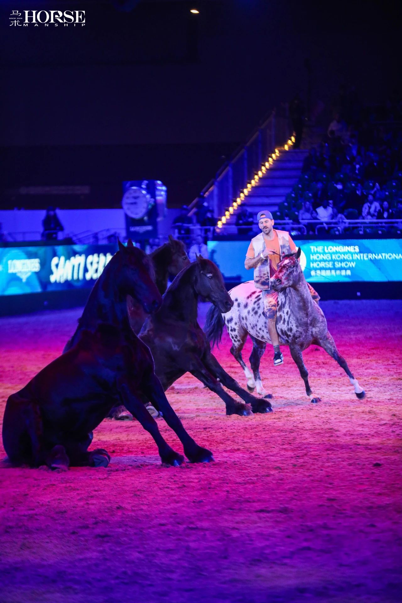 馬術表演由西班牙藝術家Santi Serra攜四匹馬,為現(xiàn)場帶來了震撼人馬表演。在無鞍無韁的狀態(tài)下,Serra僅通過肢體傾斜與低聲指令,便引導馬群完成疾馳驟停、同步旋轉、臥倒起立等高難度動作。人馬合一的藝術境界讓全場響起了熱烈的掌聲。