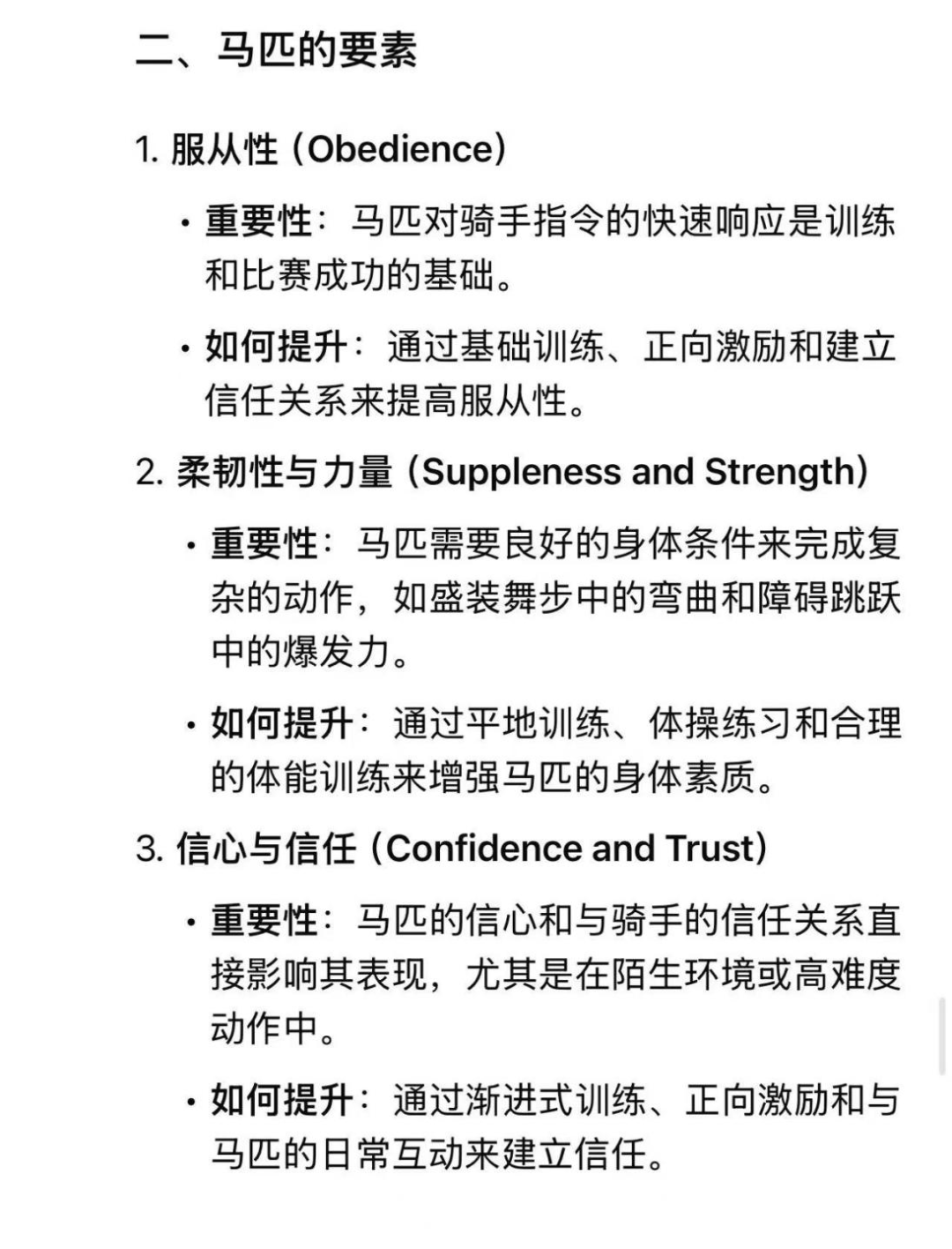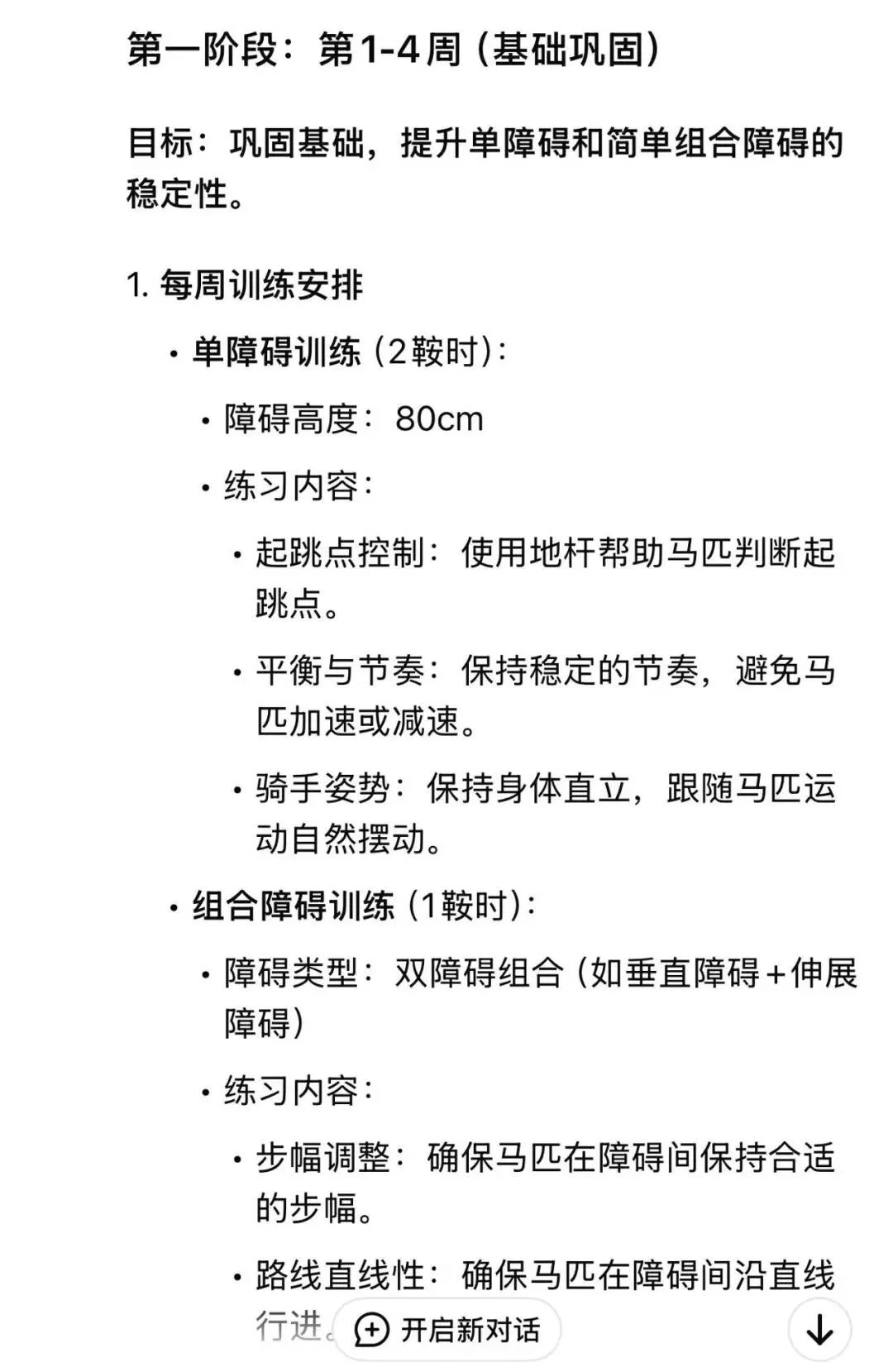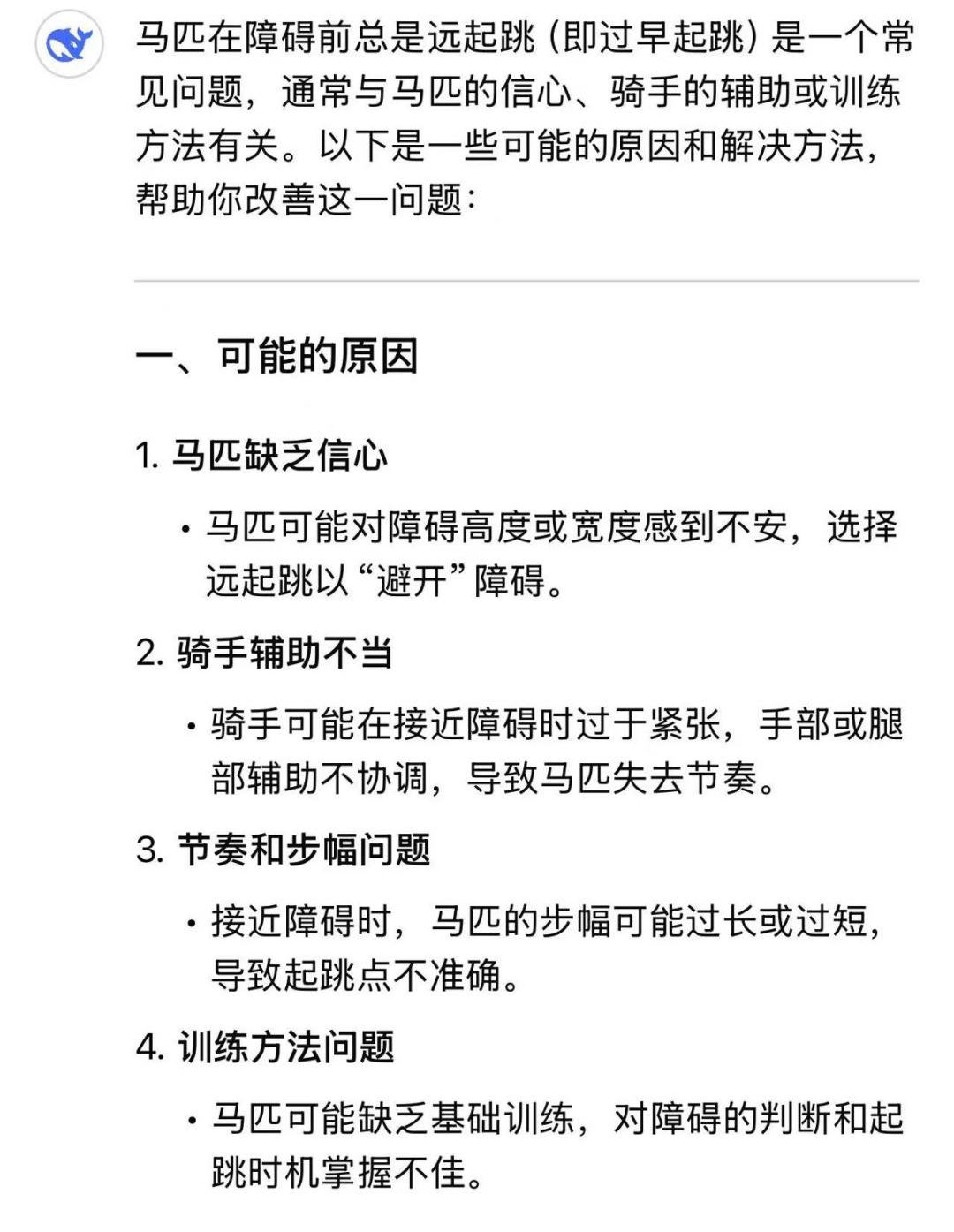 在科技飛速發(fā)展的今天,人工智能技術正逐步滲透到各個領域,為我們的學習和生活帶來極大便利。 對于馬術愛好者而言,如何利用DeepSeek這樣先進的人工智能工具,更高效地學習馬術,成為了一個值得探討的話題。 在學習馬術的過程中,DeepSeek可以為我們提供哪些幫助呢?以下有幾個方向可供大家參考。 1 獲取馬術基礎知識、進行問題解答 理論是學習的基石,而DeepSeek是一座巨大的知識寶庫,涵蓋了馬術領域方方面面的內容,幫我們詳細解答困惑。 相比于使用傳統搜索引擎查找資料,DeepSeek能夠讓我們更快速、全面的獲取信息,為之后的提升打下堅實的基礎。 例如: 1. 馬在障礙前總是遠起怎么辦? 2. 馬術中最重要的要素是什么? 2 制定學習計劃 只需要向 DeepSeek 提供一些關鍵信息,例如目前的水平(多少鞍時的騎乘經驗)、每周能夠投入到馬術學習中的具體時長。 DeepSeek 就會綜合這些信息,規(guī)劃適合不同人群的專屬學習計劃。 3 生成訓練日志模板 在馬術的學習過程中,一份清晰規(guī)范的訓練日志能幫助我們更好地總結經驗、發(fā)現問題,DeepSeek 可以協助生成一份實用的訓練日志模板。 模板內容可以包括基本信息、馬匹信息、訓練內容、訓練表現,以及遇到的問題和改進措施。 4 其他方向 體能訓練建議 設計適合騎手的核心力量、柔韌性和耐力訓練計劃。 心理調整 當在訓練時或比賽中感覺緊張的時候,DeepSeek可以告訴我們如何保持冷靜和專注。 資源推薦 DeepSeek可以為我們推薦馬術相關的書籍、視頻以及國內外賽事信息與參賽建議。 ———————————————————— 提問小技巧 如果你覺得在使用DeepSeek的時候,總是得不到令自己滿意的回答,感覺用起來有一些力不從心的話,這時候就需要學習一些提問的技巧啦。 ———————————————————— 綜上所述,DeepSeek 可以成為馬術愛好者的“24小時馬術顧問”,幫助我們在理論學習、問題解決和訓練規(guī)劃中事半功倍。 需要注意的是,盡管 DeepSeek 能在馬術學習中發(fā)揮重要作用,但它無法完全替代專業(yè)教練的現場指導和自己的親身實踐。 在學習馬術的過程中,一方面,我們應充分利用 DeepSeek 高效便捷的特性,快速積累知識、優(yōu)化訓練方法;另一方面,更重要的還是借助專業(yè)教練的悉心指導和親身實踐的反復磨礪,真正掌握馬術的精髓,盡情領略這項運動所蘊含的獨特魅力與無限樂趣。 ———————————————————— 文/王夢媛 DeepSeek 給你的馬術學習提供過什么幫助呢?請在下方評論區(qū)分享給大家吧。 |