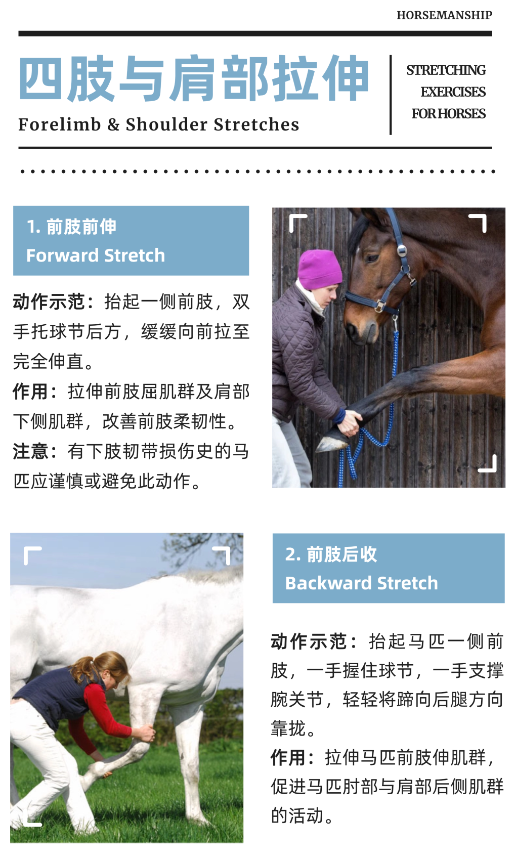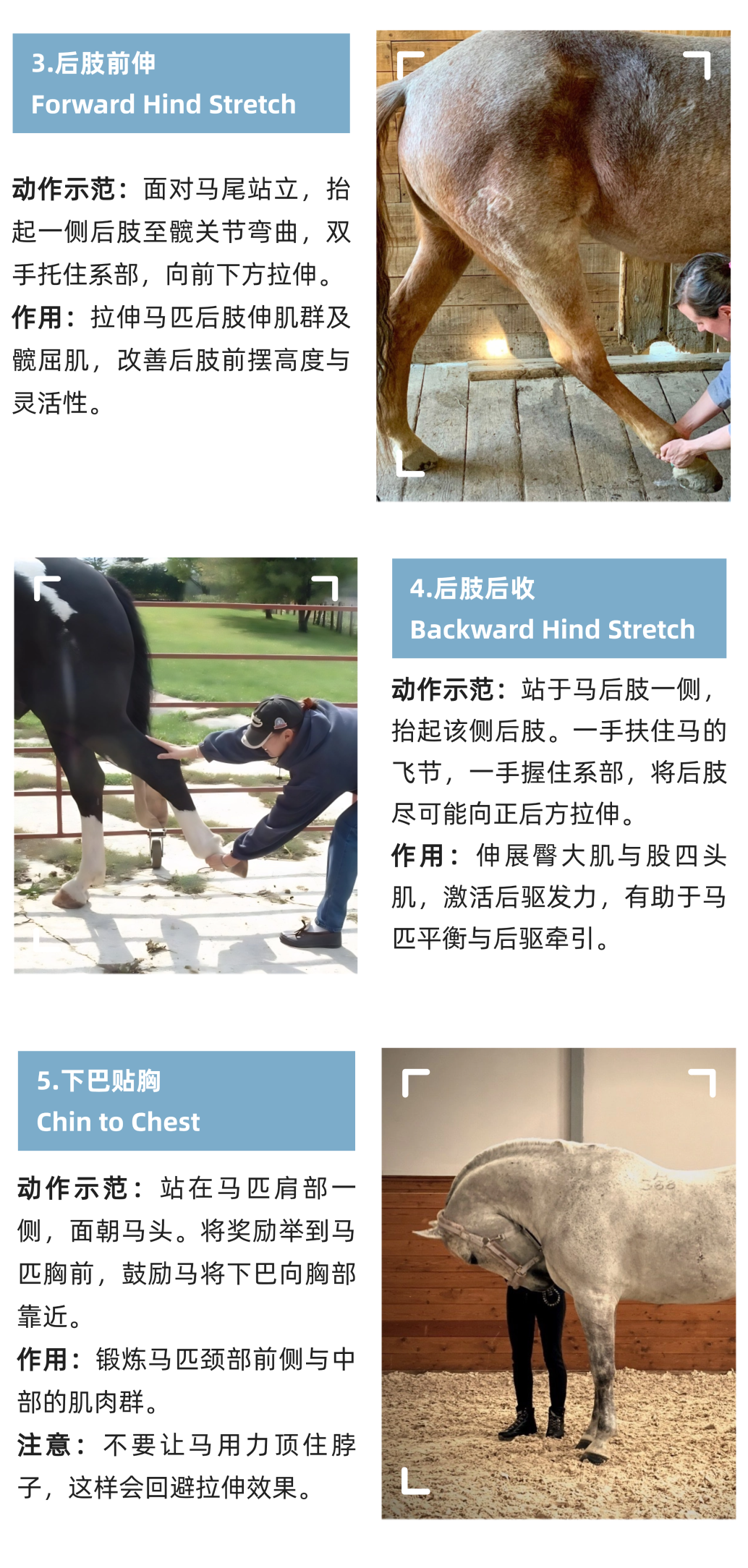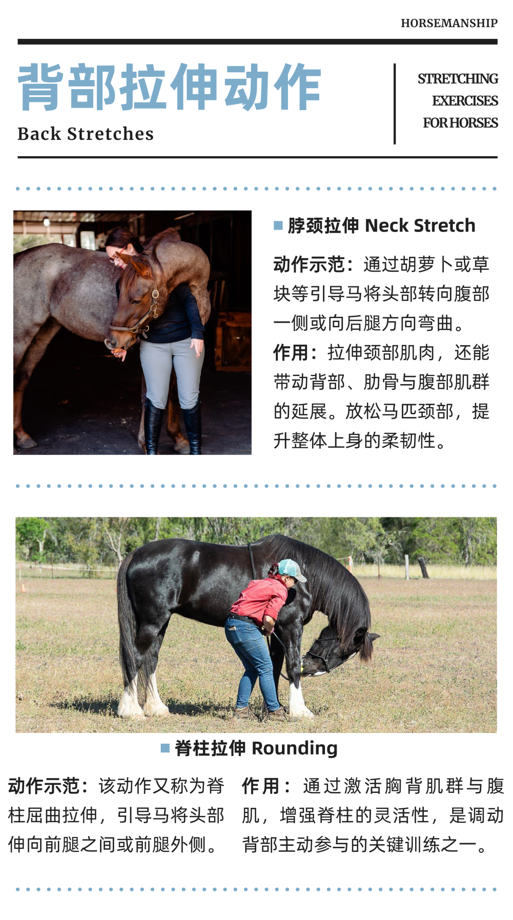 一匹表現(xiàn)出色的馬離不開科學(xué)的訓(xùn)練,而拉伸訓(xùn)練也是其中不可忽視的一環(huán)。無論是備戰(zhàn)比賽還是日常訓(xùn)練前后,系統(tǒng)的拉伸能幫助馬匹激活深層肌群,增強柔韌性與協(xié)調(diào)性,從而更好地完成各類動作指令。更重要的是,它有助于降低運動損傷的風(fēng)險,提高長期運動表現(xiàn)與健康水平。 本文將分享幾組適用于馬匹不同部位的基礎(chǔ)拉伸動作,幫助馬匹呈現(xiàn)更流暢、更舒適的運動表現(xiàn)。 把拉伸融入日常護(hù)理和訓(xùn)練中,不只是為了讓馬兒更柔軟靈活,更是為了他們能在騎乘中更輕松,也更舒服。規(guī)律的拉伸能幫助增強力量、減少受傷幾率。讓每一次訓(xùn)練都變成它們更健康的起點。 |
