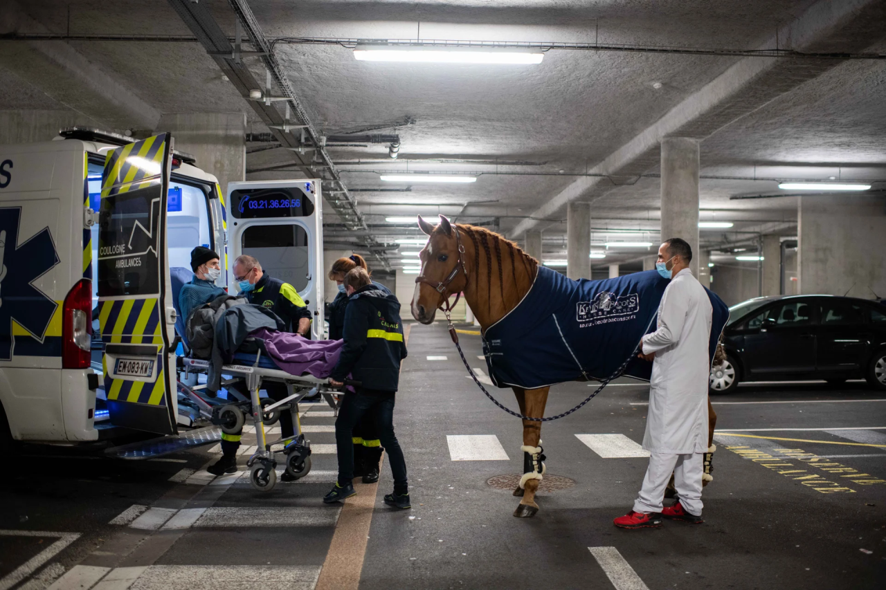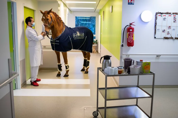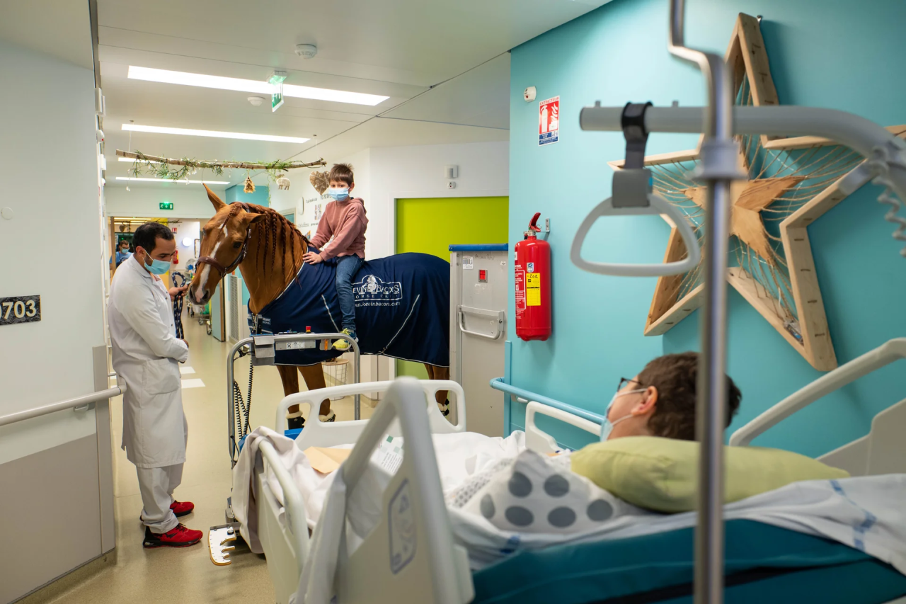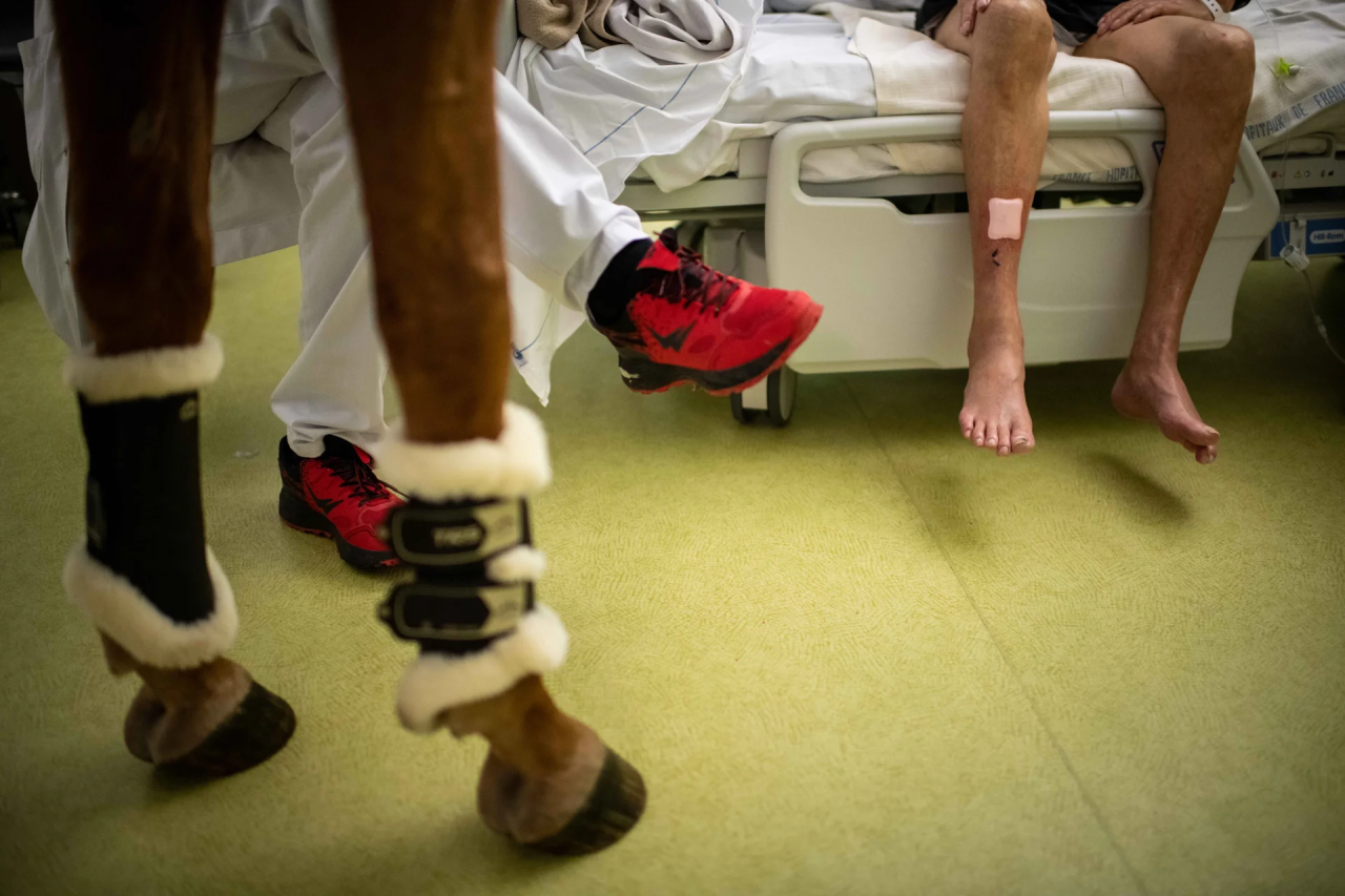 深夜的加萊港海霧漫卷,病房的白熾燈總會在某個時刻突然刺眼?;煴靡?guī)律的滴答聲里,瑪麗昂(Marion)的手指已經握不住兒子柔軟的發(fā)梢。止痛藥的效力退去時,她聽見馬蹄踏過水泥地的回聲——那是一匹栗色的馬,睫毛垂落,鼻息溫熱如春茶初沸。 人們說它是動詞“陪伴”的另一種寫法,說它是法國北部城市加萊的“動物天使”,它就是一匹在馬術表演領域曾贏得無數掌聲的馬,它的名字叫“Peyo”。 墜落人間的“動物天使” 今年19歲的“Peyo”,擔任“醫(yī)生”一職已經9年了。在這9年里,它的身影頻繁出現在加萊的養(yǎng)老院、醫(yī)院的姑息治療病房、兒童病房和精神病房,與眾多病人相遇,又無奈地與許多病人道別。而“Peyo”能成為一名“醫(yī)生”,離不開它的主人哈森?布沙庫爾(Hassen Bouchakour)。 11年前的“Peyo”尚在云端。在彩燈裝飾的馬術表演場里,它的四蹄翻涌著銀色的海。旋轉、高級快步、后退、兩步一換,“Peyo”和哈森留下了無數精彩瞬間。哈森說:“‘Peyo’的鬃毛散落著金箔,落幕時總有小孩想掙脫媽媽的手來摸摸可愛的它。” 哈森?布沙庫爾和“Peyo”原本是馬術表演圈里的明星 然而,一次偶然的機會,哈森發(fā)現訓練有素的“Peyo”總會做出一些令人匪夷所思的舉動。比如在演出或散步時,它會徑直走向同一個人;在觀眾席上,它會輕輕扯開一個孩子的假發(fā)……直到某個雨夜,“Peyo”固執(zhí)地走向觀眾席第三排,頭發(fā)稀疏的老婦人手腕上,滯留針管滲出血珠。哈森突然明白:他的“Peyo”是如此與眾不同,它的眼睛里沉睡著某種巫術。它能嗅到皮膚下洶涌的黑暗,能聽見癌細胞分裂時的私語。 這些被“Peyo”關注的人,幾乎都是身體脆弱的病患。經過長時間的觀察和確認,哈森雖然花了很長時間才接受這個事實,但深思熟慮之后,他毅然放棄了馬術表演事業(yè),選擇成為“Peyo”的伙伴,與它一起去幫助更多的人。 三千次臨終的月光 為了讓“Peyo”能夠安全、有效地幫助病人,哈森與“心之蹄”協會(Les Sabots duC?ur)合作,和神經病學家、精神病學家、動物行為學家等眾多科學家共同制定了嚴格的衛(wèi)生規(guī)程。從此,“Peyo”正式踏入了兒科、精神病學、老年病、阿爾茨海默癥和姑息治療等多個領域,成為了醫(yī)院里的特殊“醫(yī)生”。 盡管“Peyo”成為“醫(yī)生”的過程看似順其自然,但真正實踐起來,無論是對“Peyo”還是哈森來說,都充滿了挑戰(zhàn)。每次前往醫(yī)院之前和之后,哈森都要花費兩個小時對“Peyo”進行全面的清洗和消毒。值得慶幸的是,“Peyo”非常乖巧懂事,它不僅享受這個過程,還十分樂于配合。 “Peyo”在去醫(yī)院前后都要進行清洗和消毒 而當到達醫(yī)院之后,哈森就會真正放手,將一切決定權都交給“Peyo”。沒錯,是“Peyo”自己去選擇進入哪個房間,與哪一位患者相遇。哈森只需靜靜地陪伴在它身邊,讓它自由地做自己想做的事情。神奇的是,“Peyo”挑選的,永遠是病情最重、最需要安慰的那些患者。原來,它認得所有疼痛的形狀。 它曾與24歲患有轉移性惡性腫瘤的瑪麗昂相遇。那時的瑪麗昂骨瘦如柴,卻依然拼盡全力擁抱著自己7歲的兒子?!癙eyo”輕輕地低下頭,用鼻子溫柔地撫摸著瑪麗昂,表達著自己的愛意。當醫(yī)生為瑪麗昂治療,減輕她的疼痛時,“Peyo”就安靜地站在一旁,仿佛在為她加油打氣。 24歲的瑪麗昂身患癌癥,懷抱著7歲的兒子,接受著“Peyo”治療 9歲的艾薩克(Isaac)和“Peyo”是好朋友,他們的關系好到艾薩克可以騎在“Peyo”身上去看望剛做完手術的母親。在“Peyo”的陪伴下,艾薩克不再對醫(yī)院感到恐懼,反而感受到了前所未有的溫暖。 9歲的艾薩克騎著“Peyo”向剛走出手術室的媽媽介紹他的新朋友 64歲的羅杰(Roger)與“Peyo”心有靈犀。有一天,羅杰剛到姑息治療病房輸血,就驚喜地看到了“Peyo”。他開心得像個孩子,迫不及待地跟妻子炫耀:“我看見我最愛的醫(yī)生了,真開心,今晚我肯定能做個好夢。不僅如此,“Peyo”還一直陪著老朋友羅杰坐上救護車,目送他回家,并滿心期待著下一次相聚。 “Peyo”陪著羅杰坐上回家的救護車 然而,并不是每一位朋友都能有再次見面的機會。67歲的丹尼爾(Daniel)曾經也是一位馬術愛好者。他與“Peyo”第一次見面就有一種相見恨晚的感覺,此后每次談起“Peyo”,他的眼睛里都會閃爍著光芒,開心得仿佛要哭出來。一人一馬相互陪伴,走過了生命的最后一程。2021年1月,丹尼爾去世,他的家人特意邀請“Peyo”和哈森一起參加了葬禮。小鎮(zhèn)里陰雨綿綿,“Peyo”的眼神中滿是悲傷,它仿佛在默默地與自己的老友告別,深情而又無聲。 癌癥晚期的丹尼爾總是想再見“Peyo”一面 同樣的故事也發(fā)生在雷蒙德(Raymond)身上?;加邪┌Y的雷蒙德從前從未與馬有過接觸,而在他生命的盡頭,“Peyo”如同一束光,照亮了他最后的時光。是“Peyo”選擇了他,選擇了這位與癌癥抗爭多年,卻依然勇敢、平靜生活的他。 初遇之后便開始了如約而至的陪伴。每一次“Peyo”來醫(yī)院,都會去雷蒙德的病房。他們把臉靠在一起,那一刻,仿佛整個世界只剩下彼此。病痛中的雷蒙德,也因此露出了久違的笑容。終于有一天,雷蒙德想回家了,他希望最后的日子能在家里度過。“Peyo”跟著雷蒙德的擔架,一路相送,就像送別自己最心愛的人。當救護車離開之后,“Peyo”突然