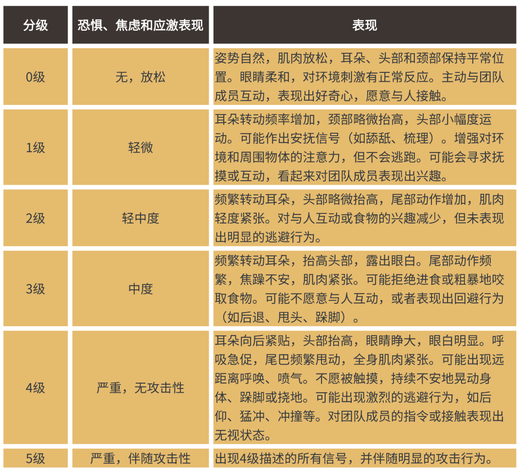 應(yīng)激是影響馬匹行為和生理健康的核心問(wèn)題。研究表明,高強(qiáng)度訓(xùn)練、長(zhǎng)途運(yùn)輸、馬廄環(huán)境改變等都會(huì)導(dǎo)致馬匹應(yīng)激水平升高,并表現(xiàn)出心率增加、皮質(zhì)醇水平升高和運(yùn)動(dòng)耐受性下降。以下為馬匹恐懼、焦慮和應(yīng)激的不同級(jí)別。