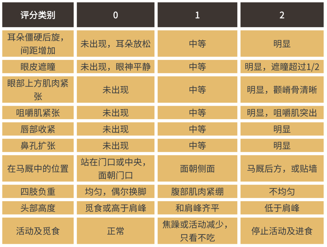 盡管馬匹在進(jìn)化上傾向于隱藏疼痛,但科學(xué)研究已表明其面部表情、步態(tài)、姿勢(shì)和日常行為都會(huì)受到疼痛的影響。為更準(zhǔn)確評(píng)估馬匹的疼痛程度,我們可以參考馬的疼痛評(píng)分量表(Equine Grimace Scale, EGS),可以通過(guò)將各項(xiàng)評(píng)分(0~2分)加起來(lái),求得總分: