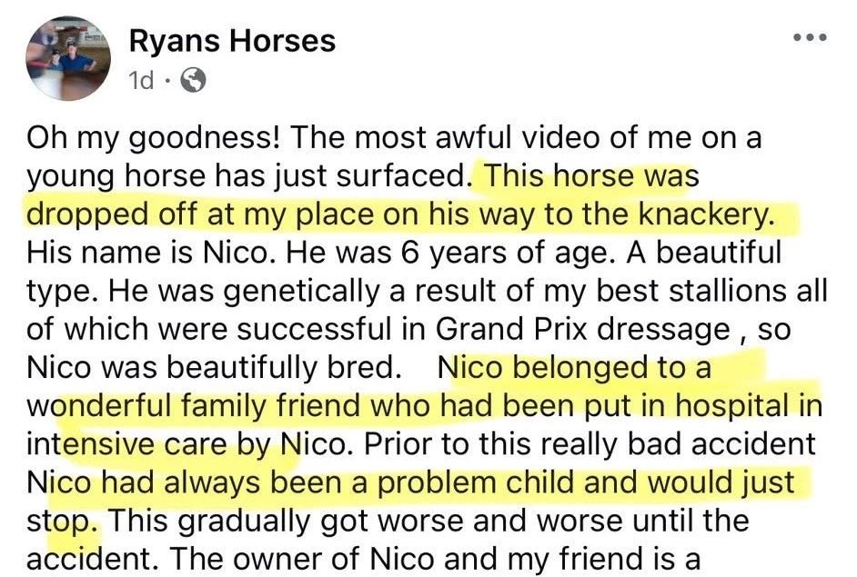 66歲的澳大利亞奧運會騎手希思·瑞安(Heath Ryan),近日因為一段顯示其鞭打馬匹42次的視頻在網(wǎng)絡(luò)廣泛傳播。希思·瑞安曾代表澳大利亞參加2008年北京奧運會盛裝舞步項目,2024年仍在四星級三項賽中出賽。 目前澳大利亞馬術(shù)協(xié)會于6月12日對其做出臨時停賽決定。并對視頻內(nèi)容表示“極度震驚與擔(dān)憂”。面對這一結(jié)果,希思·瑞安在社交媒體上發(fā)表長文進行辯解,并稱該視頻中的行為是在執(zhí)行一項“營救任務(wù)”。 ———————————————————— 希思·瑞安在聲明中稱,這段視頻拍攝于兩年前,馬名為“Nico”,是一匹六歲的年輕馬,被送往他家前原本打算送到屠宰場。 希思·瑞安說:“‘Nico’是由旗下的優(yōu)秀種馬繁育而成的,但其前主人卻因‘Nico’的不當(dāng)行為曾被送進重癥監(jiān)護室。”他認為這匹馬一直是個“問題兒童”,會突然停下不動,情況越來越嚴重,直到發(fā)生了那場事故。他強調(diào),這位前主人是一位體型嬌小的女士,“絕不可能對馬使用暴力”,意在說明“Nico”的問題并非源于人為傷害。 根據(jù)希思·瑞安的描述,“Nico”的“問題”是拒絕前行。然而,從馬匹行為學(xué)的角度看,這很可能是壓力、恐懼或訓(xùn)練方式不當(dāng)?shù)慕Y(jié)果。現(xiàn)代馬術(shù)早已發(fā)展出諸多非暴力、科學(xué)的訓(xùn)練手段,這類“用鞭打解決問題”的做法,既不必要,也不專業(yè)。救馬不該成為打馬的借口。 面對視頻中反復(fù)抽打“Nico”的行為,希思·瑞安解釋道:“我從未騎過這樣的馬,我很遺憾這被拍了下來。但如果我當(dāng)時只考慮自己,我會立刻下馬,把它送走。但那一刻對‘Nico’來說是生死關(guān)頭,我必須盡全力去嘗試。” 問題是,面對一匹血統(tǒng)優(yōu)良的年輕馬,真的沒有更溫和、科學(xué)的方法了嗎?沒有行為專家、專業(yè)調(diào)訓(xùn)師的幫助可尋嗎?相信絕對不是這樣。一位奧運級別的騎手如果面對問題馬的唯一手段是反復(fù)抽打,恐怕真正“出問題”的不是馬,而是他的訓(xùn)練理念與專業(yè)素養(yǎng)。他所謂的“盡最大努力”,是對馬術(shù)訓(xùn)練精髓的徹底背離。 瑞安在聲明的結(jié)尾表示:“這一切都是出于馬匹的最佳利益,結(jié)果對每個人都很成功——除了我,因為視頻被發(fā)布了?!?/span> 希思·瑞安在社交媒體上發(fā)布長篇聲明 他試圖將問題焦點轉(zhuǎn)向“視頻被泄露”,仿佛風(fēng)波的源頭不是行為本身,而是視頻的公開。這種表態(tài),回避了關(guān)鍵問題:如果沒有這段視頻,公眾永遠不會知道這42次鞭打曾經(jīng)發(fā)生。而當(dāng)事件曝光后,他的第一反應(yīng)不是反思和道歉,而是表達自己“被背叛”的憤怒,而這絕對不是承擔(dān)責(zé)任的姿態(tài)。 希思·瑞安稱Nico(圖中馬匹)目前生活得很好 希思·瑞安是奧運騎手,是公眾人物。他的言行不只是個人行為,更傳遞著對待動物、對待錯誤、對待權(quán)力的立場。令人遺憾的是,在這篇長文中,我們看不到一句真誠的道歉,沒有一句對馬匹真正的尊重,而是充斥著“我沒有錯,只是被誤會”的自我辯護。 但不論如何:42次鞭打,不論出于什么理由,都是不可接受的暴力行為。目前,希思·瑞安已被澳大利亞馬協(xié)停賽,國際馬聯(lián)(FEI)也同步執(zhí)行停賽并啟動調(diào)查程序。 “救了馬”不意味著可以施暴,“結(jié)果變好”也不等于過程無錯。真正的好騎手,不是制服最“難搞”的馬,而是能聽懂脆弱的馬在說什么。 你怎么看待這42鞭?馬術(shù)的底線應(yīng)該在哪里?歡迎留言,說出你的觀點。 |