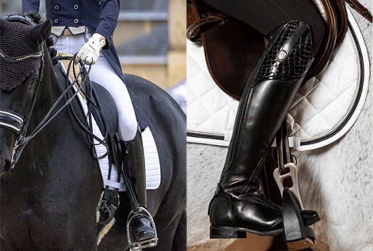 當(dāng)你第一次踏上馬背,才發(fā)現(xiàn)一雙靠譜的馬靴不僅關(guān)乎帥氣,更關(guān)乎安全與舒適。在馬術(shù)項(xiàng)目中,騎乘靴的合腳度、材質(zhì)選擇與細(xì)節(jié)配置直接影響騎手的表現(xiàn)與舒適度。尤其在多變的訓(xùn)練與比賽環(huán)境中,這些細(xì)節(jié)往往成為決定騎乘體驗(yàn)的關(guān)鍵。 每一環(huán)節(jié)都需綜合考慮運(yùn)動(dòng)特性與個(gè)人習(xí)慣。只有科學(xué)配置與細(xì)致養(yǎng)護(hù),才能讓馬靴在賽場內(nèi)外持續(xù)提供可靠支持,助力騎手與馬匹的默契配合。每一處配置都藏著提升騎乘表現(xiàn)的關(guān)鍵。 盛裝舞步靴 在盛裝舞步中,馬匹和騎手需要使用最少的輔助工具,完美地完成一系列預(yù)先設(shè)定的動(dòng)作。為了讓騎手專注于節(jié)奏、規(guī)律性、放松以及與馬匹的互動(dòng),舒適且結(jié)實(shí)的靴子是至關(guān)重要的。 盛裝舞步靴后部設(shè)有加固結(jié)構(gòu),并采用不同硬度的皮革制成,因此踝部不會(huì)出現(xiàn)明顯的下垂或褶皺。“煙囪式”設(shè)計(jì)能夠支撐騎手在馬鐙中相對平坦的腳部位置,并保持修長優(yōu)雅的腿部姿勢,從而最大程度地與馬匹的側(cè)身接觸。