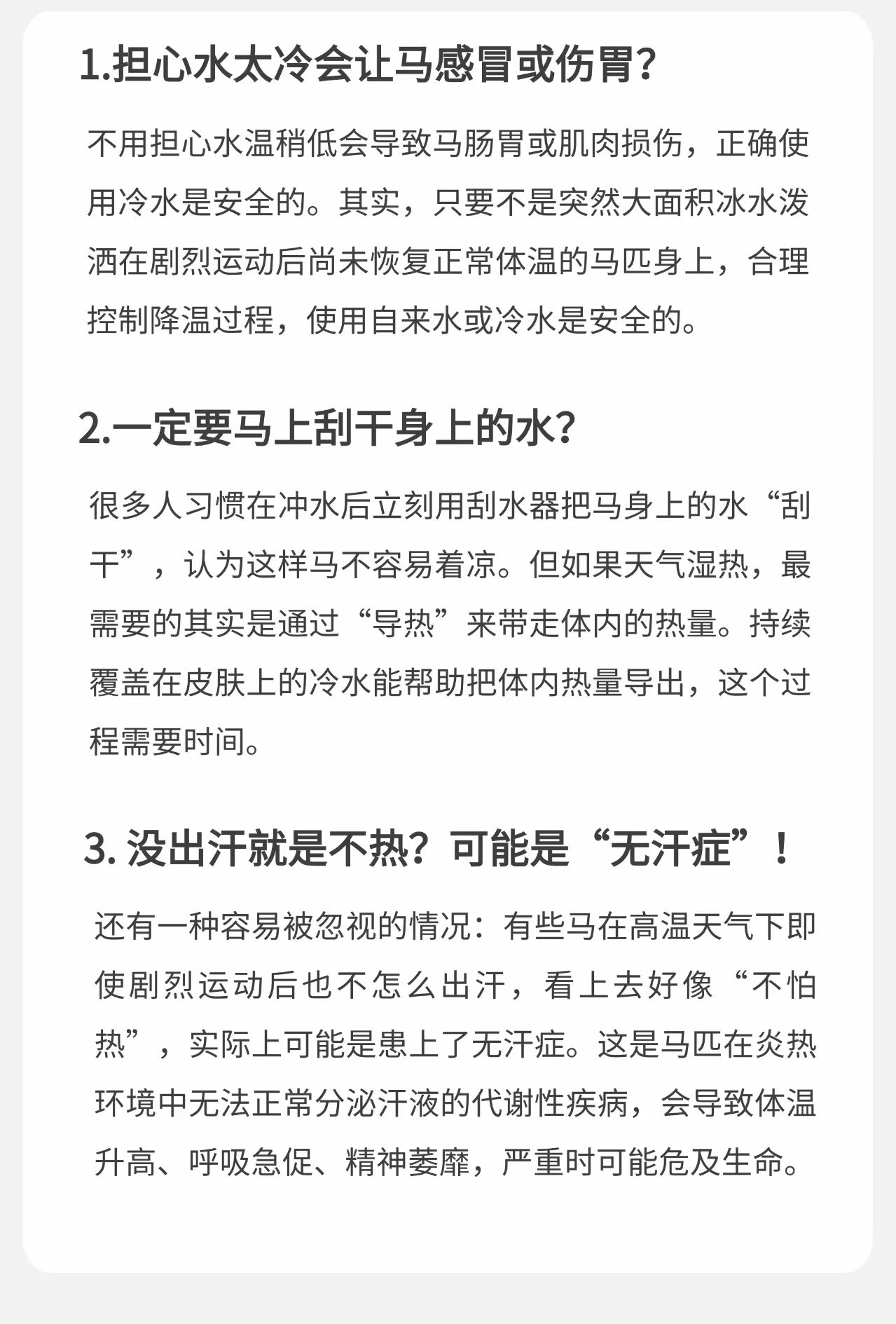 隨著夏季氣溫節(jié)節(jié)攀升,馬匹的健康管理顯得尤為重要。你是否也曾在烈日下為馬兒是否太熱、猶豫該不該沖水和刮水?哪種降溫方式更高效? 別擔(dān)心!本文將從生理機(jī)制、實(shí)用技巧和科研分析各個(gè)方面,全面梳理馬在高溫下的降溫方法與誤區(qū)。 無論你是馬主、教練還是騎手,這都是一份不容錯(cuò)過的夏日守護(hù)指南。 高溫環(huán)境下,科學(xué)、及時(shí)降溫能極大減少馬匹因熱應(yīng)激造成的傷害。合理利用冷水持續(xù)沖洗、適當(dāng)運(yùn)動(dòng)調(diào)節(jié)呼吸、及時(shí)觀察體溫和行為變化,是每個(gè)馬主必備的技能。給馬降溫不是麻煩事,這個(gè)夏天,讓我們一起守護(hù)馬的舒適與安全! |
