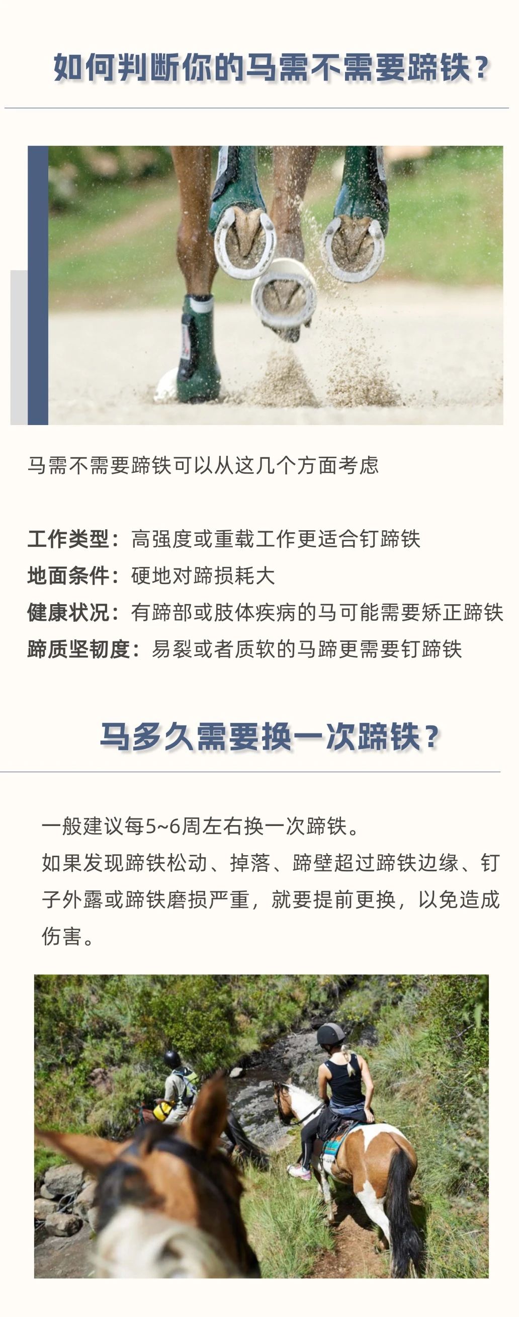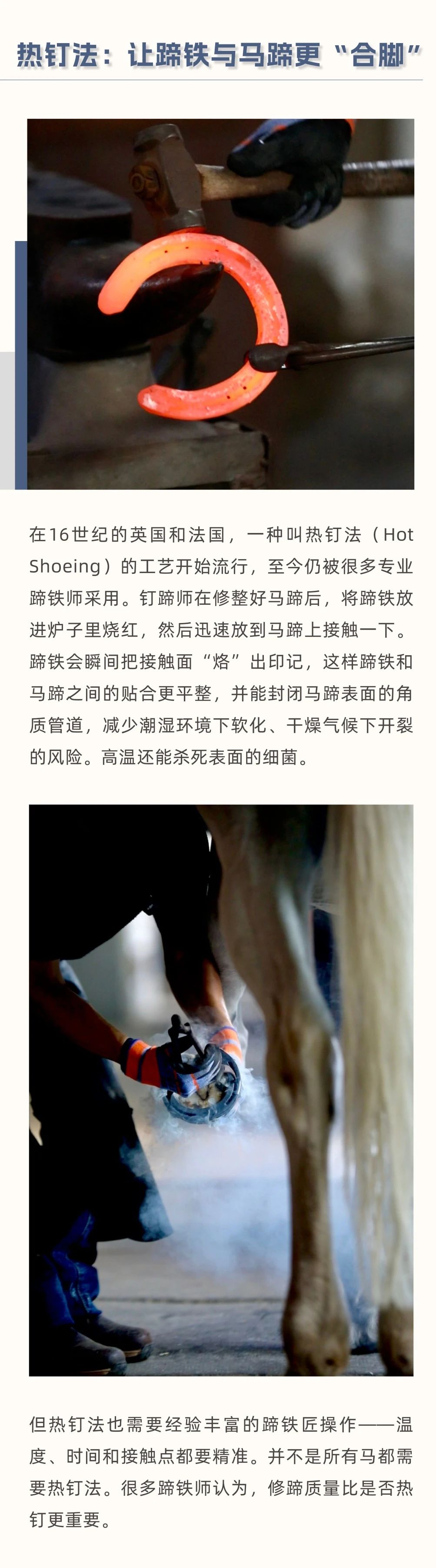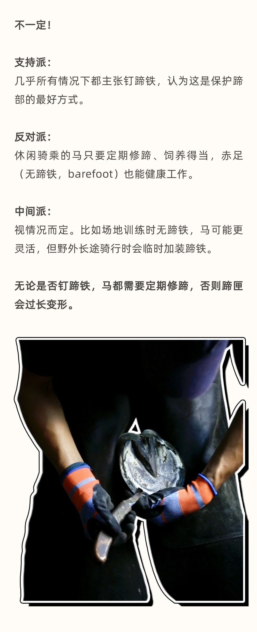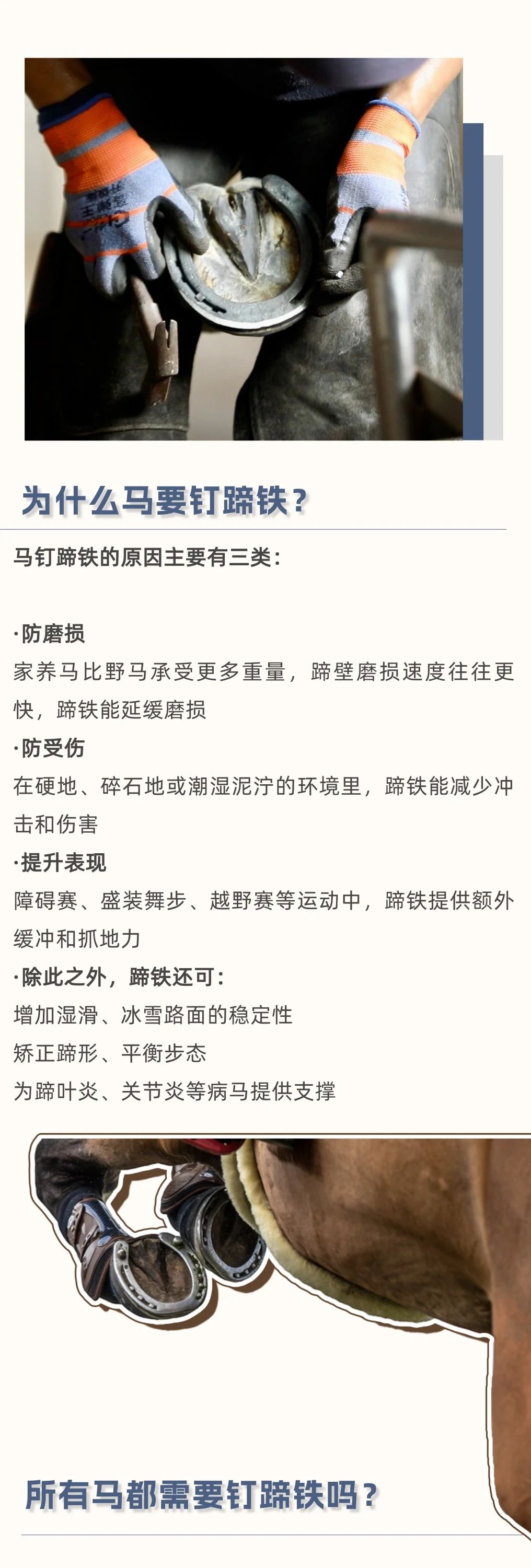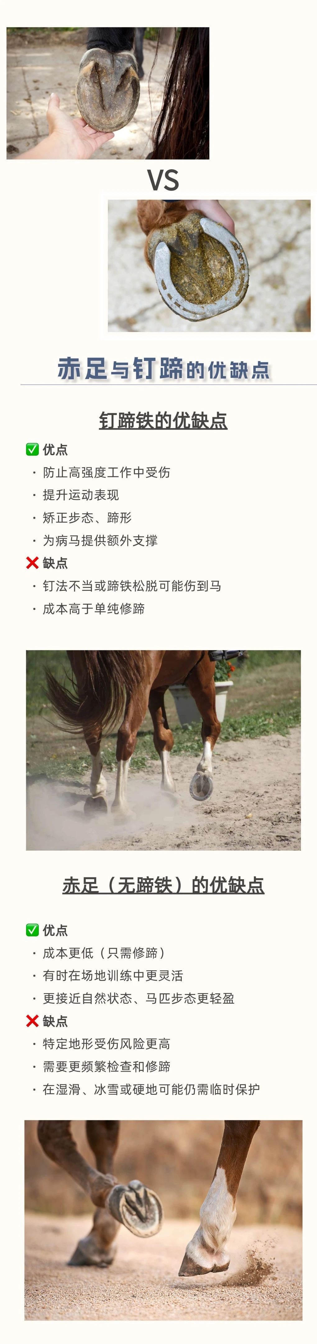 馬天生就有堅硬的蹄子,真的還需要穿“鞋”嗎? 在馬場,你可能見過這樣一幕:鐵匠將燒紅的蹄鐵按在馬蹄上,空氣中彌漫著一股焦味。有人說這是保護馬蹄的必備工序,有人覺得沒必要。那么,釘蹄對馬來說,到底是“必需品”還是“可選項”? 本文將帶你了解馬蹄鐵的歷史、釘蹄鐵的原因與方法、熱釘法的原理,以及釘與不釘蹄鐵各自的優(yōu)缺點,幫你判斷自己的馬是否真的需要蹄鐵。 蹄鐵不是“必須”也不是“多余”,它是根據(jù)馬匹實際情況量身決定的。無論選擇赤足(無蹄鐵)還是釘蹄鐵,定期修蹄 + 專業(yè)檢查才是保持馬蹄健康的關(guān)鍵。 |