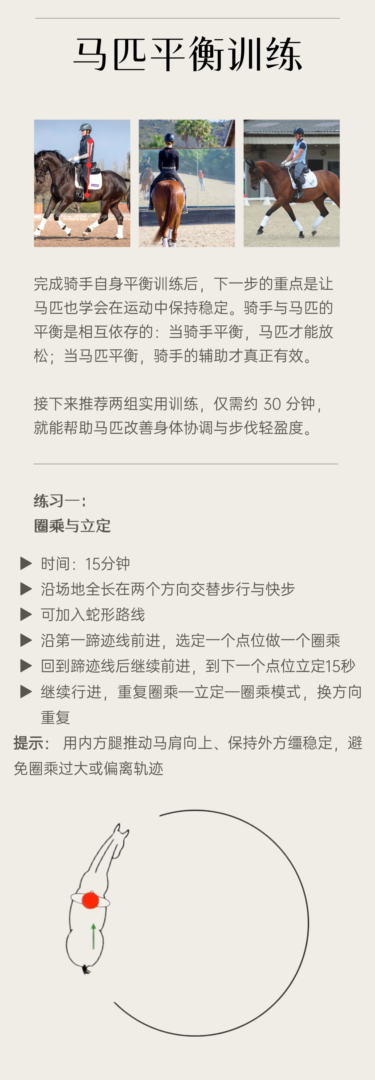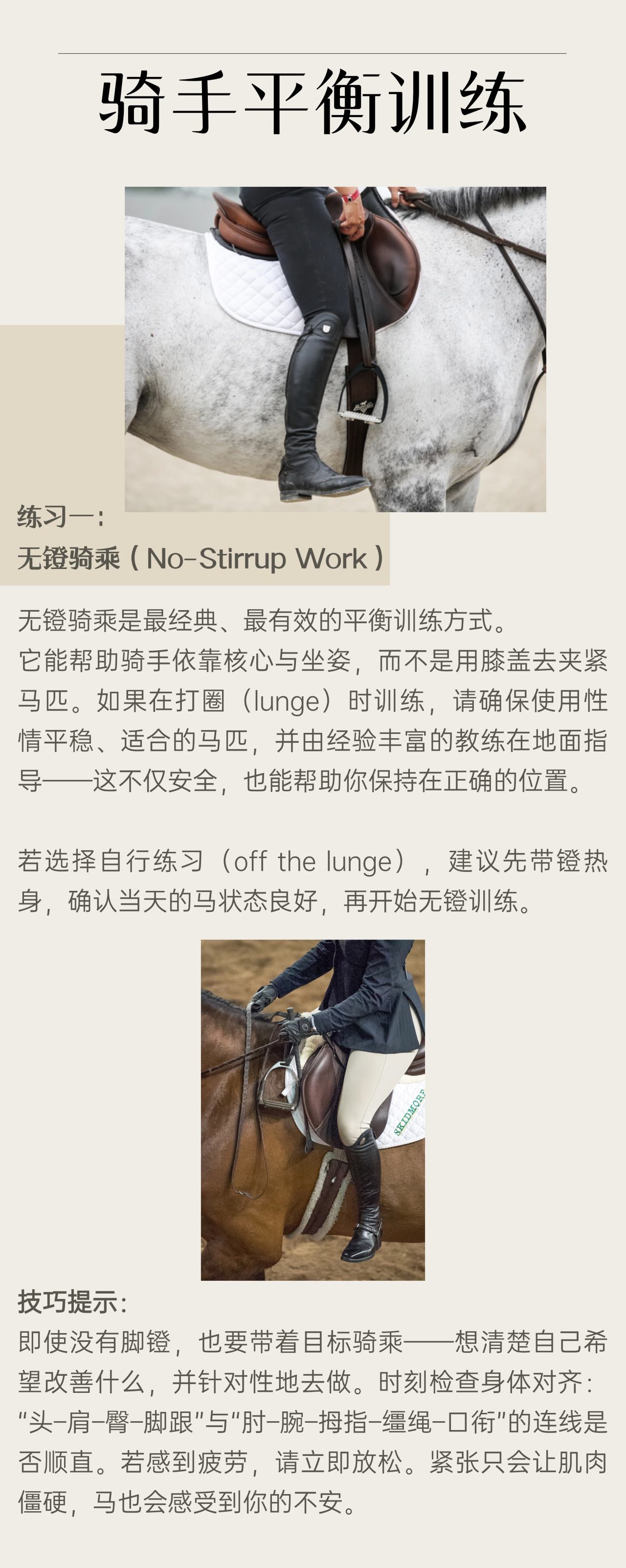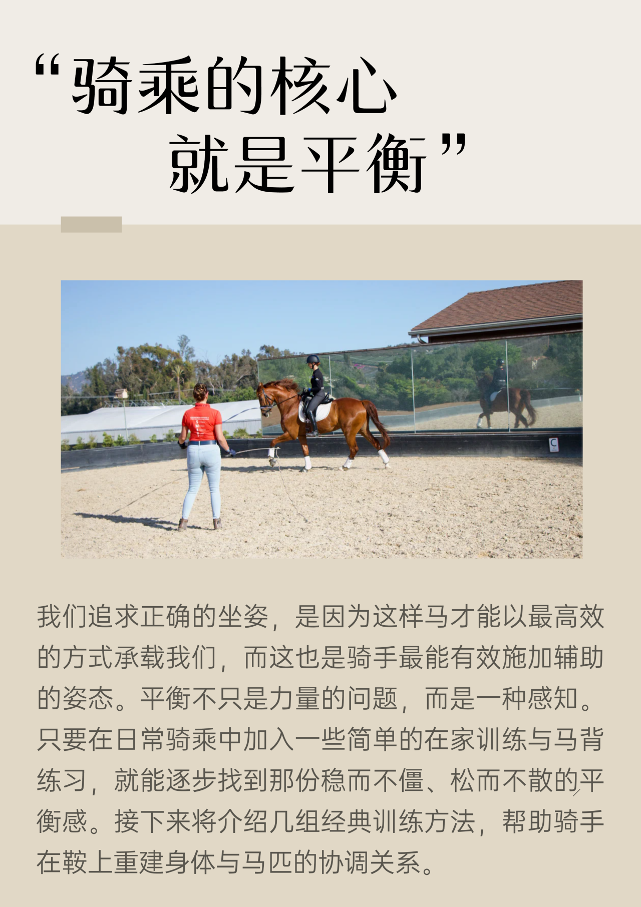 學(xué)習(xí)如何在騎乘中改善平衡,是成為一名高效騎手的基礎(chǔ)。無(wú)論是在復(fù)雜的障礙賽場(chǎng)上追求高度與精準(zhǔn)、在盛裝舞步中追求優(yōu)雅動(dòng)作,還是只是享受一段輕松的林間騎行,騎手能否保持身體居中、穩(wěn)定、與馬匹相連,是實(shí)現(xiàn)人與馬溝通的關(guān)鍵。 然而,真正的平衡并非一蹴而就,即使對(duì)經(jīng)驗(yàn)豐富的騎手來(lái)說(shuō),這也是一個(gè)持續(xù)探索的過(guò)程。 平衡訓(xùn)練的核心,不是追求某個(gè)標(biāo)準(zhǔn)姿態(tài),而是培養(yǎng)“感知力”。當(dāng)騎手學(xué)會(huì)通過(guò)核心去穩(wěn)定、通過(guò)腿去引導(dǎo)、通過(guò)騎坐去溝通,馬匹也會(huì)在你的身體信號(hào)中獲得安全感與方向感。 |