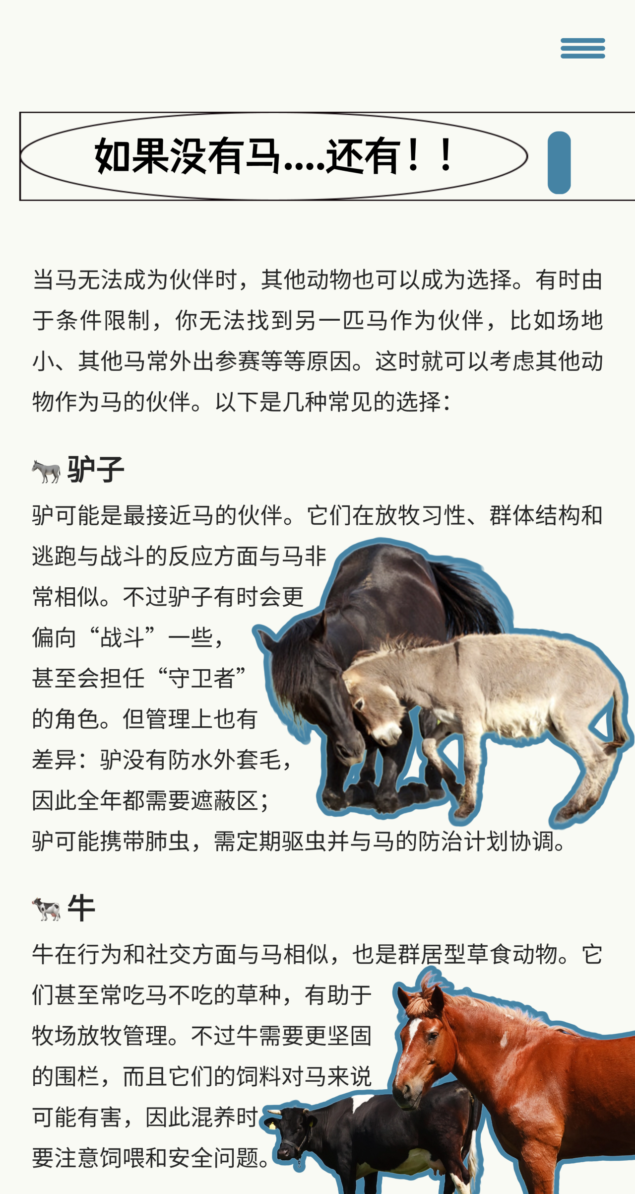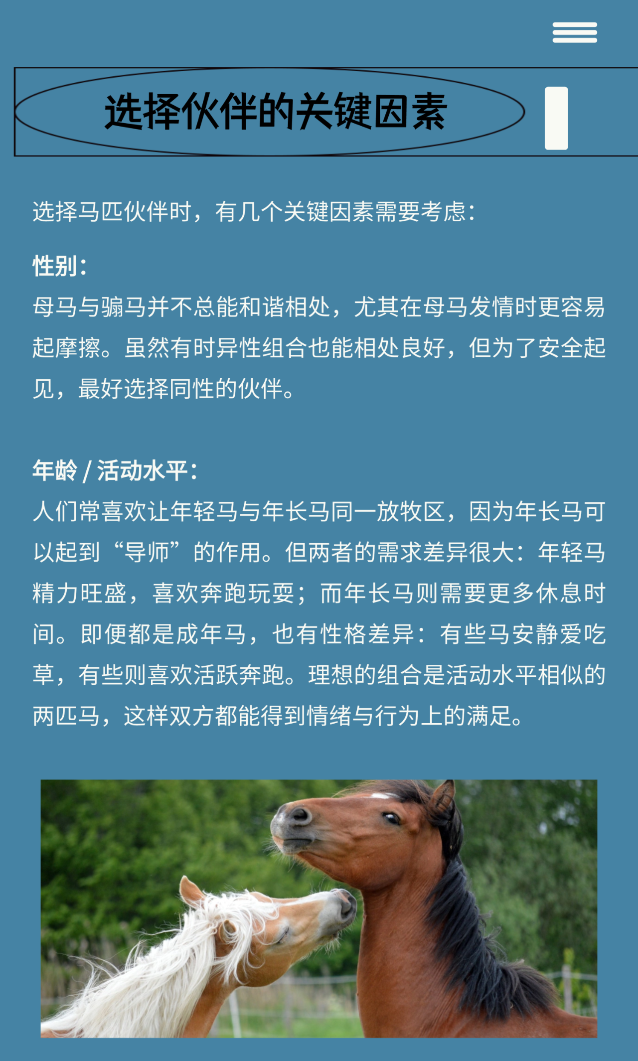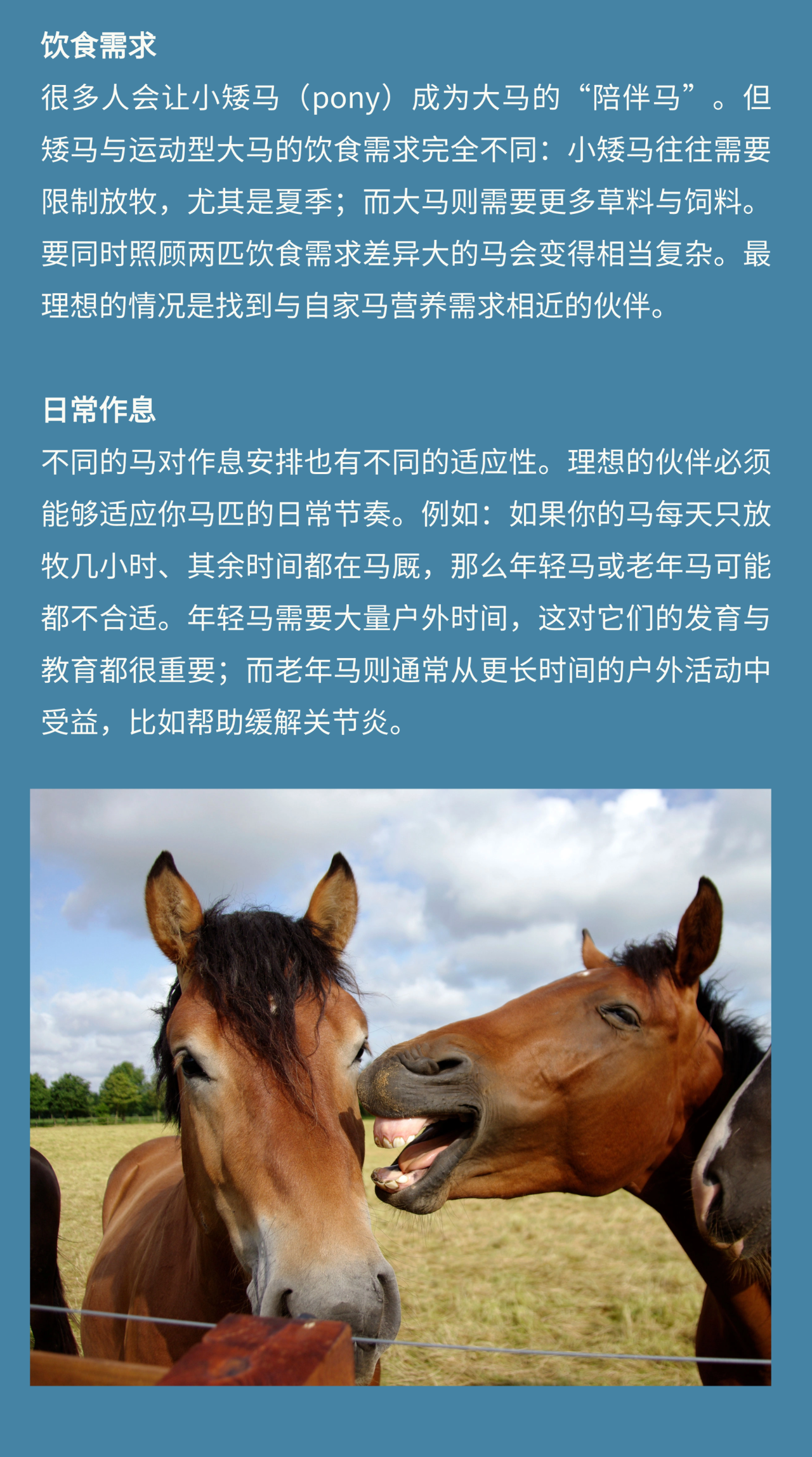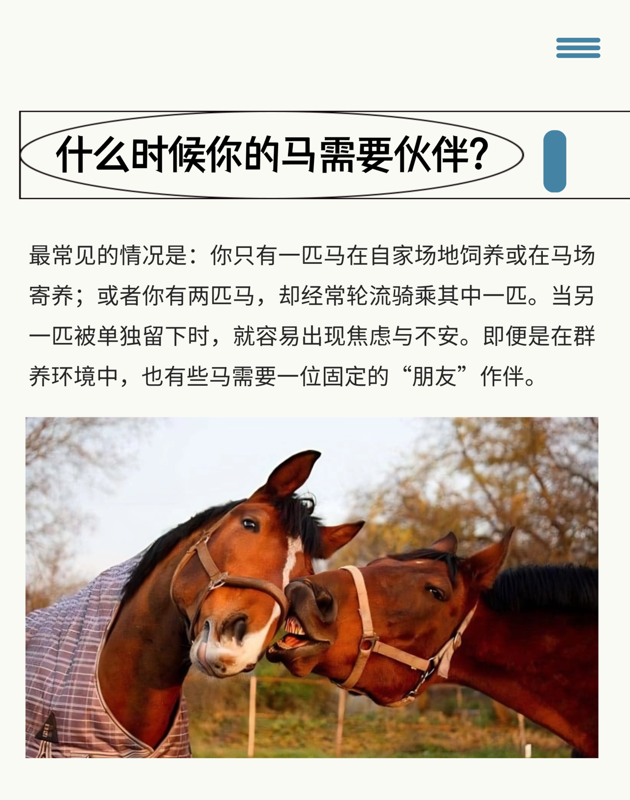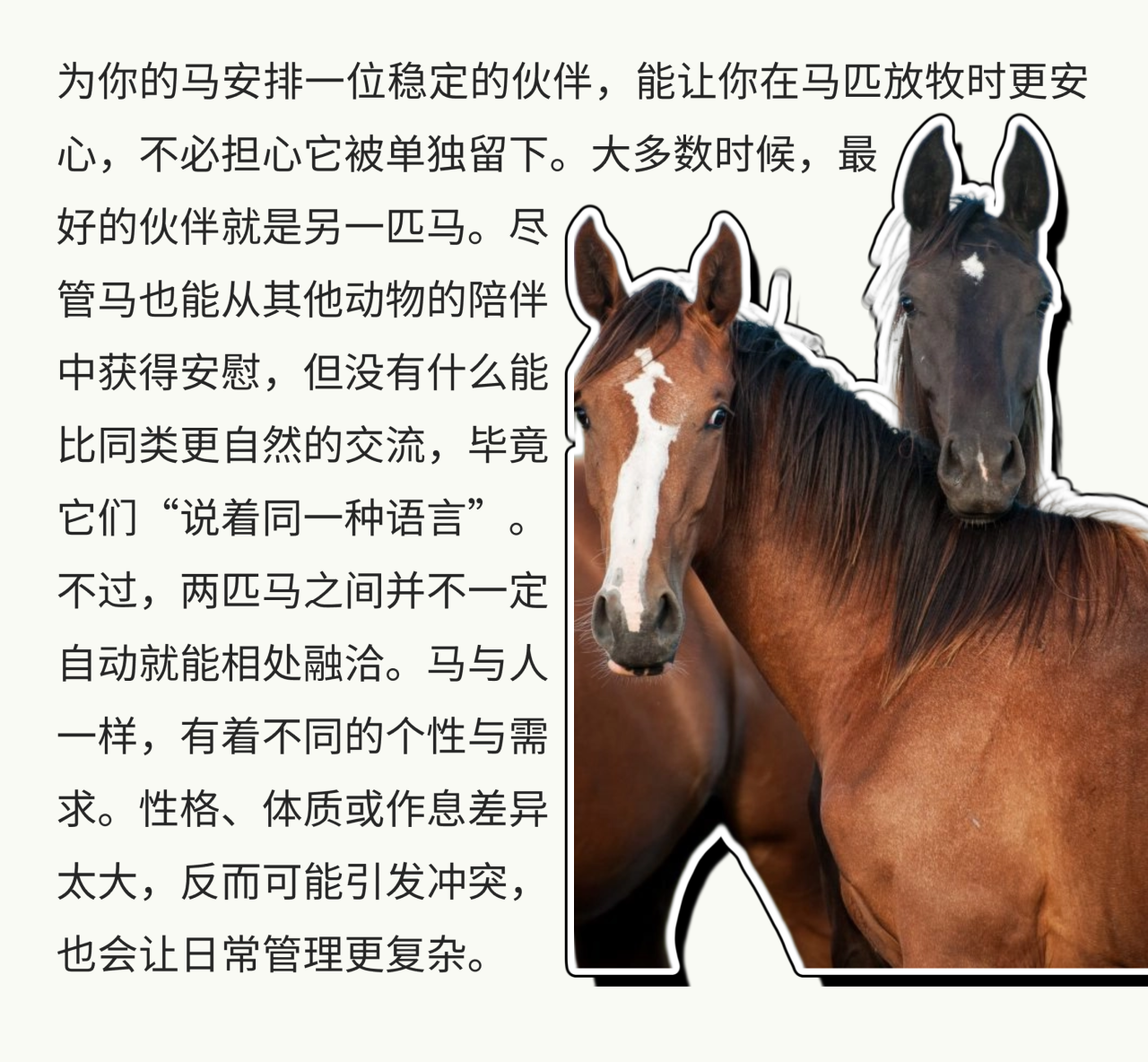 馬是高度群居的動(dòng)物,它們需要同伴。 如果無(wú)法滿(mǎn)足其社交需求,馬的壓力水平會(huì)顯著上升,表現(xiàn)出緊張、易驚甚至“頑皮”的行為。然而,雖然你的馬需要朋友,但并不是任何一匹馬或動(dòng)物都能成為理想的伙伴。要找到合適的“馬友”,你需要仔細(xì)思考。 為馬選擇伙伴看似簡(jiǎn)單,實(shí)則需要很多的考量。理想的搭檔不僅能讓你的馬情緒更穩(wěn)定、生活更快樂(lè),還能讓日常管理更輕松。無(wú)論你選擇另一匹馬、還是其他動(dòng)物,只要理解并尊重它們各自的天性,讓它們安全、舒適、被陪伴,就是最好的選擇。 |