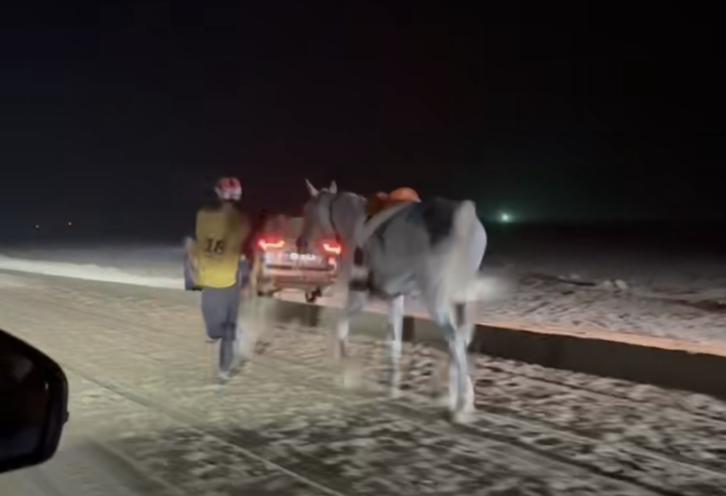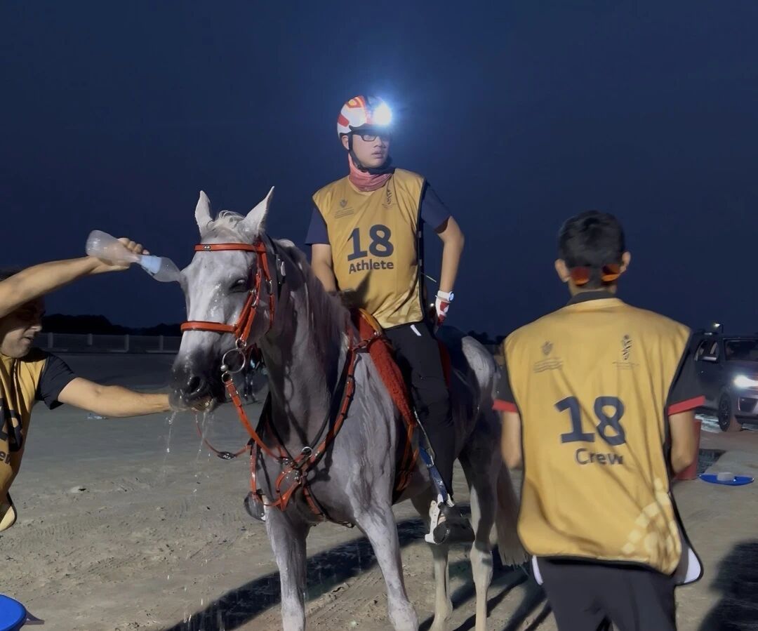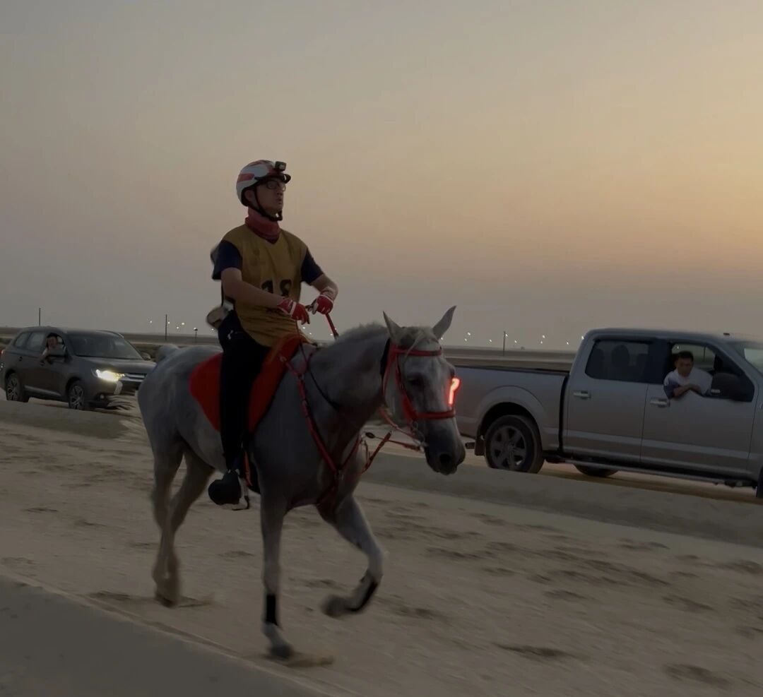 這感人的一幕,折服了現(xiàn)場(chǎng)的幾乎每一個(gè)人。已完賽的巴林隊(duì)和沙特隊(duì)的騎手、賽事組委會(huì)官員、獸醫(yī)官員組、賽事監(jiān)管官員組,在賽事直播中看到此景后,駕車折返賽道主動(dòng)相伴,用不同語言為他加油,打開車燈給他照亮了前往終點(diǎn)的路;嚴(yán)格監(jiān)督的賽事裁判,目光中充滿了驚嘆與敬意,此刻的場(chǎng)景已跨越國(guó)界和比賽本身。