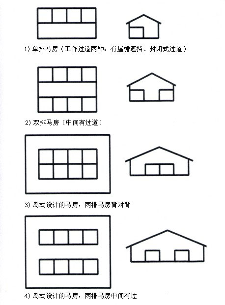 (二)馬廄布局選擇 (圖一) 根據(jù)馬廄和過(guò)道的位置,馬房平面圖(如圖一)一般認(rèn)為有三種設(shè)計(jì):?jiǎn)闻拧㈦p排或島式設(shè)計(jì)。若當(dāng)?shù)貧夂虮容^溫和,單排馬房(如圖二)比較常見,而且外面的過(guò)道對(duì)馬匹護(hù)理員來(lái)說(shuō)是舒適的工作環(huán)境。當(dāng)馬匹大多時(shí)間在室外,而且可自由出入馬房,也會(huì)用到單排馬房。在美國(guó),雙排馬房(如圖三)常用做寄養(yǎng)私人馬匹和比賽設(shè)施,封閉的過(guò)道對(duì)于馬匹護(hù)理工作很重要。島式設(shè)計(jì)多用于馬匹集中訓(xùn)練時(shí),如速度賽馬,馬房周圍的“環(huán)形走道”是為了讓馬匹盡快降溫或是訓(xùn)練馬匹。 (圖二) (圖三) (1)單排馬房的構(gòu)造