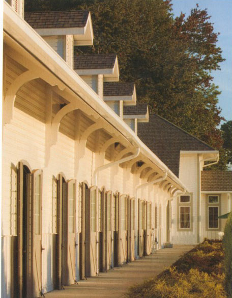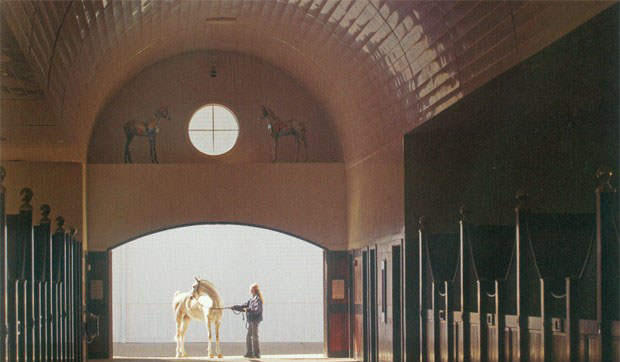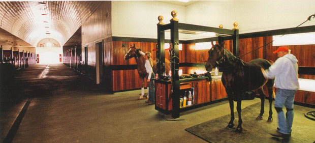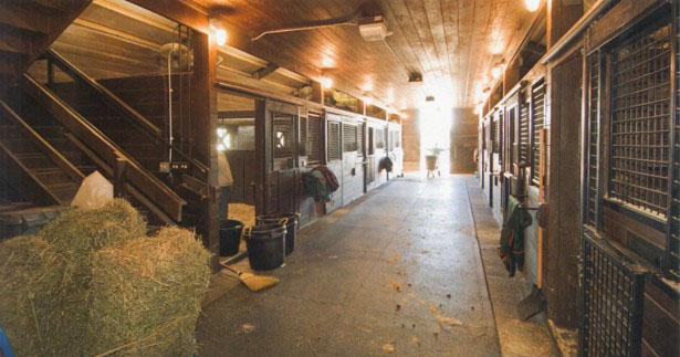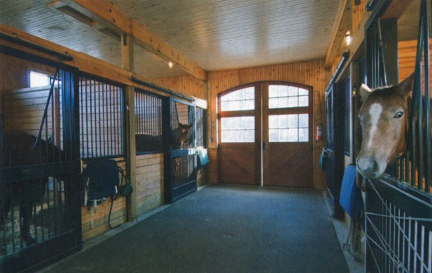與其他兩種設(shè)計(jì)相比,單排馬房的構(gòu)造很漂亮,它最大程度地減少了封閉空間。馬匹和自然環(huán)境更接近,每匹馬都可以有稱心的馬廄。不過(guò),除非馬房是部分封閉,否則這種馬房設(shè)計(jì)難以保護(hù)馬匹護(hù)理員免受天氣的影響。 (2)雙排馬房(過(guò)道在兩排馬廄中間)的構(gòu)造