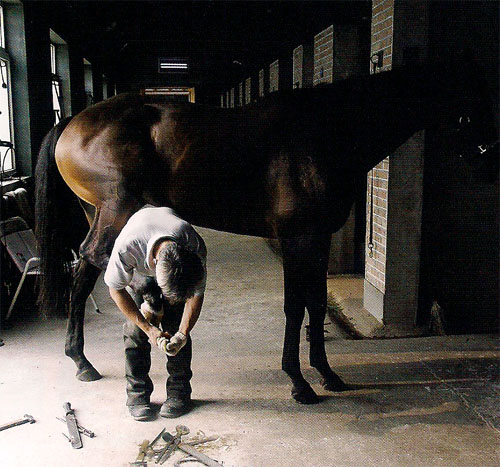 對俱樂部的馬匹進(jìn)行合理的裝蹄不僅可以防止蹄角質(zhì)過度磨滅和防滑,而且對預(yù)防蹄病和變形蹄的發(fā)生,矯正變形蹄和異常步,配合治療某些肢蹄疾病等都有重要作用。筆者通過多年的臨床實(shí)踐體會到,在裝蹄過程中,削蹄、修配蹄鐵、下釘三個方面是保證裝蹄質(zhì)量的關(guān)鍵環(huán)節(jié)。 削蹄 1.蹄與系的方向是否一致 蹄與系的方向(即趾骨軸)是確定削蹄正確與否,以及削蹄后的蹄形是否適應(yīng)肢勢的標(biāo)準(zhǔn)。因此,削蹄時要求蹄與系的方向一致。其判定標(biāo)準(zhǔn)是:從肢前望,由系的前上方中央向蹄設(shè)一垂直線,將系部內(nèi)外等分,垂線落于蹄尖中央,側(cè)望時,系部的傾斜方向與蹄的傾斜方向成直線。若蹄與系方向前傾,說明蹄踵削切不足而偏高,蹄與系方向后傾是蹄踵偏低或蹄尖壁過長;蹄與系方向外傾,說明蹄的外側(cè)低內(nèi)側(cè)高,蹄與系方向內(nèi)傾則蹄的內(nèi)側(cè)低外側(cè)高。上述現(xiàn)象都會造成體重偏壓于蹄的低側(cè),破壞蹄的平衡負(fù)重,久之會誘發(fā)變形蹄或肢蹄疾病。因此,在削蹄時應(yīng)力求做到蹄與系的方向一致,不一致應(yīng)及時給予修整或矯正。 2.左右兩蹄大小、長度是否相同 正常左右蹄的大小應(yīng)相同,蹄的長度也應(yīng)一致。蹄的大小通常是以該蹄所裝用的蹄鐵的號數(shù)來表示,例如,裝1號蹄鐵的蹄子即為1號蹄以此類推。馬1號蹄蹄尖壁的長度約為76mm,每大1號,蹄尖壁長度增加2mm。但在實(shí)踐中不可能逐蹄測量,因此在削蹄時為了做到心中有數(shù),常以手指基部測量蹄尖壁的長度。一般蹄尖壁的長度約為78-80mm,稍小的蹄約72-76mm較大的蹄約84-88mm 3.蹄尖壁與蹄踵壁的長度比例和蹄角度是否適當(dāng) 馬正常的蹄形,蹄尖壁與蹄踵壁的長度比例,前蹄約為2.5:1,后蹄約2:1;蹄尖壁與地面的角度,前蹄為50-55度,后蹄為55-60度。 4.蹄負(fù)面是否平坦,蹄底、蹄叉和蹄支削切是否適當(dāng) 蹄負(fù)面削切必須平坦,并與蹄鐵能緊密相接,不生空隙,蹄底應(yīng)削出一定的穹隆度;蹄叉要削出固有的形狀,其高度應(yīng)略高出蹄負(fù)面;蹄支一定要削出橫斷面,保持與蹄叉基本同高,蹄支與蹄叉支后端相連接的部位要徹底削開,以促進(jìn)蹄的開閉機(jī)能,預(yù)防發(fā)生蹄踵狹窄等變形蹄。 修配蹄鐵 1.蹄鐵大小選擇 蹄鐵的大小必須按照蹄形的大小選配,即蹄鐵必須適合蹄形。蹄鐵過大容易落鐵或運(yùn)步異常,過小容易發(fā)生釘傷。如果蹄鐵局部與蹄形不完全相符合時,應(yīng)適當(dāng)修整蹄鐵,絕不能“削足適履”用蹄形將就蹄鐵,否則會招致蹄變形等。正常蹄形裝上蹄鐵后,在蹄尖和蹄側(cè)部,蹄鐵外緣與蹄壁外緣大小一致,或略大于蹄壁外緣(不超過1mm),由蹄踵部向后蹄鐵外緣應(yīng)逐漸大于蹄壁外緣,留有約1-3mm的剩緣,蹄鐵的鐵尾應(yīng)比蹄踵角長出約3-5mm的剩尾。 2.修配蹄鐵的要求 修整后的蹄鐵上面(接蹄面)要平坦,外緣要平整,并保持釘溝和釘孔的完整,蹄鐵裝上后,防止留出三角剩尾,特別是內(nèi)側(cè)鐵支,以防發(fā)生交突等。 下釘 1.下釘數(shù)量 一般馬的蹄子每側(cè)下3個釘,每蹄6個釘,較大的蹄每側(cè)可下4個釘,不要把所有釘孔都釘滿。下釘太多不但不能保持蹄鐵的牢固,反而會破壞蹄壁,發(fā)生落鐵或蹄病。最后方的蹄釘負(fù)荷量較大,應(yīng)注意裝釘牢固。 2.下釘深度 蹄釘要由白線外緣釘進(jìn),在蹄側(cè)壁長度的下1/3與中1/3的交界線處出釘,每釘間隔距離應(yīng)力求均等,避免兩個釘相距太近。若下釘過深易發(fā)生釘傷,下釘太淺易發(fā)生落鐵或崩蹄。 3.釘節(jié)長度 系指蹄釘釘出蹄壁后,用剪鉗剪斷釘身并將其斷端向上彎曲部分的長度。一般要求釘節(jié)的長度應(yīng)與釘身的寬度相同或略小于釘身的寬度,近似四方形。防止釘節(jié)過長或過短,并且要彎曲確實(shí),緊貼在蹄壁面上,特別是蹄的內(nèi)側(cè),以防引起肢蹄外傷。 以上所述是馬匹正常裝蹄的最基本要求,是保證裝蹄質(zhì)量消除或減少因馬匹肢勢不正和裝蹄不當(dāng)造成的不良影響的關(guān)鍵。但是在實(shí)踐中由于每匹馬的肢勢和蹄形不同,裝蹄時需依據(jù)各自特點(diǎn)采取不同的裝蹄方法。 |