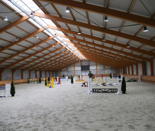 有效通風(fēng)口 有效通風(fēng)口對于室內(nèi)場地來說非常重要。通常,需要將金屬網(wǎng)絲或者 5、6 厘米的鋼絲網(wǎng)覆蓋于屋檐處的通風(fēng)口,從而防止鳥兒飛入;但是若采用更簡易的拱腹,不僅可以防止鳥兒的進(jìn)入,還可以讓空氣流通更加順暢。如果屋檐處所覆蓋的鋼絲網(wǎng)或金屬網(wǎng)絲影響了空氣流通,那么這時則需要考慮將通風(fēng)口尺寸增大 10%-20%。同時,考慮到灰塵堆積,通風(fēng)口需要增加到之前大小的 2 倍。 通風(fēng)口不可以使用住宅式的窗戶或者金屬拱腹的孔口,因?yàn)檫@些裝置不能提供充足的新鮮空氣。針孔型通風(fēng)口非但低效,而且很快就會積滿灰塵。如果堅(jiān)持使用拱腹網(wǎng)絲,我們則可以將它放置在一個垂直的位置上,從而防止鳥類筑巢;開放式背脊通風(fēng)口則可以使用方眼網(wǎng)阻止鳥類的進(jìn)入。 通風(fēng)口位置 沿整體建筑長邊設(shè)置的連續(xù)永久型通風(fēng)口最為推薦。這樣可以保證新鮮的空氣能夠平均地進(jìn)入場地,以減少場地的污濁空氣。同時,也可以在相對開放的區(qū)域平均設(shè)置一些間隔的通風(fēng)口。屋脊處通風(fēng)口可以設(shè)置成簡易連續(xù)的通風(fēng)口、連續(xù)的通風(fēng)口組合,圓屋頂式或者間隔的通風(fēng)口。打個比方,同等大小的屋脊處通風(fēng)口可以用 10個 15 厘米寬的煙囪式通風(fēng)口或者屋脊處通風(fēng)口。 選擇商業(yè)型屋脊通風(fēng)口組合,當(dāng)新鮮空氣進(jìn)入場地時,它還可以為農(nóng)業(yè)應(yīng)用提供一個暢通無阻的空氣流通途徑。大部分住宅型通風(fēng)口的空氣流通路徑一般設(shè)計得比較復(fù)雜,因此不會有足夠的新鮮空氣進(jìn)入其中。室內(nèi)場地作為一個高濕、多塵的環(huán)境,與住宅區(qū)相比,需要更多的通風(fēng)。 冷凝現(xiàn)象 當(dāng)場地里的空氣遇到比它溫度更低的空氣時,冷凝就形成了。氣溫降低時,它的水容量減?。ɡ淇諝獗扰諝夂懈俚乃郑?,水分子就會貼附在冷空氣的表面。冷凝通常出現(xiàn)在窗戶上和金屬的屋頂上,迫使室內(nèi)溫度慢慢變得和室外一樣冷。任何溫暖地方的潮濕空氣遇到比它結(jié)露點(diǎn)溫度低的空氣時,冷凝就會出現(xiàn)。預(yù)防冷凝的有效方法之一就是在易出現(xiàn)冷凝的表層添置一些隔熱材料。但是這種方法除了在金屬屋頂下設(shè)置 R-5 隔熱層,并不容易在室內(nèi)場地這樣寒冷的空間中見到。防止冷凝的另一重要手段則是清除場地里過量的水分。它的原理是讓外部新鮮空氣可以長驅(qū)直入,鎖住室內(nèi)水分,再排放出污濁空氣。大小適中的自然風(fēng)通風(fēng)口可以提供充足的空氣流通,以防止水分形成。但不論如何避免,嚴(yán)寒時期,場地建筑物上方偶爾會出現(xiàn)的冷凝現(xiàn)場也屬正常。只要木頭和金屬材料可以變干,并且大部分時候是處于干燥狀態(tài)的話,就不成問題。 長期的冷凝會掉落在屋頂上、滲透進(jìn)絕緣體,導(dǎo)致金屬材料生銹、建筑組件的承重力受損等。這時我們可以對場地補(bǔ)充熱量。補(bǔ)充的熱量會增加場地空氣的水容量,通風(fēng)口是必須的,要用它來清除潮濕空氣,與場地外的干燥空氣進(jìn)行流通。最簡單、最低成本的解決方案是設(shè)置更多更大的自然風(fēng)通風(fēng)口,通過暢通無阻的屋檐處和屋脊處通風(fēng)口或者開放場地大門等方法,定期更換室內(nèi)空氣。通風(fēng)扇和進(jìn)氣裝置可以用來進(jìn)行小量的空氣交換,將場地內(nèi)潮濕的空氣排出去,將室外干燥的空氣“引”進(jìn)來。 高溫時期的通風(fēng) 室外溫度過高時,處在陰涼處的室內(nèi)場地可以打開大門,從而讓盡可能多的冷空氣進(jìn)入場地。 窗簾式邊墻則可以給予場地一個相對靈活的空氣流通以及零成本的光線。窗簾覆蓋了大部分邊墻。邊墻窗簾的結(jié)構(gòu)和建造技術(shù)可以選擇吸人眼球和耐用的設(shè)計。從屋檐到地面上的所有通風(fēng)口,除了被場地柵欄圍起來的部分以外,都可以在高溫時考慮能否通過穿堂風(fēng)實(shí)現(xiàn)降溫。 大部分邊墻窗簾材料是半透明的,比木制或金屬材料更易保持場地內(nèi)的自然光源。窗簾材料大多來自于農(nóng)業(yè)織物,可以是單層亦或是多層的“絕緣”窗簾,盡管后者沒有像 R-5那樣優(yōu)越的隔熱功能。邊墻窗簾的缺點(diǎn)之一是如果支撐的繩子沒有拉緊的話,起風(fēng)時窗簾就會擺動,這會干擾到騎手和馬匹。一些案例表明有些馬匹需要一到兩天的時間去適應(yīng)邊墻上的窗簾,盡管如此,場地中具備可控的光源和新鮮的空氣足以勝過它的不足。 場地供暖 室內(nèi)場地可以在冬季時阻隔室外的寒冷,并且通過供暖來保持舒適的溫度。室內(nèi)場地可以使用暖氣或者輻射供暖系統(tǒng)進(jìn)行 24 小時全天候供暖,或者使用空中輻射供暖。其缺點(diǎn)便是室內(nèi)場地環(huán)境的供暖系統(tǒng)運(yùn)作和維護(hù)的成本較大。 此處討論的供暖系統(tǒng)是長久放置的系統(tǒng),不是從酒店、辦公室或者露營地借來的便攜式的場地加熱設(shè)備。這些便攜式的加熱設(shè)備如果未加注意,就會有潛在的火災(zāi)隱患,釋放大量的濃煙,同時它也不適合馬場這種多塵潮濕的環(huán)境,因此不推薦在室內(nèi)場地使用。 農(nóng)業(yè)上使用的