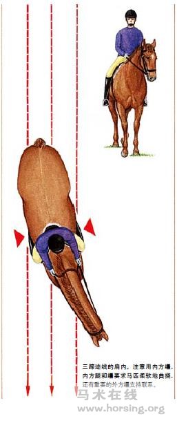 肩內(nèi) 一旦騎手學(xué)會并掌握定前肢旋轉(zhuǎn),就說明他能夠相對獨(dú)立地運(yùn)用手和腳。此時(shí)應(yīng)該嘗試做肩內(nèi)動作,對騎手和馬匹而言,這是最有價(jià)值的訓(xùn)練之一。 一般情況均以快步做肩內(nèi),也是控制馬肩部的練習(xí)。做定前肢旋轉(zhuǎn)時(shí),肩部保持在同一地方,但是做肩內(nèi)時(shí),馬匹的后半肢處在相對不變位置,而肩部在內(nèi)蹄跡線移動。 馬必須表現(xiàn)出它向內(nèi)方曲撓很柔軟。肩內(nèi)是三蹄跡線運(yùn)動,更高級的肩內(nèi)是四蹄跡線運(yùn)動。它的內(nèi)后肢或外前肢在同一蹄跡線上運(yùn)動,內(nèi)前肢和外后肢在各自的蹄跡線上。如果馬沒有曲撓,這個(gè)練習(xí)就失去了它的價(jià)值。 在準(zhǔn)備做肩內(nèi)以前做一個(gè)小的圈程,讓馬更容易處于肩內(nèi)的穩(wěn)定狀態(tài),馬的步伐略微小一點(diǎn),做完這些再做肩內(nèi)就會很容易。應(yīng)采用比正常工作快步稍微收縮一些的快步。 如果從一個(gè)小的圈程或拐角處開始做肩內(nèi),馬匹已經(jīng)做好正確的肩內(nèi)曲撓。如果在直線上開始做肩內(nèi),騎手應(yīng)首先要求馬匹柔軟地向內(nèi)方曲撓(使用內(nèi)方韁和內(nèi)方腿來要求馬匹)。 騎手開始做肩內(nèi)時(shí),用內(nèi)方韁輕微地要求馬匹,讓馬保持柔軟的曲撓,外方韁要求馬的肩離開蹄跡線。內(nèi)方腿在肚帶處,保持馬匹向前的動力,讓馬匹繼續(xù)前進(jìn),走蹄跡線。外方腿控制糾正錯(cuò)誤。三蹄跡線的肩內(nèi)。注意用內(nèi)方韁,內(nèi)方腿和韁要求馬匹柔軟地曲撓,還有重要的外方韁支持聯(lián)系。 總結(jié) 這是關(guān)于騎手輔助的最后一節(jié)了,經(jīng)過前面的訓(xùn)練,你也許已經(jīng)發(fā)現(xiàn)腿、體重、韁的輔助加上瞬間的時(shí)值變化是很微妙的組合,如果使用得當(dāng),馬匹和騎手能夠成為完美的合作伙伴。當(dāng)騎手能夠給馬匹一種輕微得幾乎不能察覺的輔助時(shí),才是更高階段的與馬的交流。在初級階段,騎手應(yīng)努力尋求腿與手的輔助之間正確的平衡關(guān)系,上述完美的合作才能實(shí)現(xiàn)。 當(dāng)騎手能夠在不會失去平衡的情況下相對獨(dú)立地使用這些輔助時(shí),他可以開始準(zhǔn)備用微妙的重心輔助,騎手騎坐的影響來源于他的坐骨,一個(gè)或兩個(gè)髖關(guān)節(jié)輕輕地向前,會增加一個(gè)或兩個(gè)坐骨上的重量。同時(shí)要記住馬匹是通過不斷地重復(fù)來學(xué)習(xí)的,因?yàn)樗泻芎玫挠洃?。?dāng)馬匹出現(xiàn)不服從現(xiàn)象時(shí),初級騎手應(yīng)該對自己的行為提問:“我是否清楚?”“馬匹是否理解?”“對我的要求馬匹是否有能力做到?”這些問題中只要有答案是否定的,那么問題出在騎手。如果是因?yàn)轳R匹注意力不集中,需要使用鞭來支持腿的輔助;如果馬匹緊張或焦慮,應(yīng)使它安靜下來,這個(gè)時(shí)候騎手的手一定不能動作粗糙。 初學(xué)階段獨(dú)立使用手和腳的輔助是很困難的,但慢慢地將會成為一種自動反應(yīng),對騎手而言,輔助發(fā)展到最好的時(shí)刻,就是“感覺”。騎手用他的身體去感覺馬匹所做的一切,而不是用眼睛和大腦。這樣才可稱為一個(gè)真正的騎手。 文/Jane Wallace 圖畫繪制/Carole Vincer 編譯/天星調(diào)良國際馬術(shù)俱樂部教練組 |