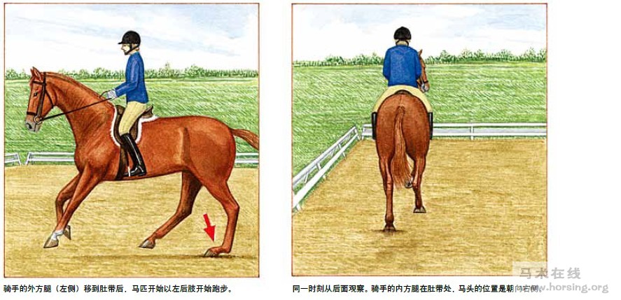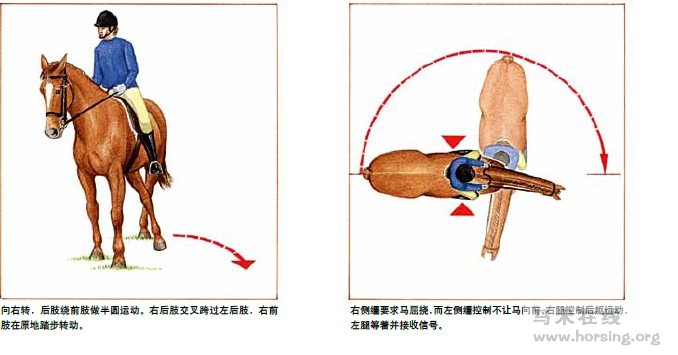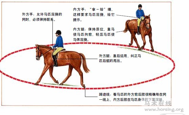 對騎手而言任何的模糊要求都會導致不易覺察到的不服從。 騎手要想做好圈程必須在起始點前做幾步準備。 騎手確認馬匹在圈程方向上屈撓,使用內方腿和內方韁的同時,要保持好外方韁的聯(lián)系。這些都是很微妙的輔助。 在進入圈程的起始點,騎手應很清楚地注視他所行進的方向,增加內方腿和內方韁的輔助。 外方韁扮演著一個很重要的角色,開始做圈程時如果外方韁是松的,圈程就不夠精確。然而如果騎手沒有給出外方韁允許馬匹的脖頸向內側屈撓,那么馬匹不能做出正確的屈撓。 一旦圈程開始,騎手只須保持向前的動力,馬匹正確的屈撓以保持所行路線是圓的就可以了。 馬匹經(jīng)常逃避這種柔軟性練習,例如:不屈撓它的身體,甩出它的后半肢。 在肚帶后的外方腿糾正隨時發(fā)生的問題,如后軀的甩出等。 馬匹應該在左圈程和右圈程上同等工作。特別注意的是在換方向時馬體應回到正直, 在開始另一方向圈程時馬匹應該在新的方向上屈撓。 盡管很多馬匹有一側是僵硬的,他們必須與外方韁保持好聯(lián)系,不應該一側比另一側屈撓得多。 應避免發(fā)生的錯誤: 外偏:當馬匹向內方屈撓太多時,它的外側肩就會向外甩。 糾正錯誤:與外方韁有更多的聯(lián)系,外方腿有更穩(wěn)定的輔助。 內偏:當馬匹向外方屈撓太多時,就會倒向內側。增加內方腿輔助的力度,輕輕地拿- 給內方韁。 內偏:馬匹向外方屈撓,騎手的重心在馬匹的內方肩。騎手更應使用更有力的輔助來改變這種錯誤。 定前肢旋轉 通常定前肢旋轉是騎手學習的第一個橫向運動。它是一個很重要的練習,這也是騎手第一次相對獨立運用腿和手。 從立定開始做定前肢旋轉,離開蹄跡線或圍欄至少1.5 米,給馬匹旋轉的足夠的空間。 理論上,馬匹立定站好,朝蹄跡線方向轉動,它的內方(蹄跡線一側)前肢踏步轉動,它的后肢繞前肢做半圓動作,一后腿交叉跨過另一后腿。馬應該是:向所轉的方向屈撓,保持慢步的節(jié)奏,但不要向后邁出。 向右側做定前肢旋轉,騎手從左韁開始。遠離蹄跡線1.5 米處,注意力集中,四肢平穩(wěn)立定站好,用內方(右側)韁要求馬匹有輕微的屈撓。(當向右轉時,馬的右側就變成新的內方)。 外方韁控制不讓馬匹向前,但允許有輕微的屈撓。內方腿在肚帶后要求后軀移動。外方腿再向后,必要時控制馬的后肢甩出。 當轉彎完成時,應立即使用讓馬向前的輔助。 騎手應感覺到,騎手控制著馬的肩并保持直到用腿控制馬的后軀完成換方向為止。 |