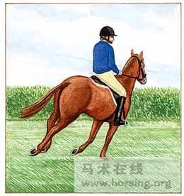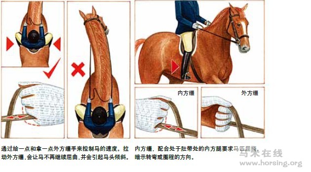 腿所放的位置與用法不同就會產(chǎn)生不同的效果。 為讓馬有更好的動力和向前的欲望,在腿的原有位置快速有力地靠擠壓一下。 讓馬屈撓(彎曲馬匹的身體)腿很穩(wěn)定地與馬體兩側相應位置保持聯(lián)系。 再向后(在肚帶以后)果斷地靠馬一下,指示讓它發(fā)動跑步。 再向后(在肚帶以后)和馬匹體側保持聯(lián)系,有利于控制馬的后軀運動。 與韁的聯(lián)系必須是連續(xù)不間斷的。使用韁的輔助時,無論單雙韁均應用“拿- 給”握住-放松手指的方法。 馬頭的動作和手的動作應當是鏡像關系,慢步和跑步時,馬頭會經(jīng)常來回反復地移動??觳綍r,也允許有一些不規(guī)律的動作。馬匹也會向左、向右屈撓,必須允許這樣的動作,但是不要丟掉與韁的聯(lián)系。 手和腳總是配合使用。但不要忘記黃金原則——“腳先于手”。 馬匹的屈撓 騎手應完全理解經(jīng)常用到的術語,“內方”“外方”等。 當馬匹向右側行進時,術語“內方”是指馬體的右側,“外方”是指馬體的左側。 騎手要求馬匹向內側屈撓,身體沿著曲線移動。如果圈程很大,馬匹的屈撓是輕微的;當圈程縮小時,屈撓明顯變大。 同樣的,馬匹必須朝向轉彎的方向屈撓。 內外方韁,內外方腿的輔助是經(jīng)常用到的術語,騎手必須很清晰地理解這些術語,就像區(qū)分左、右一樣清楚。 當馬匹向右側行進時,即使馬匹沿長長的直直的場地行進同樣被看作是“在右側韁上”行進,馬匹的右側就是內方。 內方腿在肚帶處,增大壓力使馬屈撓。輕輕給一點“拿- 給”內方韁,使馬匹柔軟地向內側屈撓。 外方韁是很重要的,它支持內方韁的工作。適度的聯(lián)系防止馬的頸部過分向內側屈撓。必要時,外方腳向后靠一下,控制馬匹的后軀向外甩出。 理論上講,馬匹應當接受比內方更韁穩(wěn)定的外方韁接觸。當它進步時,騎手才會更充分理解外方韁的價值。 騎手和馬匹的肩應是平行的。(自上而下)騎手和馬匹的髖應是平行的。 跑步的輔助 馬匹在左跑步和右跑步時,四肢落地的順序是不同的。騎手應充分理解以便正確運用跑步輔助。 當馬匹向右行進時,首先是左后蹄著地,然后是右后和左前蹄一起著地,最后是右前蹄著地。最后著地右前肢稱為“領先腿”。當馬匹向左側跑步時,所有順序是相對應的,它的左前肢就是“領先腿”。 對于騎手和馬而言,以指定腿在一處拐彎前跑步是很容易的。 開始右跑步時,騎手以右韁做快步,當接近右轉彎處,騎手用內方腿和內方韁正確地要求馬匹屈撓,柔軟地坐到鞍上,外方腳向后到肚帶后,用腿靠一下馬,訓練過的馬匹很容易直接發(fā)動跑步。 騎手不應失去與韁繩保持的聯(lián)系,否則馬匹跑得更快或失去平衡。騎手須控制自己不前傾,不低頭檢查自己的領先腿是否正確,這樣會使馬失去平衡,騎手越早知道依靠感覺平衡越好。 “錯誤跑步”的馬匹四肢落地順序混亂時,騎手是很不舒服的,也很容易感覺到。騎手應該重新做快步,然后跑步。 轉彎和圈程 提高馬的柔軟性,可以做各種各樣的圈程、轉彎、曲線運動。如果騎手正確地要求馬匹,這些練習會有很大的價值。 圈程騎乘,騎手必須決定兩件事情:
