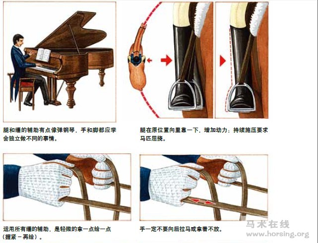 發(fā)展更好的輔助 一旦最基本的停止、啟動和轉彎指令被理解并運用得當,對騎手而言就需要發(fā)展新的輔助詞匯。 只有當騎手擁有了穩(wěn)定的騎坐,良好的平衡,內心的自信,他才可以進一步發(fā)展輔助。 當騎手可以自然協(xié)調地與馬配合,完成不同的動作時,他就應該開始發(fā)展更為精確的輔助。 手必須學會彼此獨立的工作,以不同的方式工作,同時腿也必須獨立工作。剛開始時是困難的。 腿輔助的兩種形式: