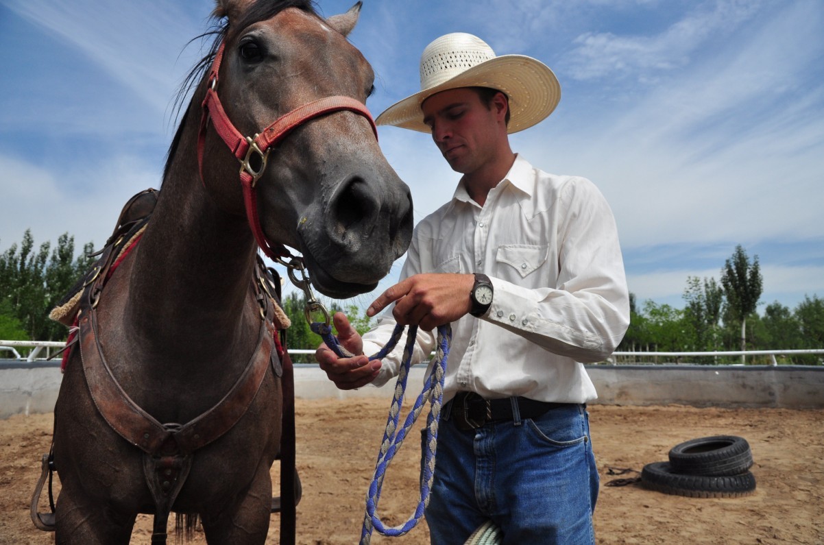 當(dāng)你剛開(kāi)始學(xué)習(xí)調(diào)訓(xùn)一匹生馬的時(shí)候,首先你要選擇一匹個(gè)性溫和且樂(lè)意學(xué)習(xí)的馬。所以我們從馬房選擇了一匹已經(jīng)較為穩(wěn)定的馬匹來(lái)作為教學(xué)示范。這是一匹美國(guó)夸特馬,也是牛仔們?cè)诠ぷ髦凶畛R?jiàn)的馬種,它的體格粗壯、肌肉厚重、外形緊湊,以擅長(zhǎng)短距離沖刺而著稱??涮伛R性格敏感而溫順,它將非常樂(lè)意配合你完成一系列的訓(xùn)練。 準(zhǔn)備工作 準(zhǔn)備工作在這里顯得尤為重要,你必須預(yù)先整理好需要用到的馬具,包括草籠頭、牽馬繩、汗屜、西部水勒韁及西部鞍。選擇一個(gè)合適的場(chǎng)地——一個(gè)圓形的調(diào)教圈(直徑)就是不錯(cuò)的選擇。馬是群居動(dòng)物,對(duì)周圍的環(huán)境很敏感,如果場(chǎng)地周圍有其他自由活動(dòng)的馬匹則可能會(huì)影響調(diào)訓(xùn)計(jì)劃,盡可能找到一個(gè)相對(duì)安靜、安全的地方,并將準(zhǔn)備好的汗屜、水勒及西部鞍置于場(chǎng)地中央。 由于現(xiàn)在沒(méi)有適用的繩索,我選擇了很普通的草籠頭來(lái)代替用繩索打的籠頭,這同樣很好用。將馬匹打理干凈后帶進(jìn)場(chǎng)地,為它戴上護(hù)腿,防止它在訓(xùn)練中受傷。 “介紹”鞍具 你在調(diào)教圈內(nèi)要做的第一件事,就是向馬匹“介紹”鞍具。馬匹對(duì)于顏色鮮艷、造型奇特的鞍具會(huì)相當(dāng)警覺(jué),此時(shí)你需要引導(dǎo)它走近鞍具,同時(shí)安撫它,消除它的恐懼。 接下來(lái),你可以動(dòng)作緩慢的拿起汗屜,站在馬的左側(cè),像我這樣,用汗屜輕輕拍打馬的身體。如果它反應(yīng)激烈,那么停下動(dòng)作安撫它,然后繼續(xù);慢慢地它會(huì)接受這樣的輕拍,這時(shí)就可以將汗屜放到它的背上。再到馬的右邊做同樣的動(dòng)作,直到可以將汗屜放在它背上為止。 當(dāng)馬匹接受汗屜時(shí),我們就可以進(jìn)行下一步——從馬的左側(cè)將鞍子直接放到汗屜上,當(dāng)然,動(dòng)作還是要輕柔。如果是小馬,有的可能就這樣安靜的站著,有的可能會(huì)跳,想甩掉鞍子,或者不安靜地扭動(dòng)身體,這種情況都是很正常的。我們直接將鞍子放上去是為了讓馬匹知道,這個(gè)重量它是可以承受的。它很聰明,當(dāng)感覺(jué)背上的東西對(duì)自己沒(méi)有任何威脅時(shí),它就會(huì)慢慢去習(xí)慣。這時(shí)可以扣起肚帶,但不必太緊。 解開(kāi)牽馬繩,讓馬匹在調(diào)教圈里活動(dòng)一下。你需要利用牽馬繩來(lái)趕圈,讓它習(xí)慣帶著鞍子運(yùn)動(dòng),左右里懷各幾圈,同時(shí)嘴里聲音,使它注意力集中,并能理解你動(dòng)作的意義——讓它動(dòng)起來(lái)。 清楚指令 馬匹會(huì)很快適應(yīng)鞍子的重量,停止趕圈,讓它自己安靜下來(lái),接下來(lái)我們教它一些簡(jiǎn)單的指令。想要抓住它,你可以緩緩靠近,注意它的眼睛是否在觀察你,如果它看你,那么你就往后退一些,如果它不看你,就繼續(xù)靠近。它在觀察你的舉動(dòng)是否對(duì)它有危險(xiǎn),當(dāng)它完全信任你時(shí),就可以抓住它的籠頭,帶上牽馬繩。 我現(xiàn)在將要教你做幾件事,注意這些動(dòng)作之間的聯(lián)系: 站在馬匹的左側(cè),雙手拿著牽馬繩,往它后方走,同時(shí)左手輕輕拉一下繩就松,重復(fù)幾遍,右手持繩頭輕拍它的身體。 這樣做的目的是讓它明白指令并且向左轉(zhuǎn)。由于牽馬繩很短,它只能繞著你走,看起來(lái)有些像是原地轉(zhuǎn)圈,如果它左側(cè)做的很好,那么右側(cè)也需要同樣的練習(xí)。 訓(xùn)練馬匹做交叉步伐有些類似上面的動(dòng)作,請(qǐng)注意: 此時(shí)你可以站在馬匹的右邊,雙手輕拍它的頸部,這時(shí)右手較左手稍高,好讓它的眼睛注意到你的動(dòng)作,左手可以拍著它的頸部并稍用力將它往一邊推。 馬匹擁有長(zhǎng)而靈活的頸部,它會(huì)將頭扭向左側(cè)并往左側(cè)邁步,注意它的前肢是否做到了交叉步伐,如果它做的很好,撫摸它獎(jiǎng)勵(lì)它,并且換邊再做幾次,讓它清楚你這樣做的目的是在教它新的步伐。 方向訓(xùn)練 打圈是教會(huì)馬匹識(shí)別方向指令的一個(gè)很直接的舉措,動(dòng)作和我們之前讓它原地轉(zhuǎn)圈有些類似: 站在它的右側(cè)面對(duì)它,右手持牽馬繩(稍放長(zhǎng)一些,約一米),左手較右手更高,好讓馬匹注意到后方你的動(dòng)作,這時(shí)拿著繩頭向它的后軀輕輕揮動(dòng)一下,口中發(fā)出“嘖嘖”的聲音。 馬匹會(huì)明白你是要它向前,但由于你的牽引,它只能順時(shí)針繞著你走。另一側(cè)用同樣的方式做幾次,讓馬匹知道你的動(dòng)作和聲音是要它有所行動(dòng),是前進(jìn)的指令,而繩索正是引導(dǎo)它前進(jìn)的方向。 這是訓(xùn)練一匹生馬時(shí)你必須要做的事情,并且要反復(fù)去做,令馬匹印象深刻。當(dāng)你騎在馬背上的時(shí)候,你會(huì)需要讓馬匹往各個(gè)方向去——而這個(gè)訓(xùn)練的目的正是教會(huì)馬匹不管是向左右轉(zhuǎn)、前進(jìn)還是退后,它都能夠服從。 當(dāng)馬匹安靜的站在你身邊時(shí),它會(huì)自覺(jué)尊重你們之間這樣的一個(gè)距離,同時(shí)注意你的指令,隨時(shí)愿意服從你去行動(dòng)。你不必緊緊地抓住牽馬繩并將繩子收得很短,因?yàn)槲医棠愕氖亲岏R能