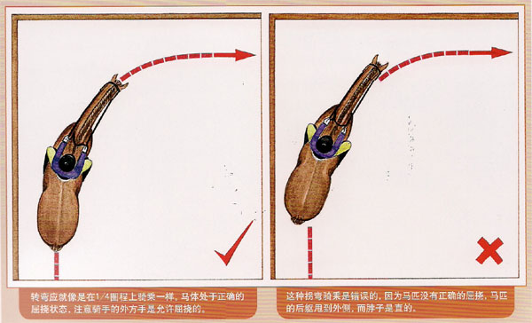 提高馬的柔軟性,可以做各種各樣的圈程、轉(zhuǎn)彎、曲線運(yùn)動(dòng)。如果騎手正確地要求馬匹,這些練習(xí)會(huì)有很大的價(jià)值。圈程騎乘,騎手必須決定兩件事情: 1)圈程起始點(diǎn)的確切位置。 2)圈程的大小。 對(duì)騎手而言任何的模糊要求都會(huì)導(dǎo)致不易覺察到的不服從。騎手要想做好圈程就必須在起始點(diǎn)前做幾步準(zhǔn)備。騎手確認(rèn)馬匹在固程方向上屈撓,使用內(nèi)方腿和內(nèi)方韁的同時(shí),要保持好外方韁的聯(lián)系。這些都是很微妙的輔助。在進(jìn)入圈程的起始點(diǎn),騎手應(yīng)很清楚地注視他所行進(jìn)的方向,增加內(nèi)方腿和內(nèi)方韁的輔助。外方韁扮演著一個(gè)很重要的角色,開始做圈程時(shí)如果外方韁是松的,圈程就不夠精確。然而如果騎手沒有給出外方韁允許馬匹的脖頸向內(nèi)側(cè)屈撓,那么馬匹不能做出正確的屈撓。 一旦圈程開始,騎手只須保持向前的動(dòng)力,馬匹正確的屈撓以保持所行路線是圓的就可以了。馬匹經(jīng)常逃避這種柔軟性練習(xí),例如:不屈撓它的身體,甩出它的后半肢。在肚帶后的外方腿糾正隨時(shí)發(fā)生的問題,如后軀的甩出等。馬匹應(yīng)該在左圈程和右圈程上同等工作。特別注意的是在換方向時(shí)馬體應(yīng)回到正直,在開始另一方向向圈程時(shí)馬匹應(yīng)該在新的方向上屈撓。 盡管很多馬匹有一側(cè)是僵硬的,他們必須與外方韁保持好聯(lián)系,不應(yīng)該一側(cè)比另一側(cè)屈撓得多。應(yīng)避免發(fā)生的錯(cuò)誤: 1)外偏當(dāng)馬匹向內(nèi)方屈撓太多時(shí),它的的外側(cè)肩就會(huì)向外甩。糾正錯(cuò)誤:與外方韁有更多的聯(lián)系,外方腿有更穩(wěn)定的輔助。 2)內(nèi)偏當(dāng)馬匹向外方屈撓太多時(shí),就會(huì)倒向內(nèi)側(cè)。增加內(nèi)方腿輔助的力度,輕輕地拿~給內(nèi)方韁。 文/Joni Bentley,圖/Carole Vincer,譯/天星調(diào)良國(guó)際馬術(shù)俱樂部教練組 |