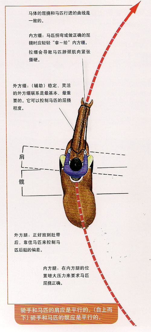 騎手應完全理解經(jīng)常用到的術語,“內(nèi)方”“外方”等。當馬匹向右側(cè)行進時,術語“內(nèi)方”是指馬體的右側(cè),“外方”是指馬體的左側(cè)。騎手要求馬匹向內(nèi)側(cè)屈撓,身體沿著曲線移動。如果圈程很大,馬匹的屈撓是輕微的;當圈程縮小時,屈撓明顯變大。同樣的,馬匹必須朝向轉(zhuǎn)彎的方向屈撓。