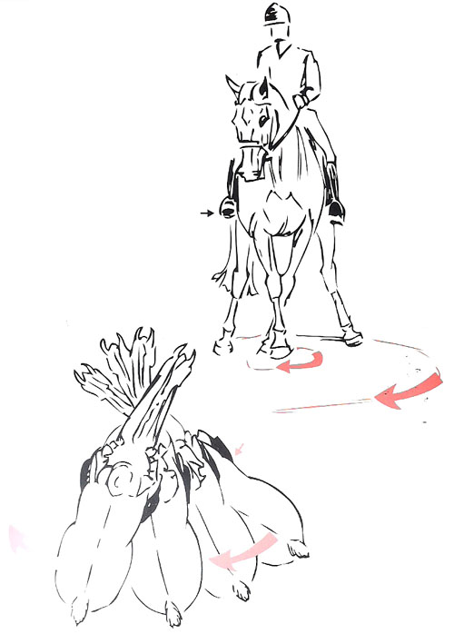 什么才是向馬匹介紹側(cè)向移動的最清晰目一最簡單的方法呢?那就是先教會它如何用前肢轉(zhuǎn)向。 從立定開始,通過讓馬匹與前肢成拱形,移動后軀,來教會馬匹回應(yīng)來自騎手內(nèi)方腿的壓力。馬匹會將左后腿斜對角交叉到右后腿前方,來完成這個動作。 旦掌握了這其中的技巧.馬匹便可以開始學(xué)習(xí)做來革由丁和肩向內(nèi)等側(cè)向運(yùn)動了。騎手也慢慢感覺到自己對馬匹轉(zhuǎn)向形態(tài),圈乘和圖形等動作完成的技巧大大提高了。 現(xiàn)在,找個場地中央的位置,相對兩邊要足夠大,可以自由轉(zhuǎn)彎。按照我下面所講的,讓我們用左腿告訴馬匹如何來側(cè)向移動。 首先來看下騎手的坐姿。確保騎坐平衡,上身挺直,重心朝下到腳后跟。因?yàn)槭且蛴覀?cè)移動,所以讓馬輕微向內(nèi)彎曲,騎手左手關(guān)節(jié)指向自己的右臀部,告訴馬匹你要的是左彎曲。同時,騎手左側(cè)坐骨和左腿略微下壓,約一硬幣厚度。 讓右側(cè)外方韁稍稍柔軟,給馬匹足夠空間,轉(zhuǎn)向右側(cè),右腿被動地輕放在馬匹身上,但同時又像一堵墻,阻擋馬匹臀部過度外閃或每次多走一步出來。 左側(cè)內(nèi)方腿放在肚帶后一點(diǎn),小腿擠壓,告訴馬匹要向右一步移動臀部,并與前肢成拱形。一旦,馬匹開始用左后腿移動第一步了,告訴它這就是你想要的側(cè)向運(yùn)動。在馬蹄懸在半空的瞬間,放松左側(cè)內(nèi)方腿,右側(cè)外方韁半減缺。馬匹正確的反應(yīng)是放下馬蹄,通過放正另外一只馬蹄來完成單步轉(zhuǎn)向。 由于主要是在進(jìn)行順從性練習(xí),在這里,不妨就立定,讓馬匹放松。我們總是希望馬匹對騎手腿的輔助能夠予迅速的反應(yīng),并不想馬匹不規(guī)整地去完成動作。休息3-5秒后,再重復(fù)步,每次不得超過到兩次。然后就放長韁,順著場地四周做自由慢步。慢步段后,再收起韁繩,回到場地中心,再來次,這次是要做向左轉(zhuǎn)向了。 當(dāng)騎手和馬匹都能夠順利地完成兩側(cè)轉(zhuǎn)向的時候,就可以按照下面的圖形.進(jìn)行蛇形上的反對彎曲練習(xí)了。 文/Leslie Webb,編譯/汪亞麗 |