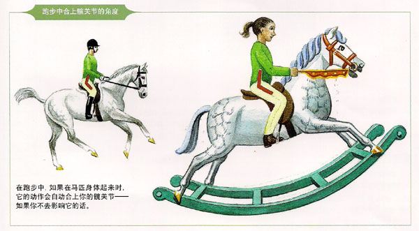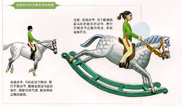 在下圖里你會看到小搖馬的跑步姿勢,小馬的背部是向下傾斜的,你身體的正面必須是放松的且像橡皮帶一樣伸展自如,可以說你把自己交給了馬。用氣球的想象作為輔助,把你的髖關(guān)節(jié)打開。打開膝關(guān)節(jié),把你的腿部重量卸到地上,要保持身體垂直,馬匹在你的兩腿之間,但你要感覺好像是站在地上。