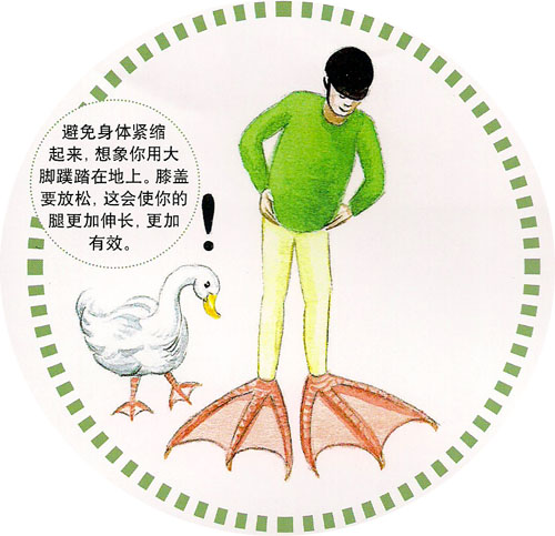 想象你的腳像鴨掌一樣又寬又長,來幫助你在騎馬跑步時腿部伸長、有效地動作。想象下如果你的腳趾變長了,變寬了,你的整個腳底就會展開在腳蹬上,甚至能到地上。