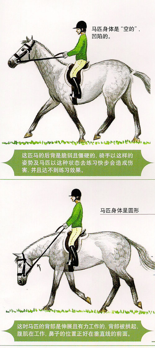 我們通常會(huì)看到騎手無止境地去做快步練習(xí),長時(shí)間的調(diào)教索練習(xí),騎手和馬匹雙方都很痛苦,并且動(dòng)作僵硬,馬匹背部下陷并向上抗銜,這是錯(cuò)誤的。如果繼續(xù)讓馬匹背部凹陷地工作的話,那是在傷害馬匹。一定要找出馬匹為什么會(huì)背部塌陷的原因?也許是你的動(dòng)作限制了馬匹,沒有讓馬匹用整個(gè)脊椎去工作,或者是馬匹對(duì)某些事物的煩燥。很可能是由于鞍具不合適(一般都是因?yàn)榘白犹?,或者馬匹的背部沒有自由得到運(yùn)動(dòng)時(shí)必需的力量與柔軟,以致無法拱起背部和支撐起你的重量。 看這兩個(gè)圖例,注意這兩匹馬的背部和肚子的外輪廓線有什么不同,第一匹馬的背部是下沉的(凹陷的),腹肌虛弱,不結(jié)實(shí)(人類也一樣)?,F(xiàn)在來分析第二匹馬,這匹馬的背部是向上拱的,并且在用腹肌(肚子)工作。 除非你的馬匹的工作狀態(tài)像右圖第二匹馬那樣,否則練習(xí)快步是毫無用處的。你需要作輕快步起立的原因,是讓馬匹后背輕松地拱起來,并且加強(qiáng)背部力量。 注意馬匹下巴以下的空間形狀,這個(gè)空間是非常重要的。因?yàn)轳R匹的脊椎下部肌肉越是伸展,馬匹的上輪廓線就會(huì)越伸長,身體就會(huì)越向上挺起,馬匹后肢就會(huì)更加好踏進(jìn),從而馬匹的身體就會(huì)更提升、更優(yōu)美。當(dāng)馬匹正確的外輪廓線建立好時(shí),馬匹就不會(huì)抗拒,這時(shí)馬匹在完成基本調(diào)教運(yùn)動(dòng)和變換時(shí)會(huì)更加有力地踏進(jìn)。馬匹會(huì)把工作重心轉(zhuǎn)移到后肢上,前肢的受力會(huì)減輕,動(dòng)作會(huì)輕揚(yáng)起來。 練習(xí)快步同樣要求正確的身體姿勢(shì),就如下列圖例所示那樣,要讓你整個(gè)身體的運(yùn)動(dòng)隨著馬匹的運(yùn)動(dòng),接收馬匹對(duì)你的支撐力和你給馬匹的壓力要盡量持平,檢查如下: (1)你的頭部是否指引著你去的方向? (2)你的髖部是否隨馬背部動(dòng)作自如運(yùn)動(dòng)? (3)你是否打開了你的所有關(guān)節(jié),并且在運(yùn)動(dòng)中起到了減振的作用? (4)你是否使用氣球假設(shè)去幫助你保持正確的姿勢(shì)? 把你髖部和腿部的重力卸到地面上,讓你的腿和髖關(guān)節(jié)完全跟隨馬匹,特別是馬匹肋部的動(dòng)作。你的腰部以上特別是你的肋部要打開——這樣可以讓騎手自己達(dá)到自我承載。 |