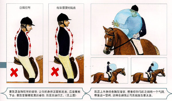 以下設(shè)計(jì)的圖例,是教你如何不緊張或無壓力地身體坐直,如果你是用胸帶動你的身體向上(像軍人姿勢),那么你的下背部將立刻變空,你將無法吸收馬匹運(yùn)動時產(chǎn)生的振動。